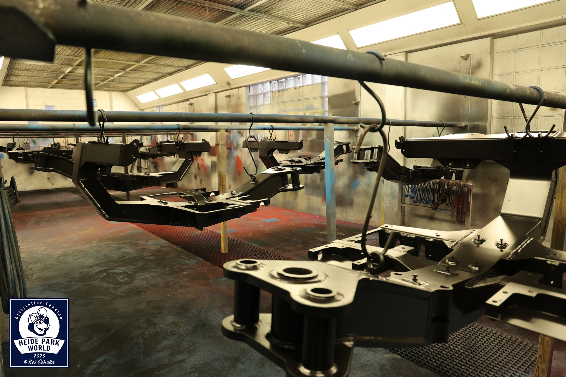 Als nächstes ging es über den Betriebshof in die Wartungshalle des Wing Coasters Flug der Dämonen. Hier konnte der Zug und seine Bestandteile einmal aus der Nähe und von unten bestaunt werden. Auch hier sind die Techniker aktiv am arbeiten, sodass beide Züge pünktlich in die Saison starten können.