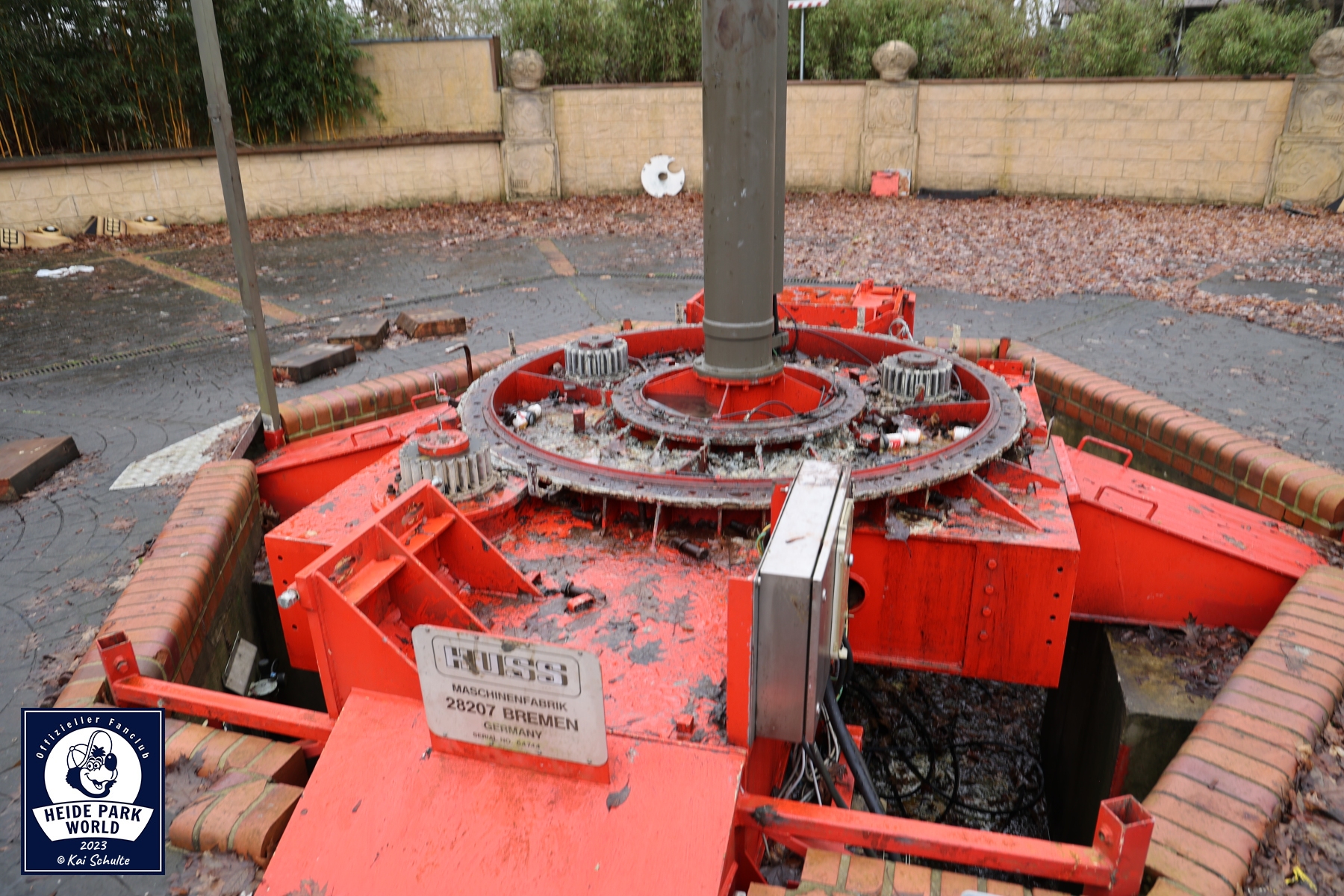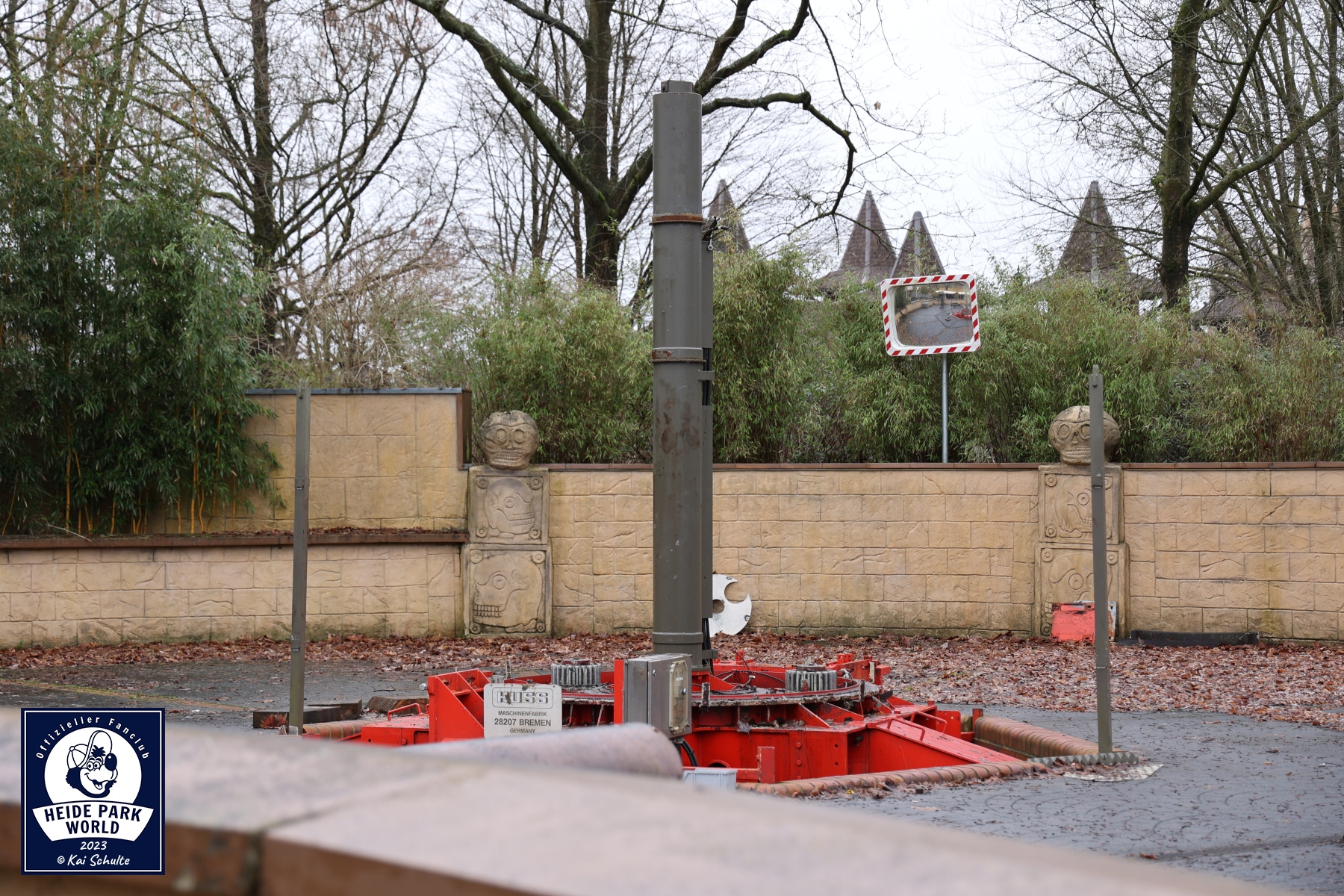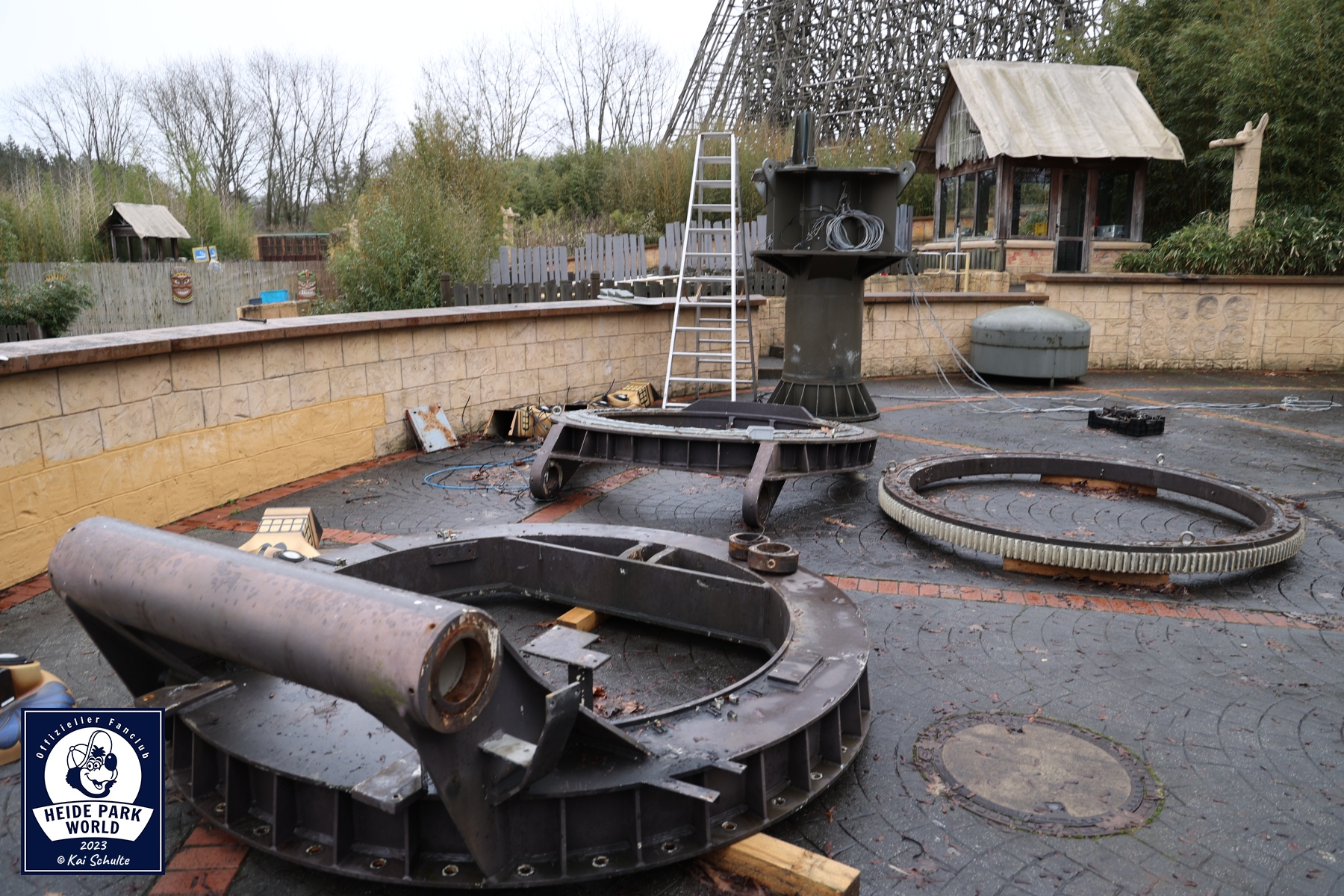 Zwischen Big Loop und Limit ging es weiter in den hinteren Heide Park Bereich. Im gefrorenen See spiegelte sich die Sonne, welche den Park in frühlingshafte Farben tauchte. Der nächste Stop war im Maya Tal. Dort konnten die Fans einen Blick auf Magic werfen, welcher aktuell noch in seine Einzelteile zerlegt ist. Bis zum Saisonstart soll dieser aber fertig und einsatzbereit sein. Marcel gab den spannenden Einblick, dass für den Zusammenbau u.a. noch ein Schwerlastkran von einer externen Firma benötigt wird. Für die komplette Sanierung von Magic wurden mehrere Tausend Euro investiert.
