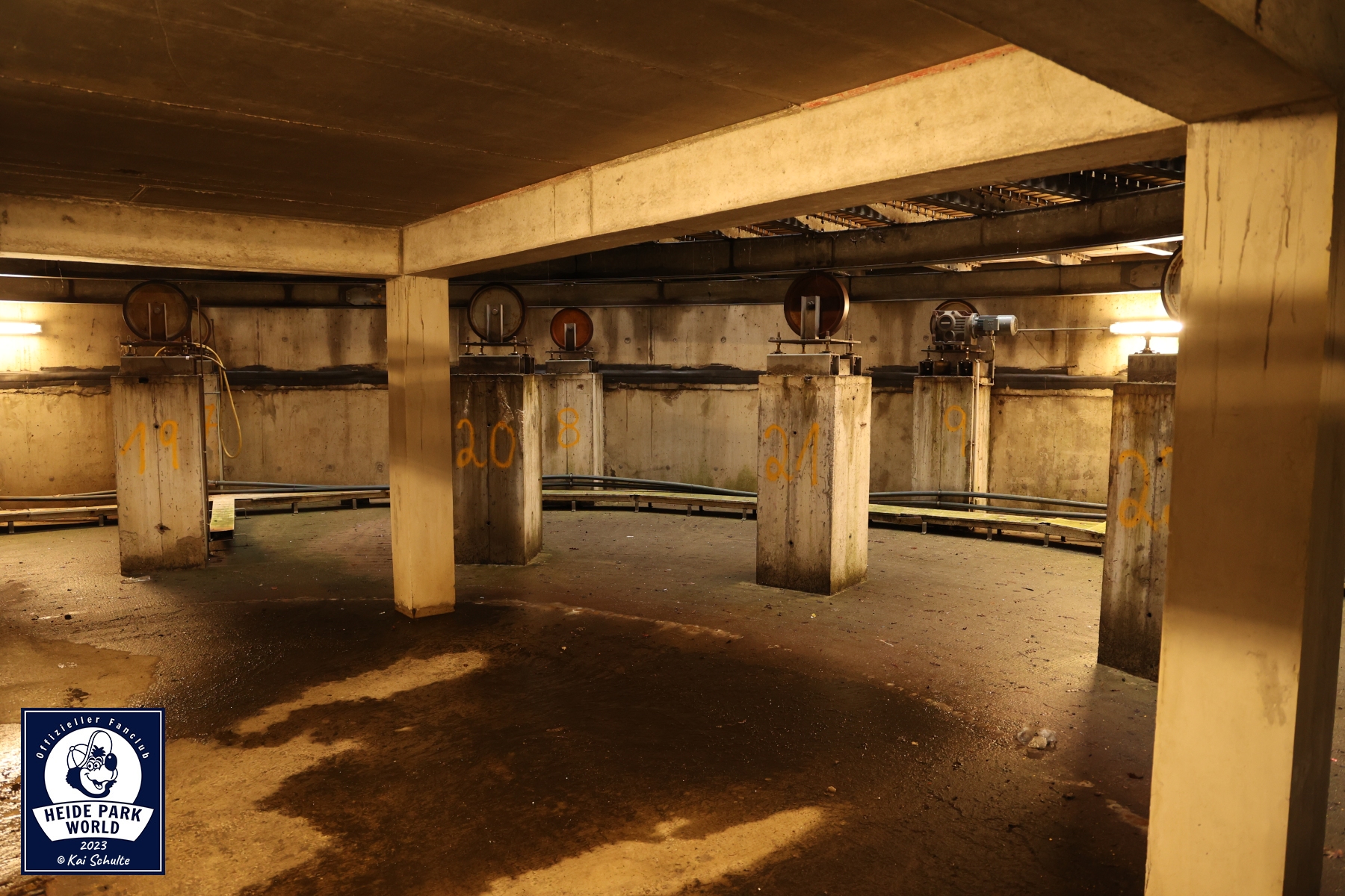 Anschließend zog die Gruppe weiter in Richtung Mountain Rafting. Versteckt zwischen Tannen wurde das Herz der Anlage, der Technikraum, den Fans einmal gezeigt. Die spannede Reise ging weiter zum Bedienerstand über der Drehplatte. Hier konnten die Teilnehmer*innen einen Blick auf die komplett wasserlose Anlage werfen und sich einen Überblick über das Bedienerpult verschaffen. Neugierige Blicke wanderten Richtung Tunneldurchfahrt, wo von außen Arbeiten zu erkennen waren. Was dort wohl passiert... ?