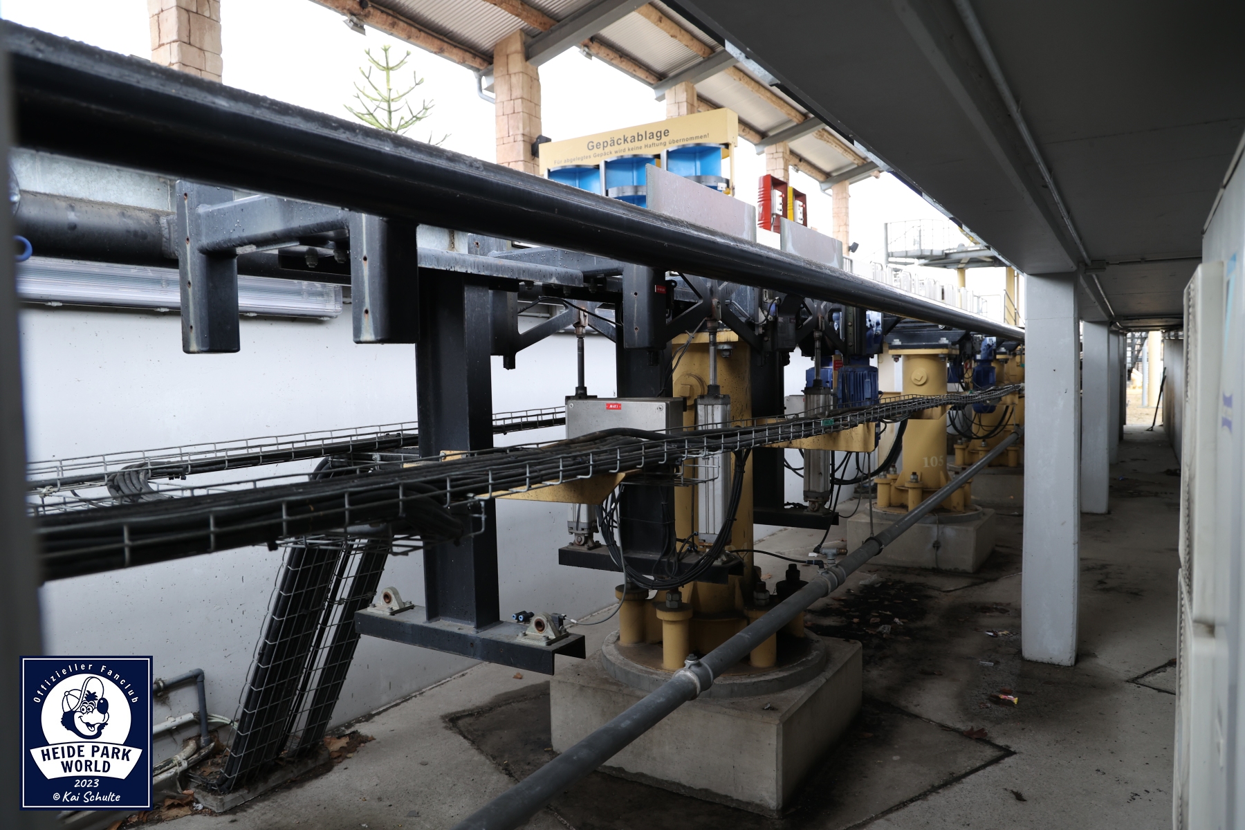 Weiter ging es in die Wüste der Lüneburger Heide. Genauer gesagt zu Desert Race. Das erste Ziel befand sich in der letzten Kurve des Coasters - die Wartungshalle. Dort konnte ein neugieriger Blick auf und unter den blauen Zug geworfen werden, welcher sich aktuell in den letzten Zügen der Prüfung befand. Unterhalb der Station und der Strecke ging es nun in den Innenbereich. Dort wurde uns ein spannender Einblick in den Hydraulikraum gewährt. Zwischen den meterhohen Tanks konnte auch das Seil des Catchcars bestaunt werden, dessen Wendepunkt sich mit im Gebäude befindet. Während der laufenden Saison ist ein Einblick aus Sicherheitsgründen leider nicht möglich. Marcel erklärte sehr ausführlich, wie Desert Race und der Abschuss funktionieren. Über den Catwalk entlang der Launch-Strecke ging es zurück in die Station, wo ein spannender Blick auf das Catchcar gewährt wurde.