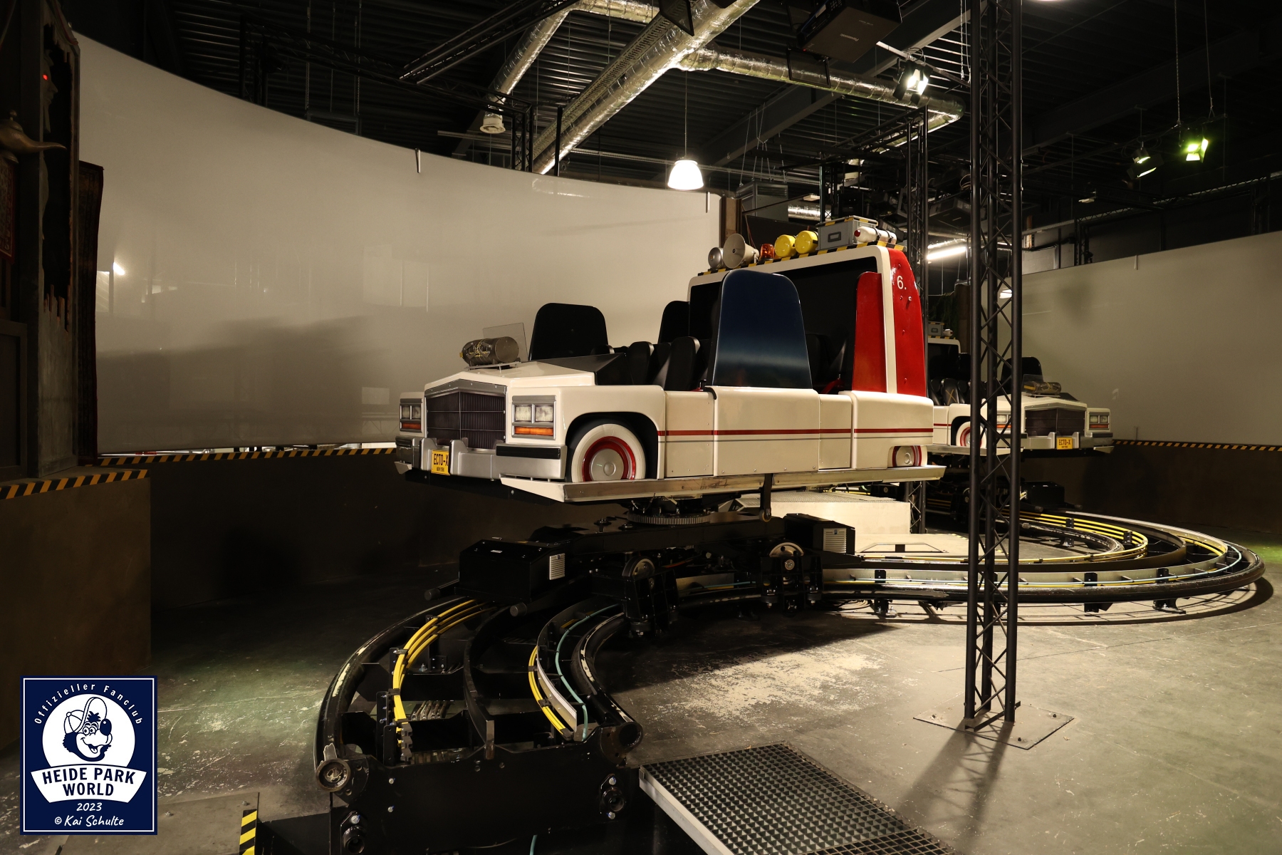 Die Reise ging weiter in Richtung Ghostbusters 5D. Den ersten exklusiven Einblick gab es in den "Waschraum" - also dort, wo die tausenden 3D Brillen täglich mehrfach für die Gäste gereinigt werden. Über einen Einstieg in der Station begann unsere weitere Reise entlang der Strecke. Hier konnte einmal aus der Nähe der QR Code bestaunt werden, welcher dem Computer meldet, wo im Streckenverlauf sich die Fahrzeuge befinden. Aufmerksame Fans konnten zudem versteckte Eastereggs in den Dekoelemten entdecken. Apropos Fahrzeug - mitten auf der Strecke befand sich eines der insgesamt neun Fahrzeuge und wurde gerade auf die Saison vorbereitet. Mit ausreichendem Sicherheitsabstand wurde uns gezeigt, wie dieses per Hand gesteuert werden kann.