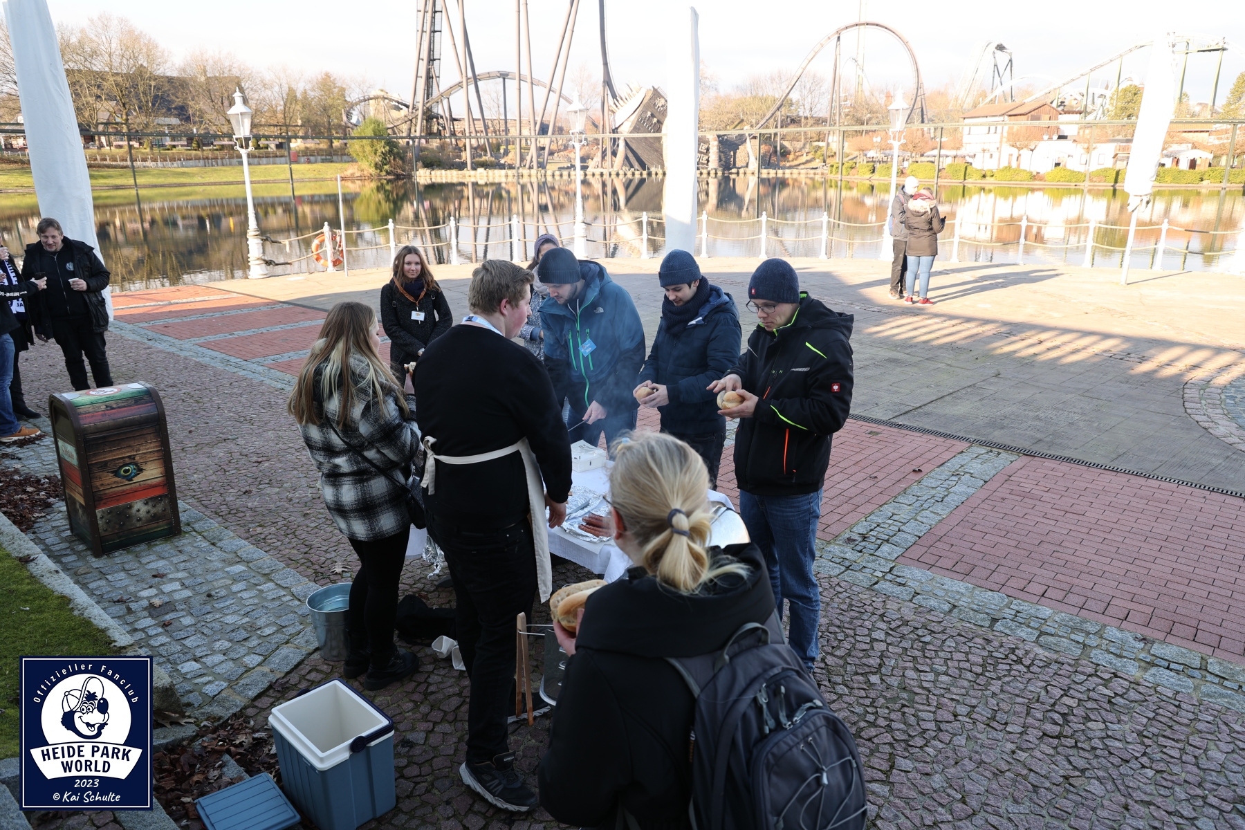 Wieder aufgewärmt ging es durch Obscuria weiter in den vorderen Parkteil, wo ein verlassener Eingangsbereich und ohne die fröhliche Musik die Teilnehmer*innen begrüßte, bevor die Reise weiter in Richtung Terrasse vom Mamma Rosas Pizza & Pasta ging. Dort haben wir für die Fans zur Stärkung fleißig gegrillt und Getränke zum Aufwärmen bereitgestellt. Bei einem leckeren Würstchen und Kinderpunsch oder Glühwein kam es zu spannenden Gesprächen unter den Teilnehmer*innen, bevor die Fantreffen sich langsam dem Ende neigten und alle gemeinsam über den Betriebshof den Park verließen.