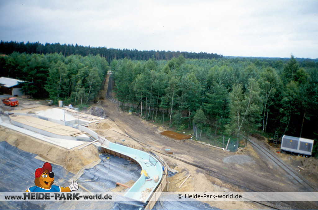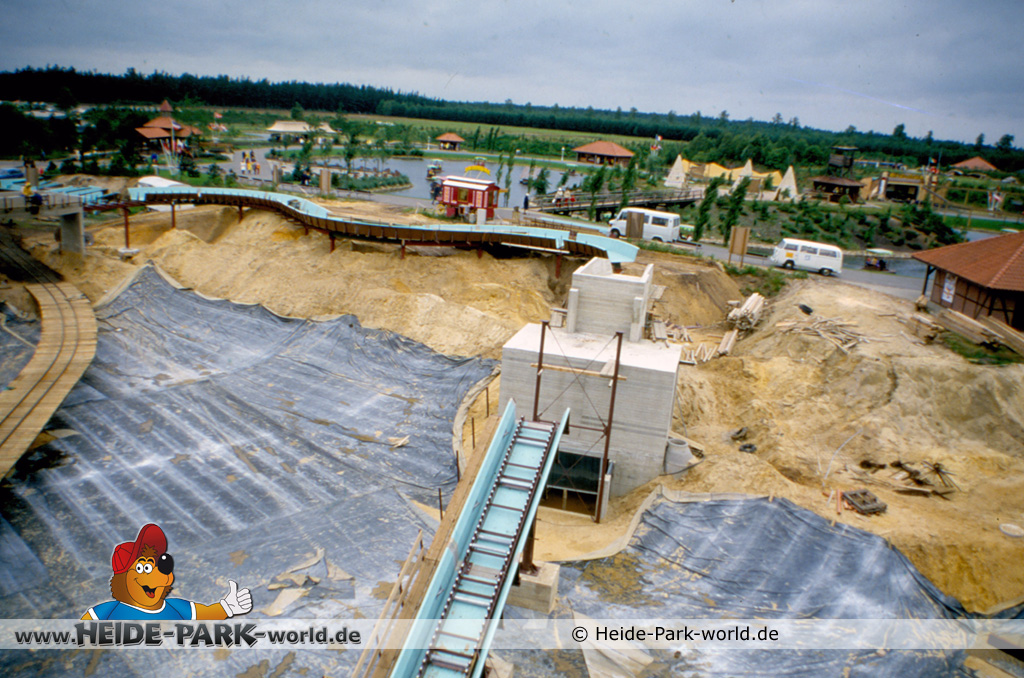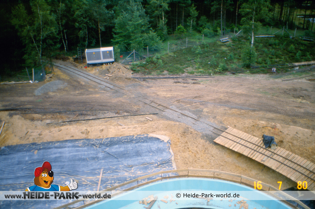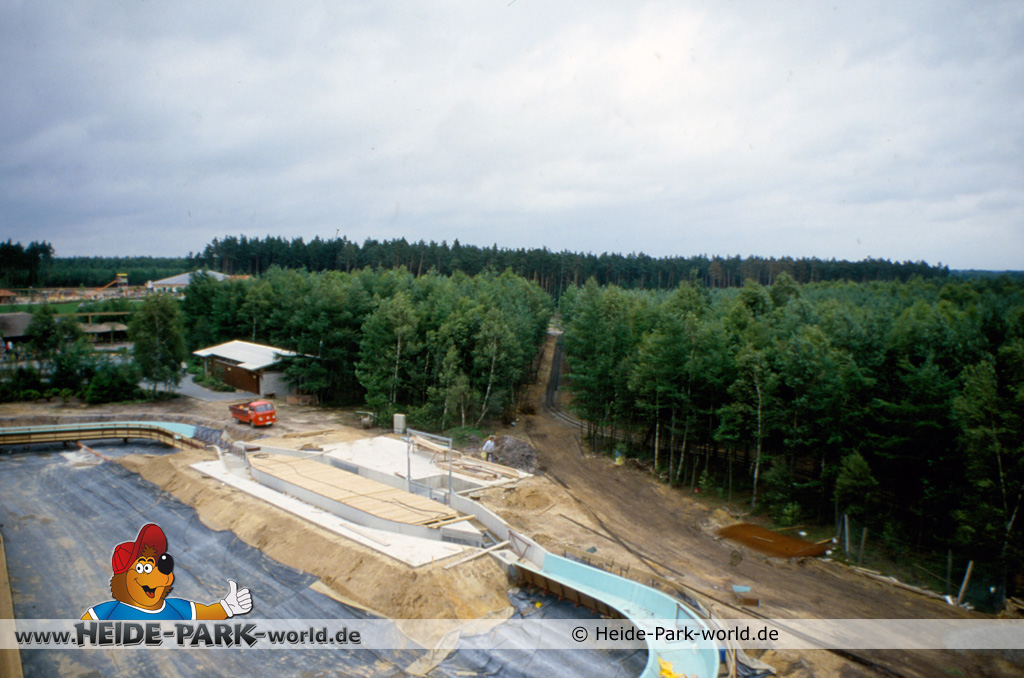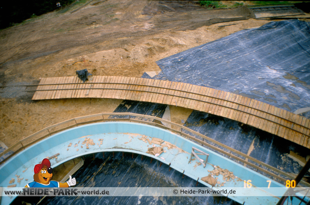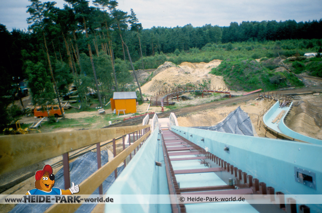 Teil 8 - Die Bahn ist wieder ein ganzes Stück gewachsen. Zahlreiche neue Rinnenelemente sind dazu gekommen. Auch die Station nimmt langsam Gestalt an. Im Gegensatz zu heute hatte sie damals zwei parallele Einstiege. Dies sollte vor allem im Sommer, wo viele Leute mit der Wildwasserbahn fahren wollten, die Kapazität erhöhen und somit die Wartezeit verringern.