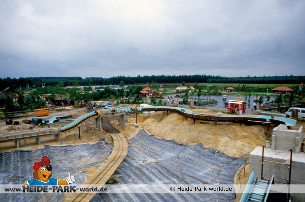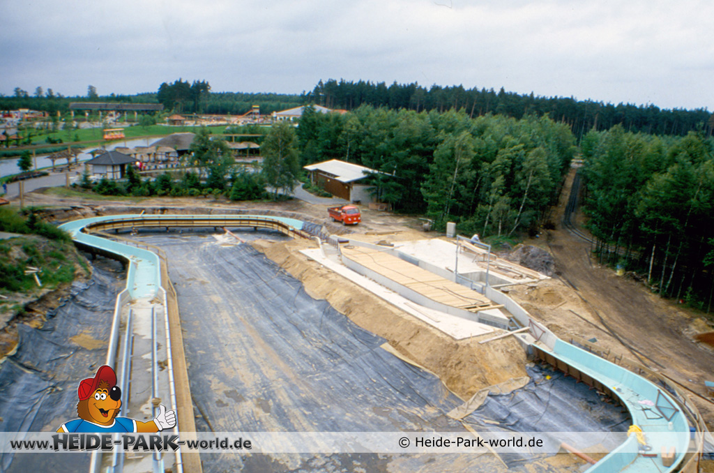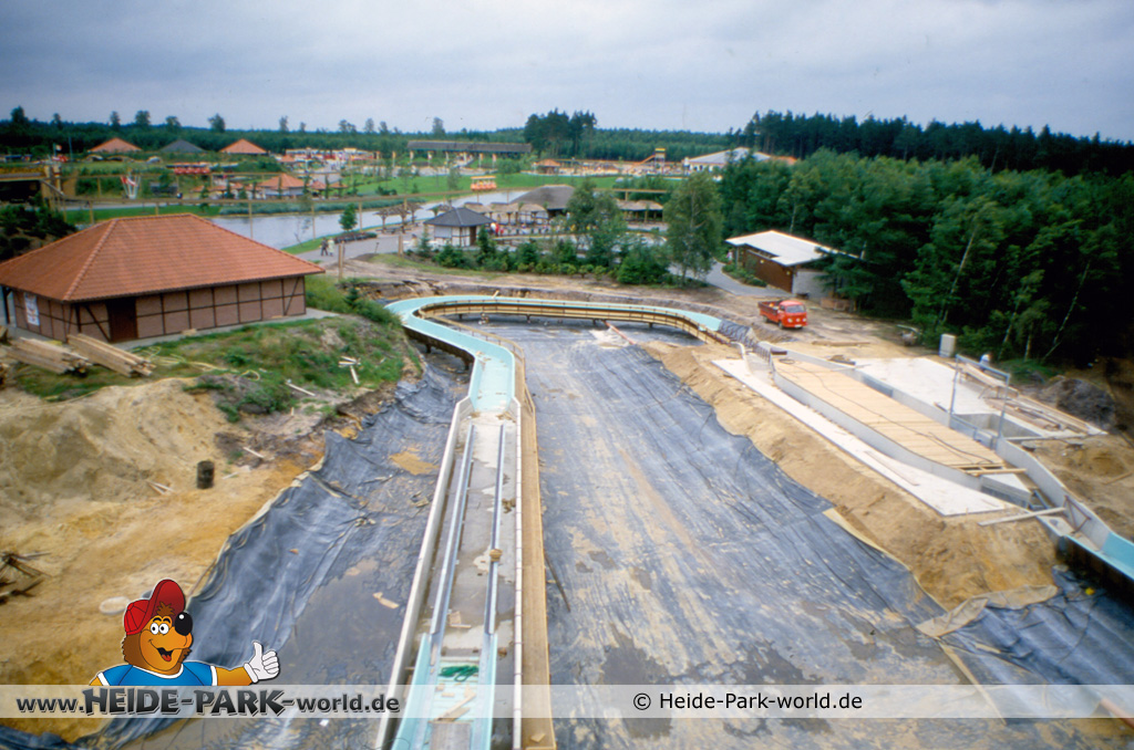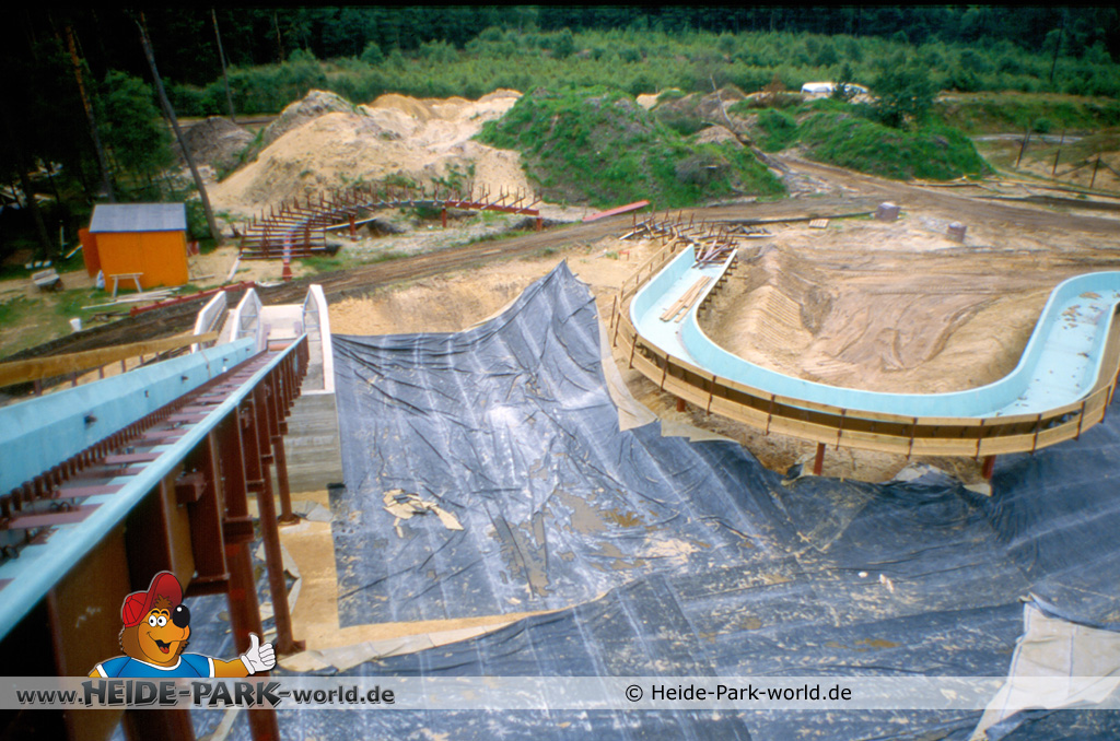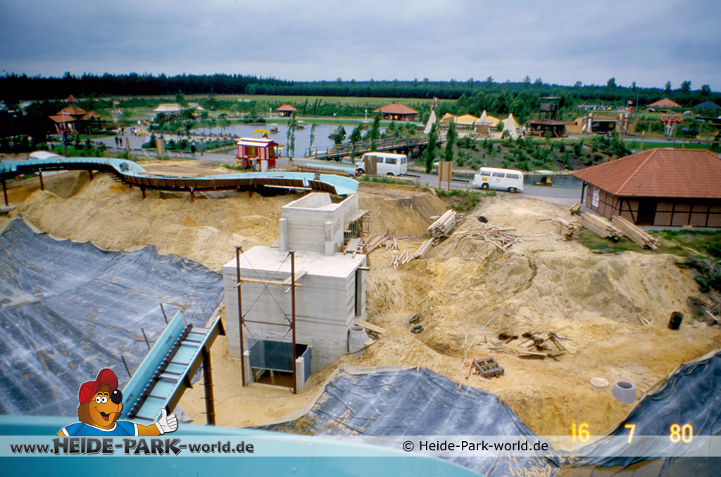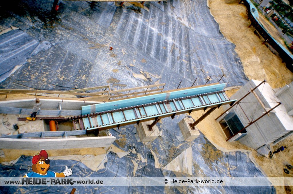 Teil 8 - Die Bahn ist wieder ein ganzes Stück gewachsen. Zahlreiche neue Rinnenelemente sind dazu gekommen. Auch die Station nimmt langsam Gestalt an. Im Gegensatz zu heute hatte sie damals zwei parallele Einstiege. Dies sollte vor allem im Sommer, wo viele Leute mit der Wildwasserbahn fahren wollten, die Kapazität erhöhen und somit die Wartezeit verringern.