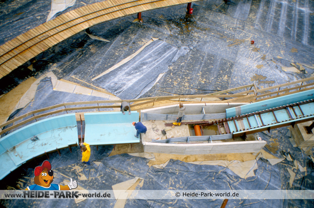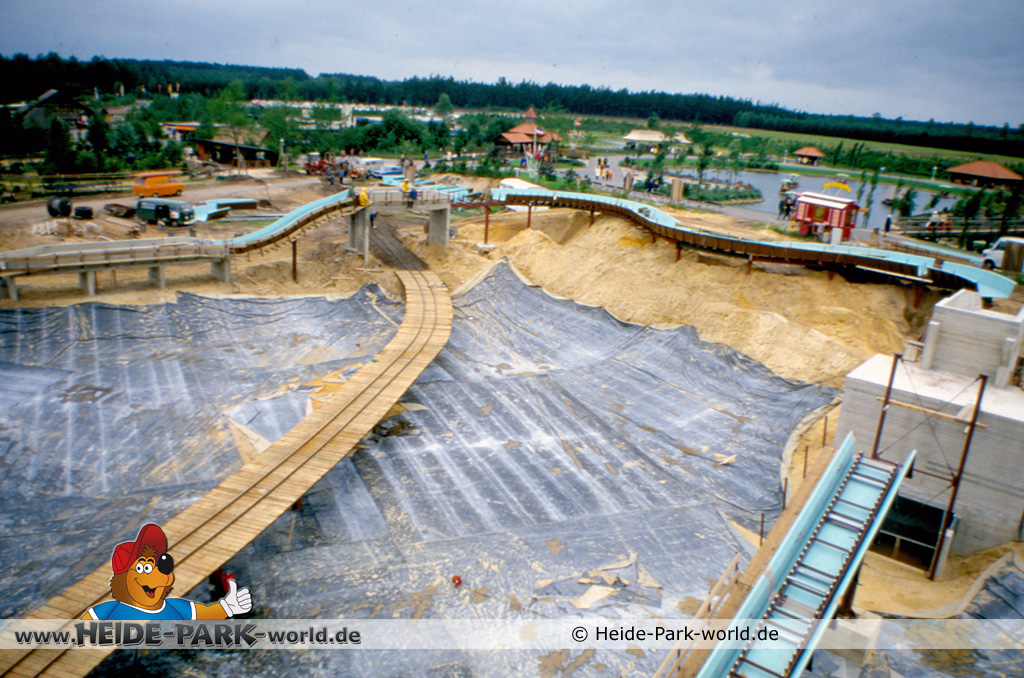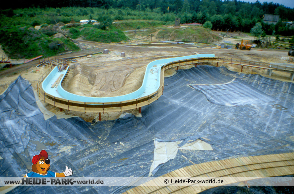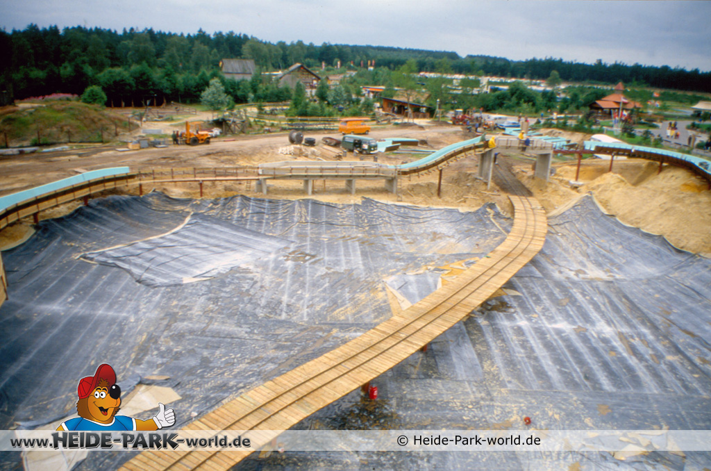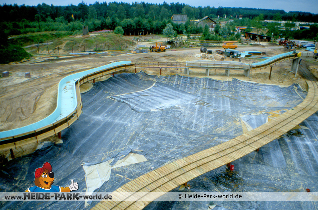 Doch dies erwies sich relativ schnell als nicht praktikabel. Es wurde umgebaut und auf "Ein-Kanal-Betrieb" umgestellt. Gut zu erkennen ist jetzt auch der zukünftige Streckenverlauf. Zentrales Element der Anlage wird ein See sein, der nach Parkschluss auch als Rückhaltebecken für das Wasser aus der Wildwasserbahn dienen wird. Dieser wurde jetzt mit Teichfolie ausgelegt.