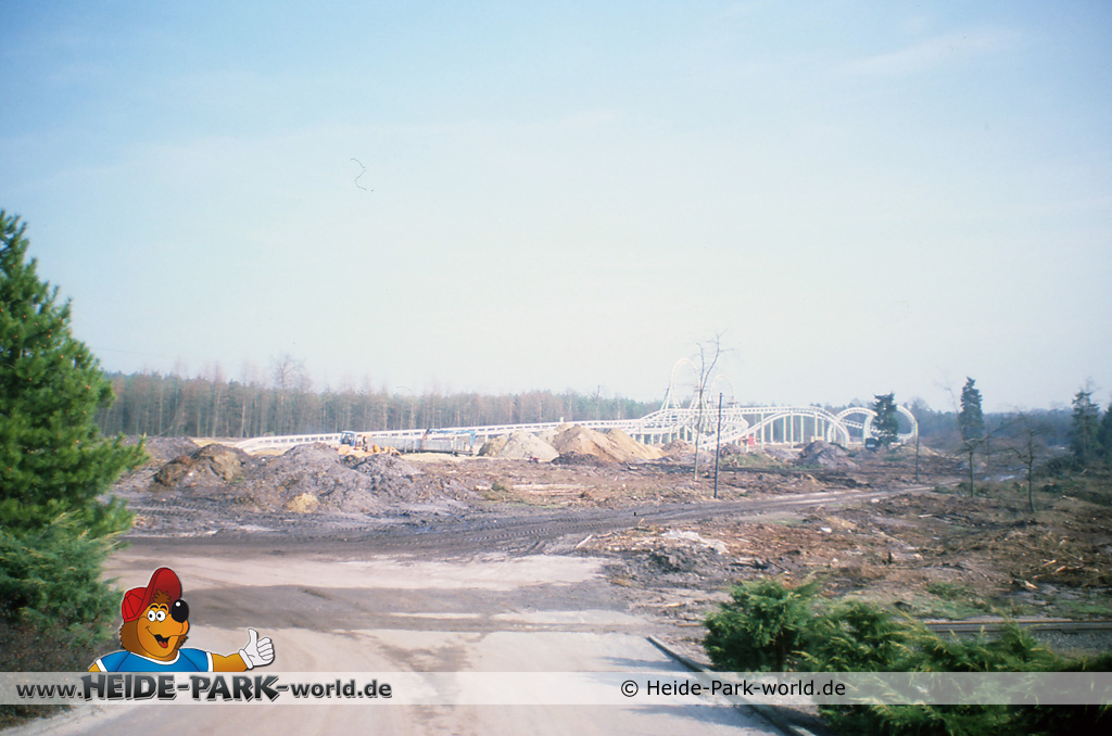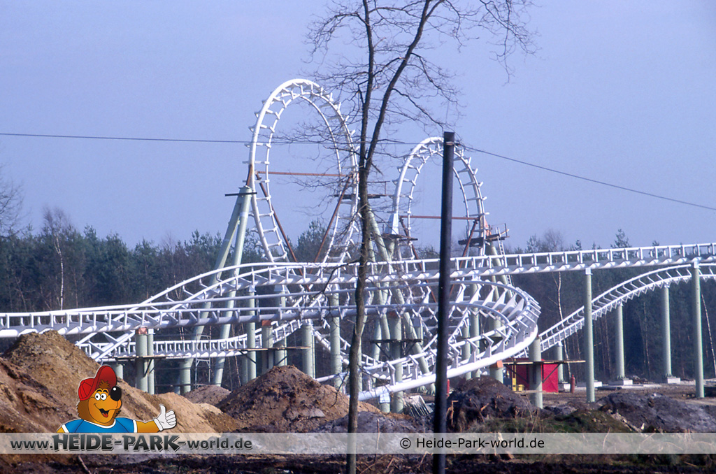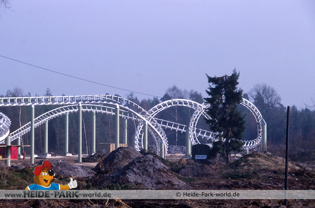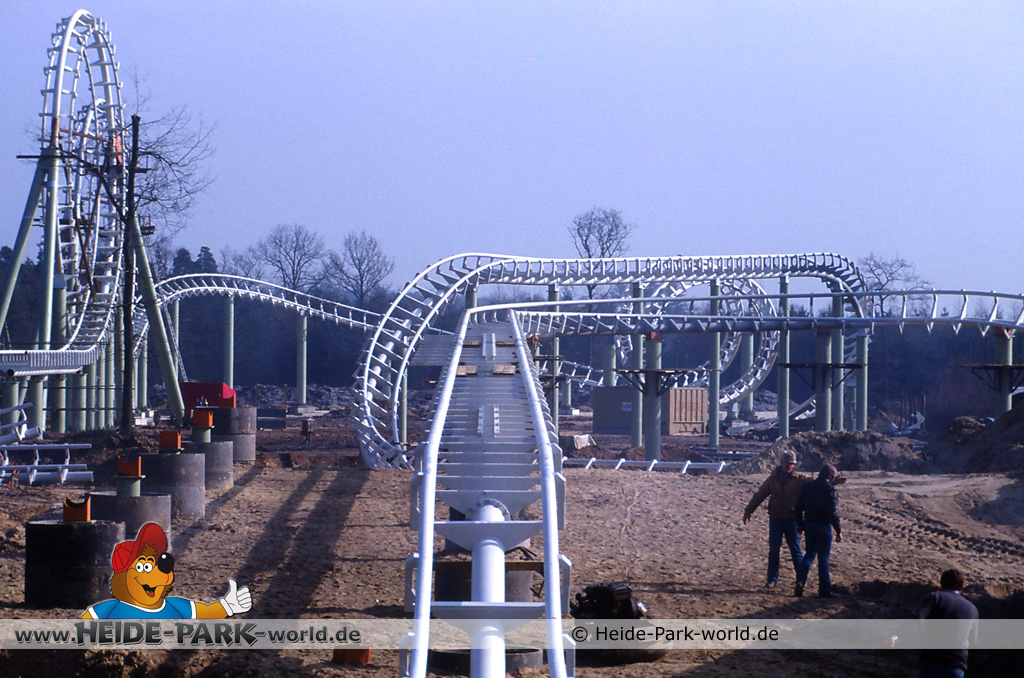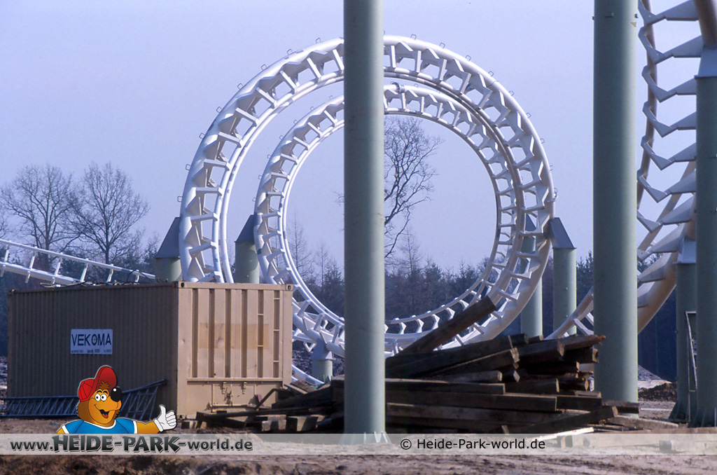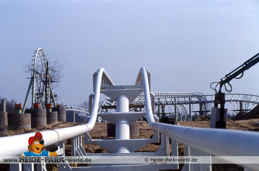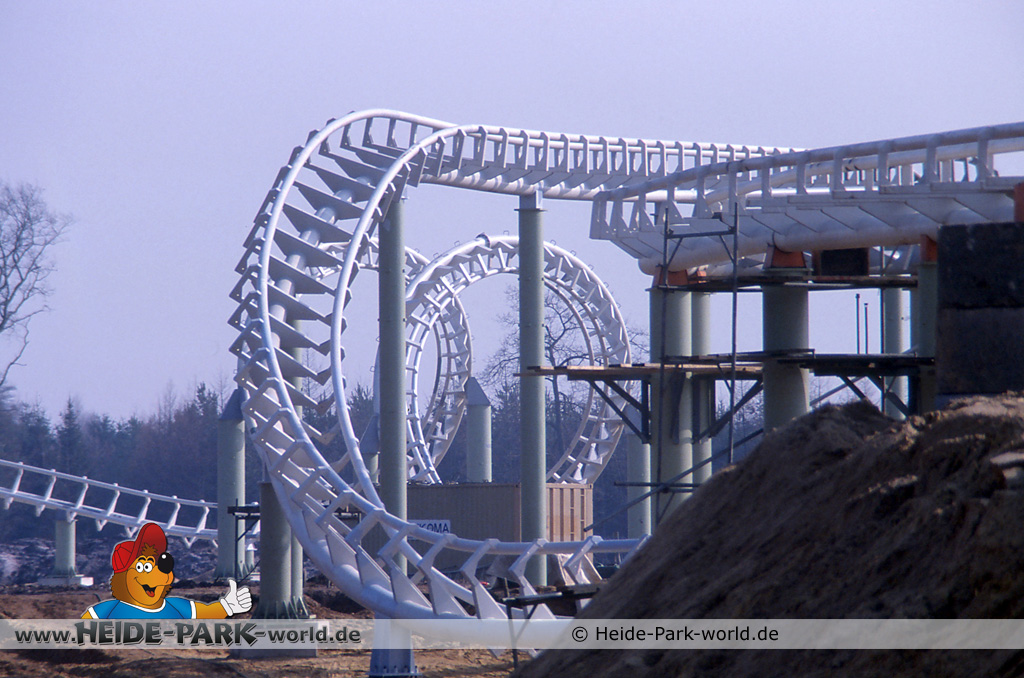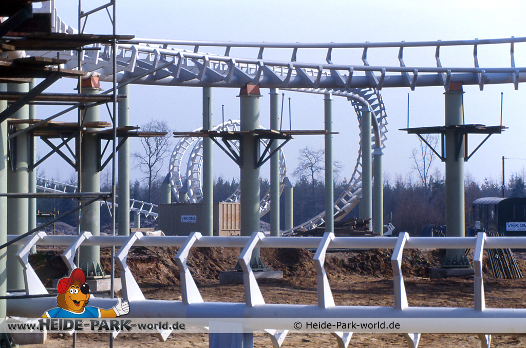 Auch hinter der Wendekurve der Bahn sieht es gut aus. Die beiden Korkenzieher sind fertig errichtet. Nun fehlt nur noch der Lift, welcher die Mitfahrer in 30 Meter Höhe transportiert.