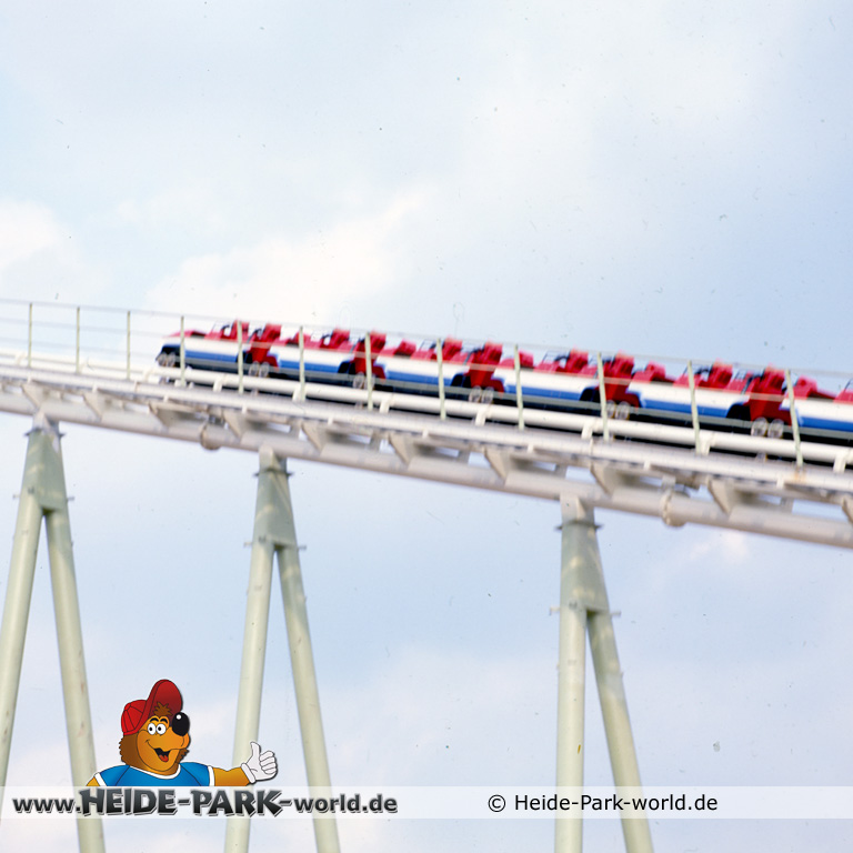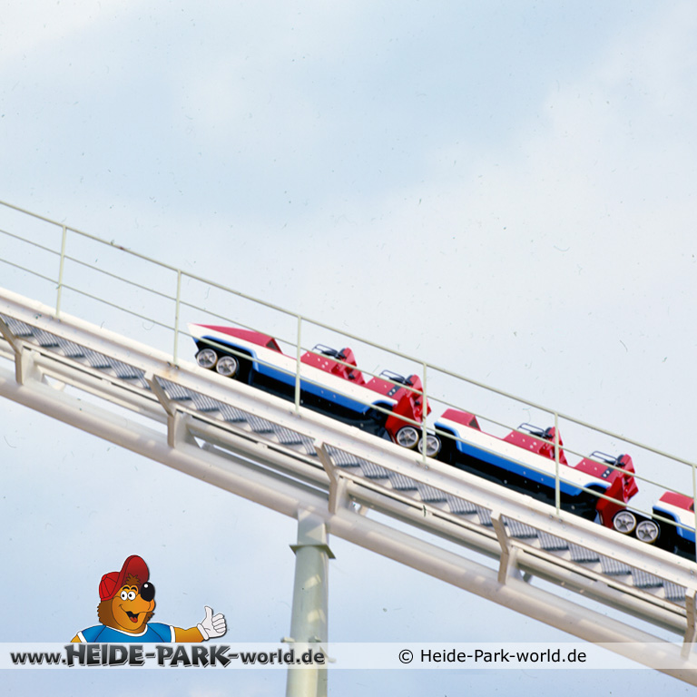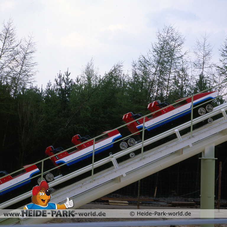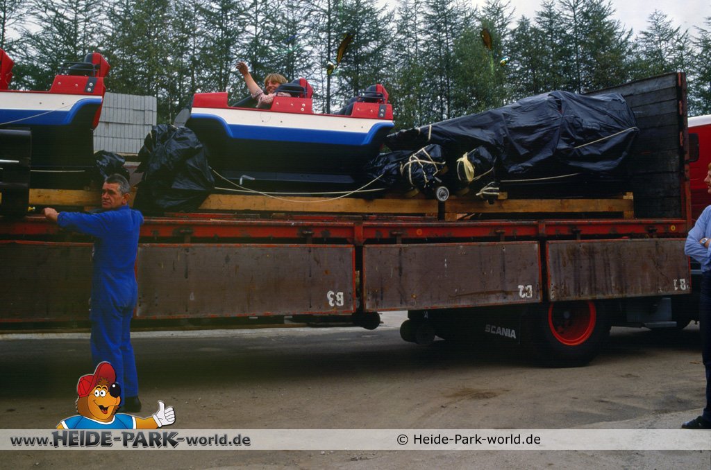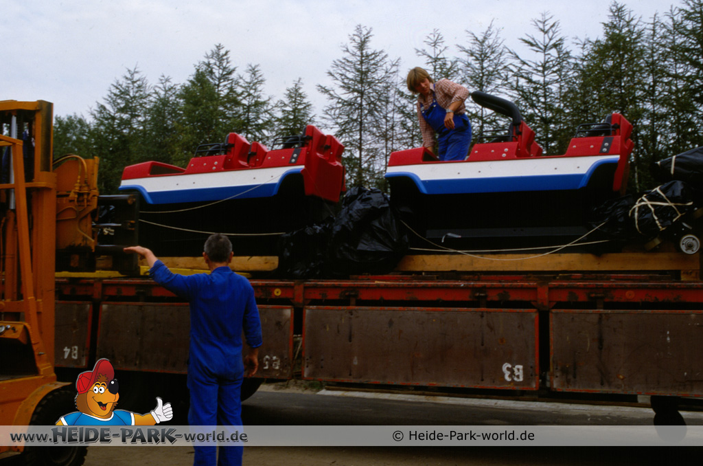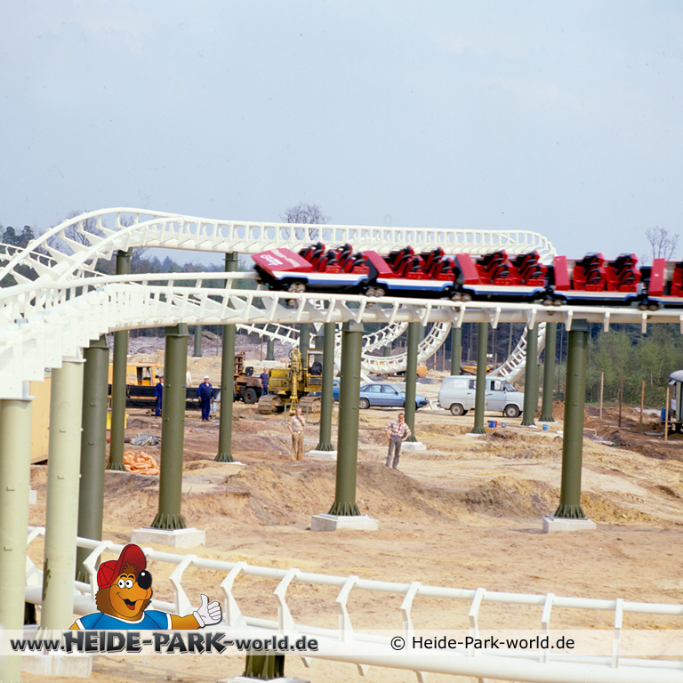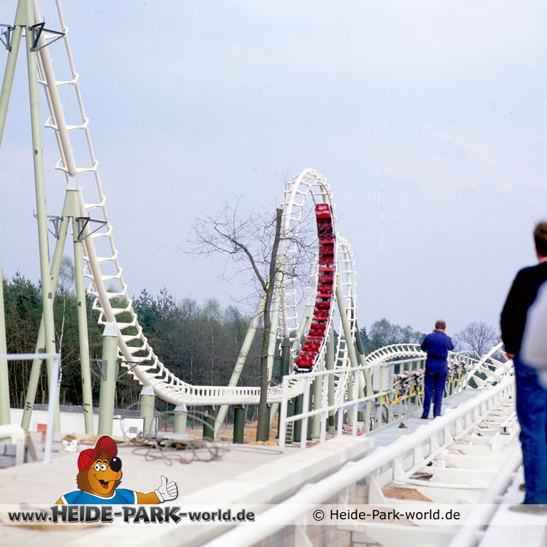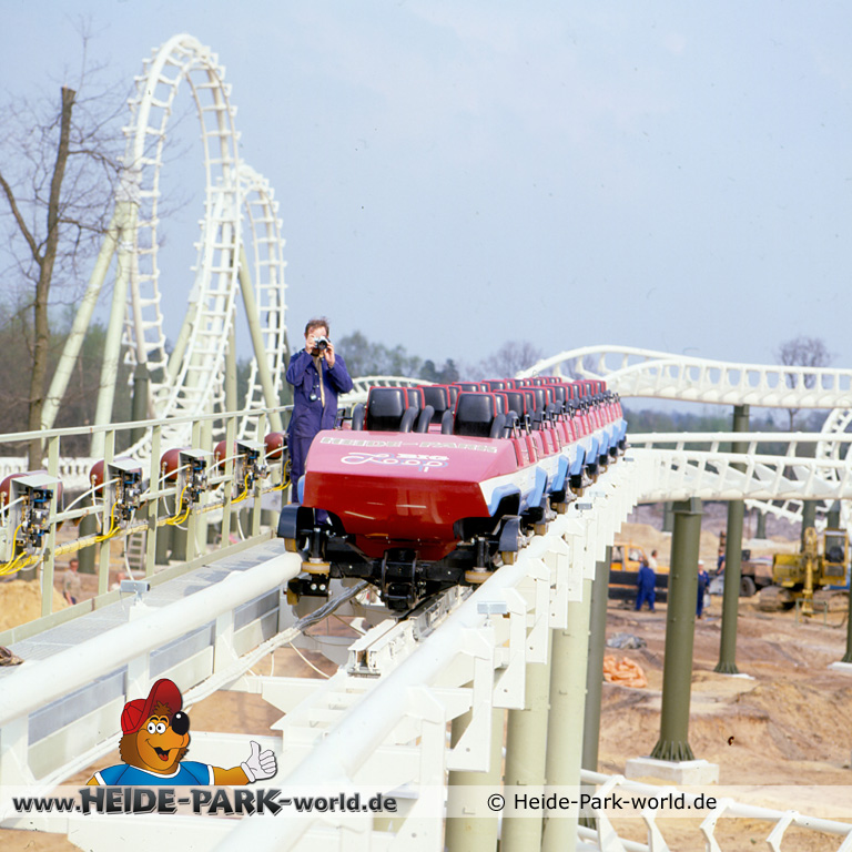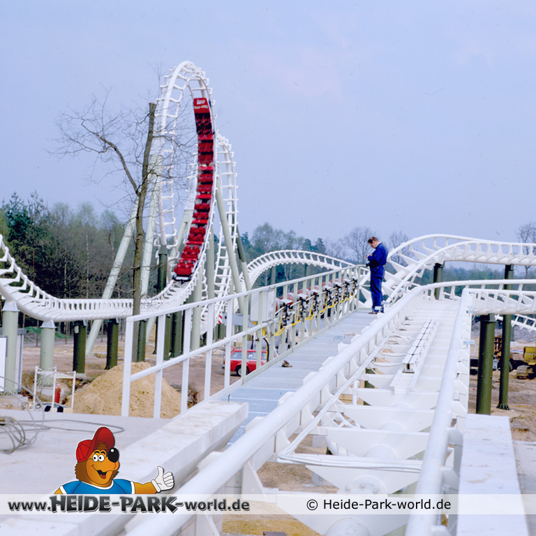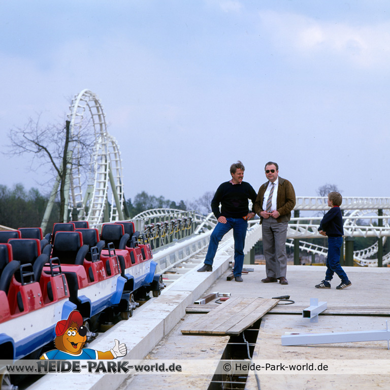 Teil 6 - Die Loopingbahn "Big Loop" wurde fertiggestellt. Der Lifthill, den man schon von weitem sehen kann, befördert die Gäste in 30 Meter Höhe. Auch die Züge der neuen Attraktion sind mittlerweile in Soltau eingetroffen. Nachdem man diese von den LKW´s geladen hat, beginnt man gleich mit den ersten Probefahrten. Parkinhaber Hans-Jürgen Tiemann und Vekoma-Chef Roger Houben zeigten sich nach der ersten Fahrt erfreut: "Tolle erste Loopingbahn und angenehm ruhig, sehr leise".