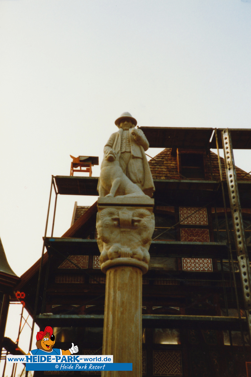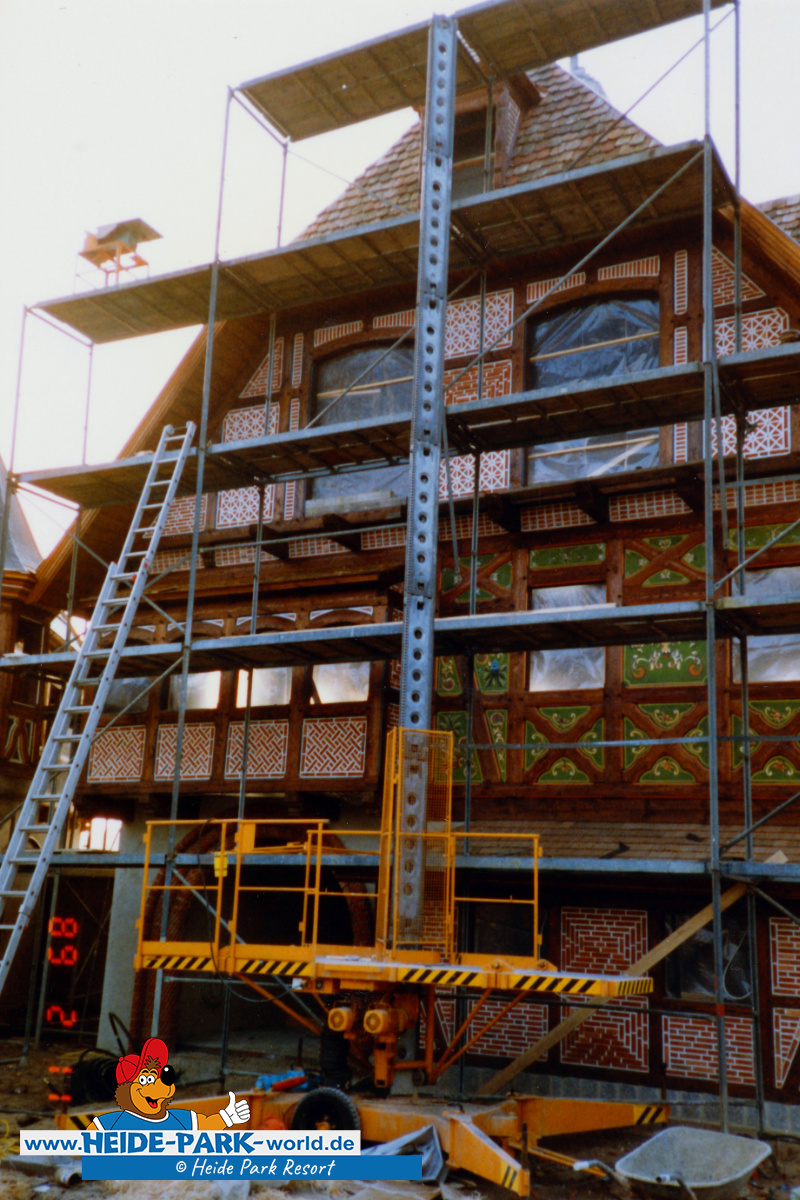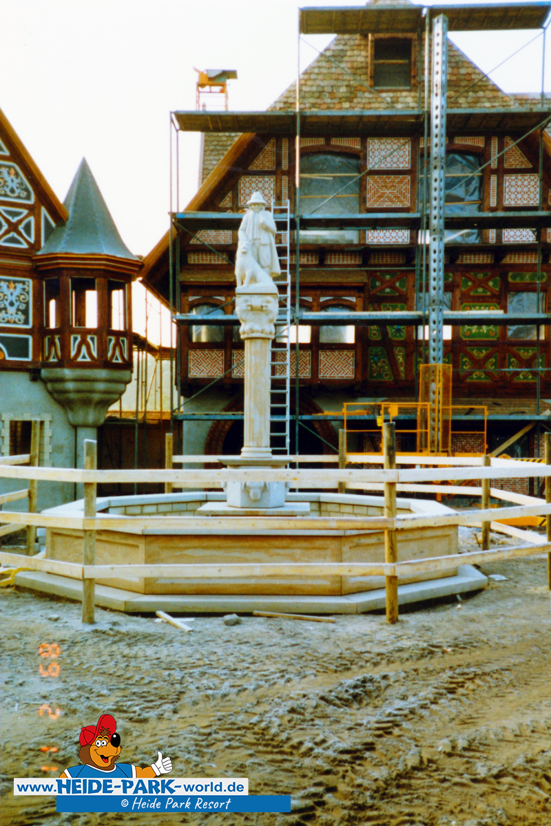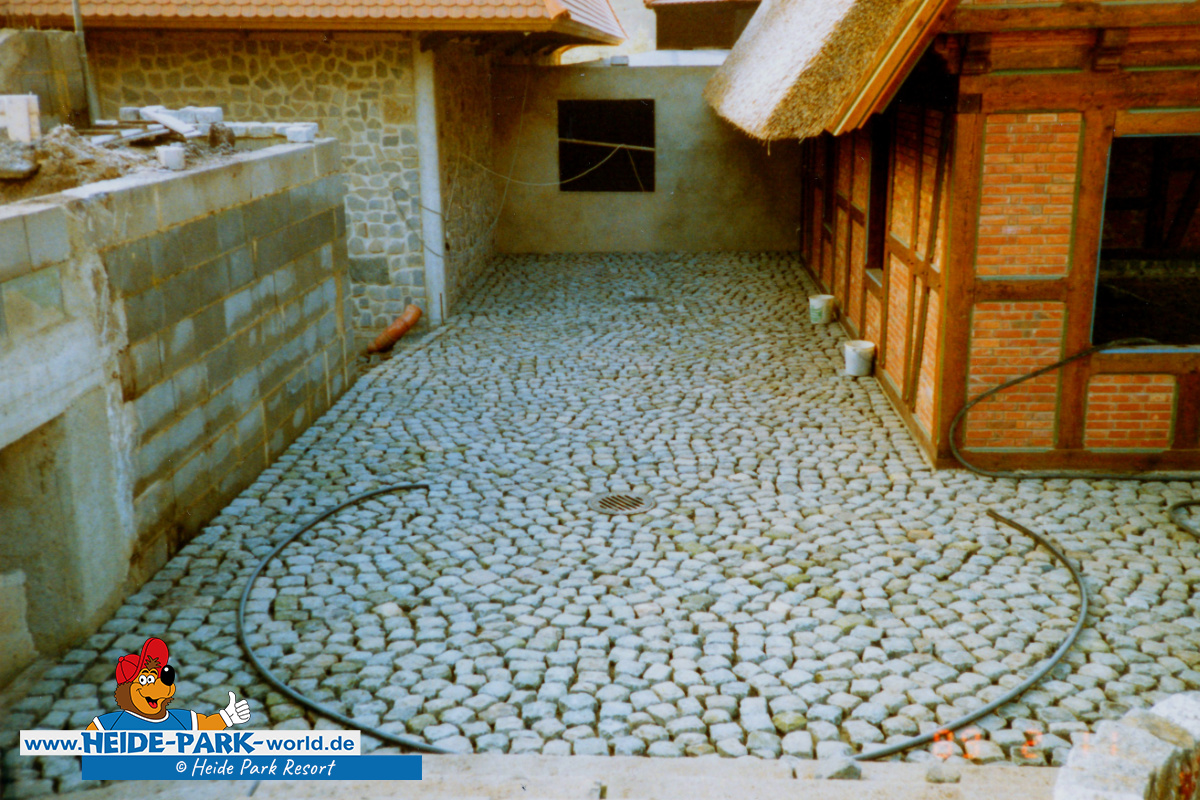 Im Februar 1989 machen wir uns erneut auf die Baustelle des Heide Dorfes. Nachdem im letzten Jahr mit den Arbeiten begonnen wurde und schon weite Teile der Häuserzeile fertiggstellt werden konnten, wird jetzt an einem Dorfzentrum mit Brunnen und dem Decken der Dächer gearbeitet.