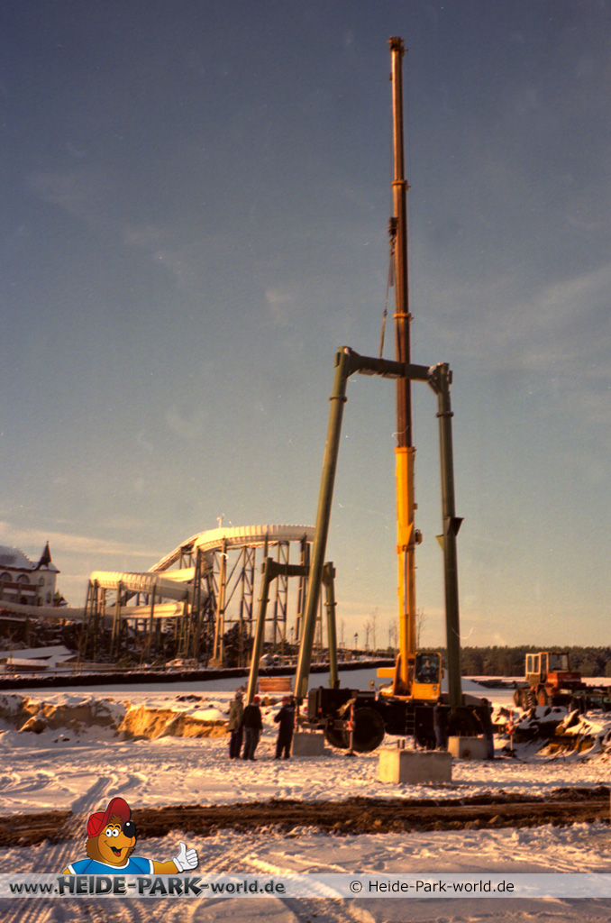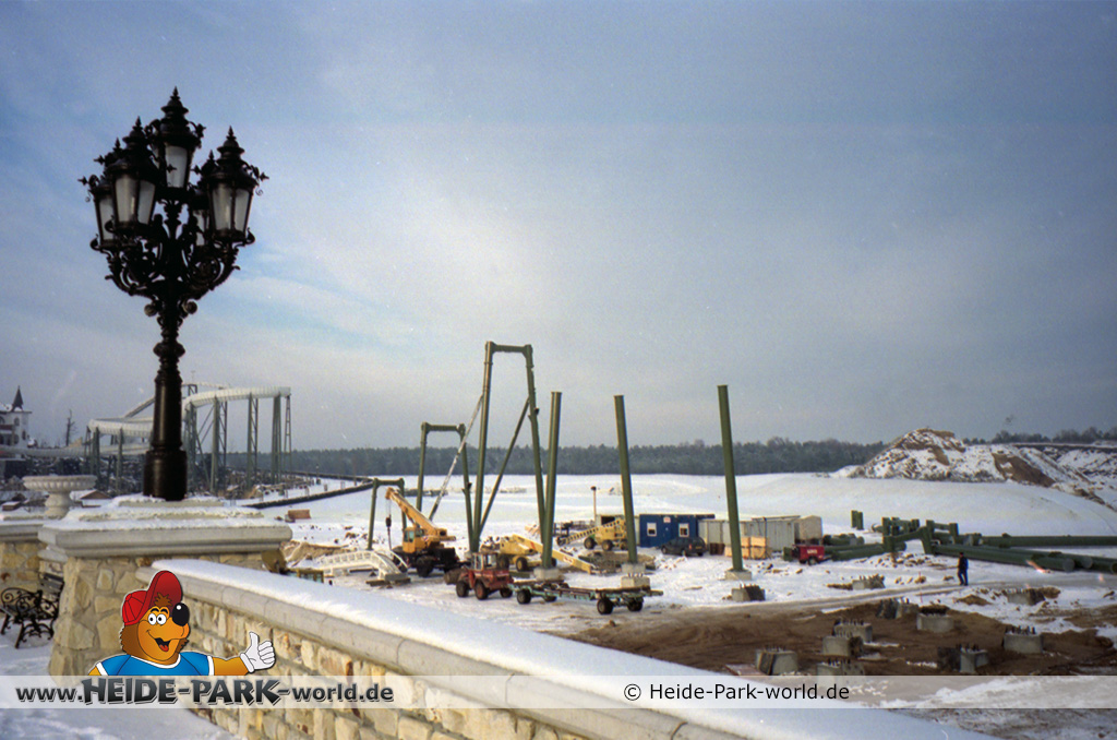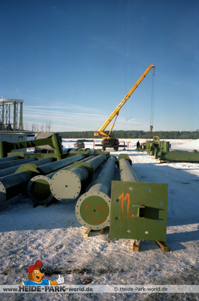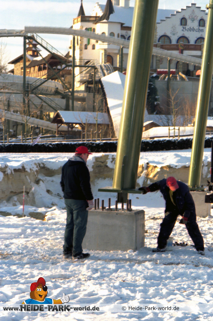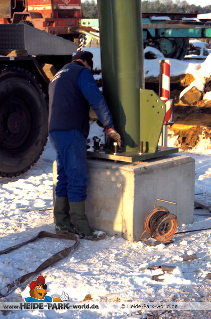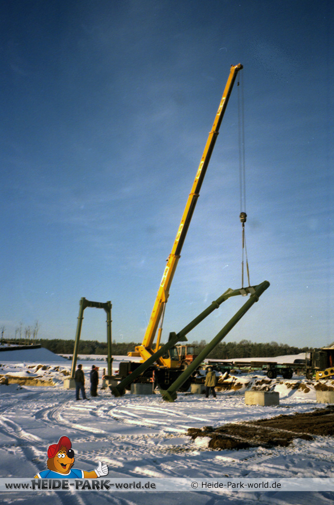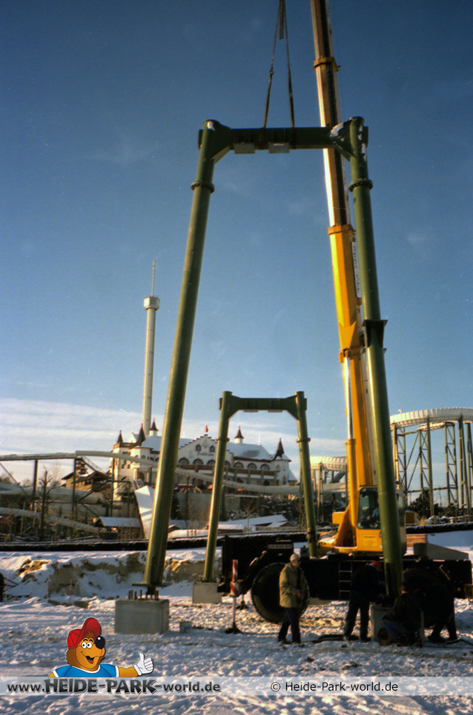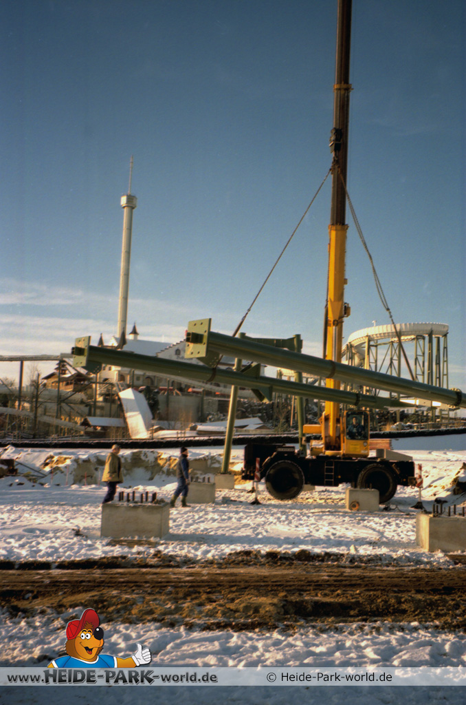 Teil 2: Anfang Dezember 1998 war es soweit: Nachdem die zahlreichen Fundamente ausgehärtet waren, begannen die Aufbauarbeiten der Stützen für den 31 Meter hohen Lift der Hängeloopingbahn.