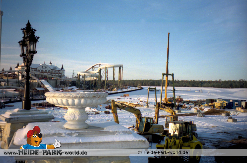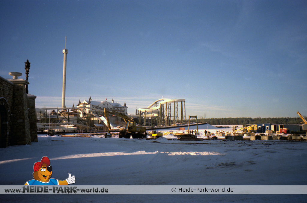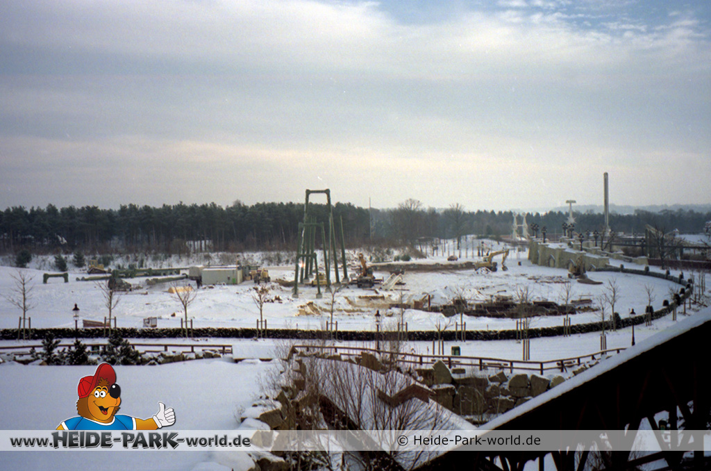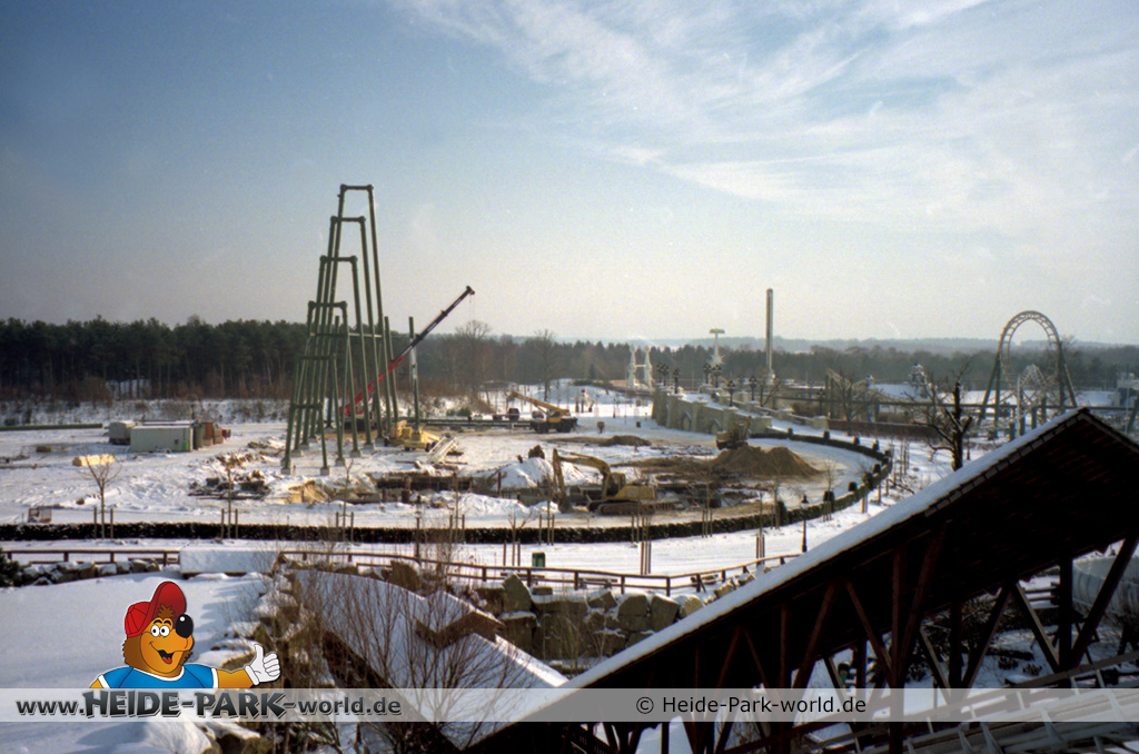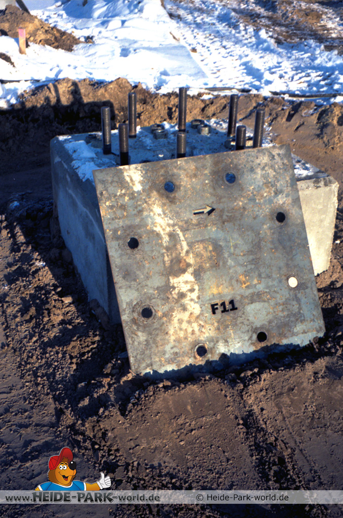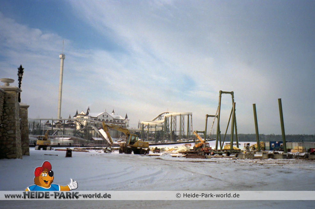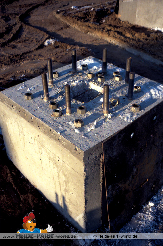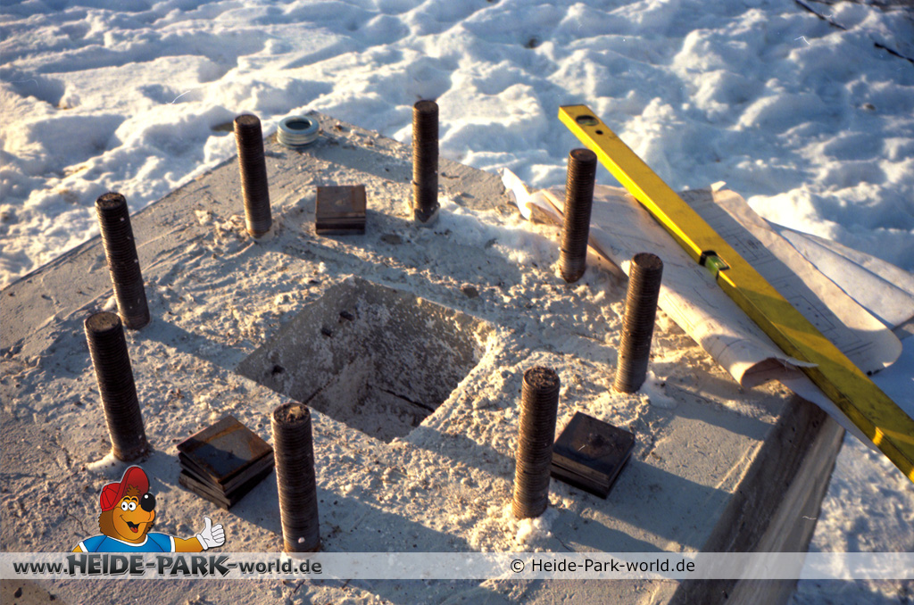 Teil 2: Anfang Dezember 1998 war es soweit: Nachdem die zahlreichen Fundamente ausgehärtet waren, begannen die Aufbauarbeiten der Stützen für den 31 Meter hohen Lift der Hängeloopingbahn.