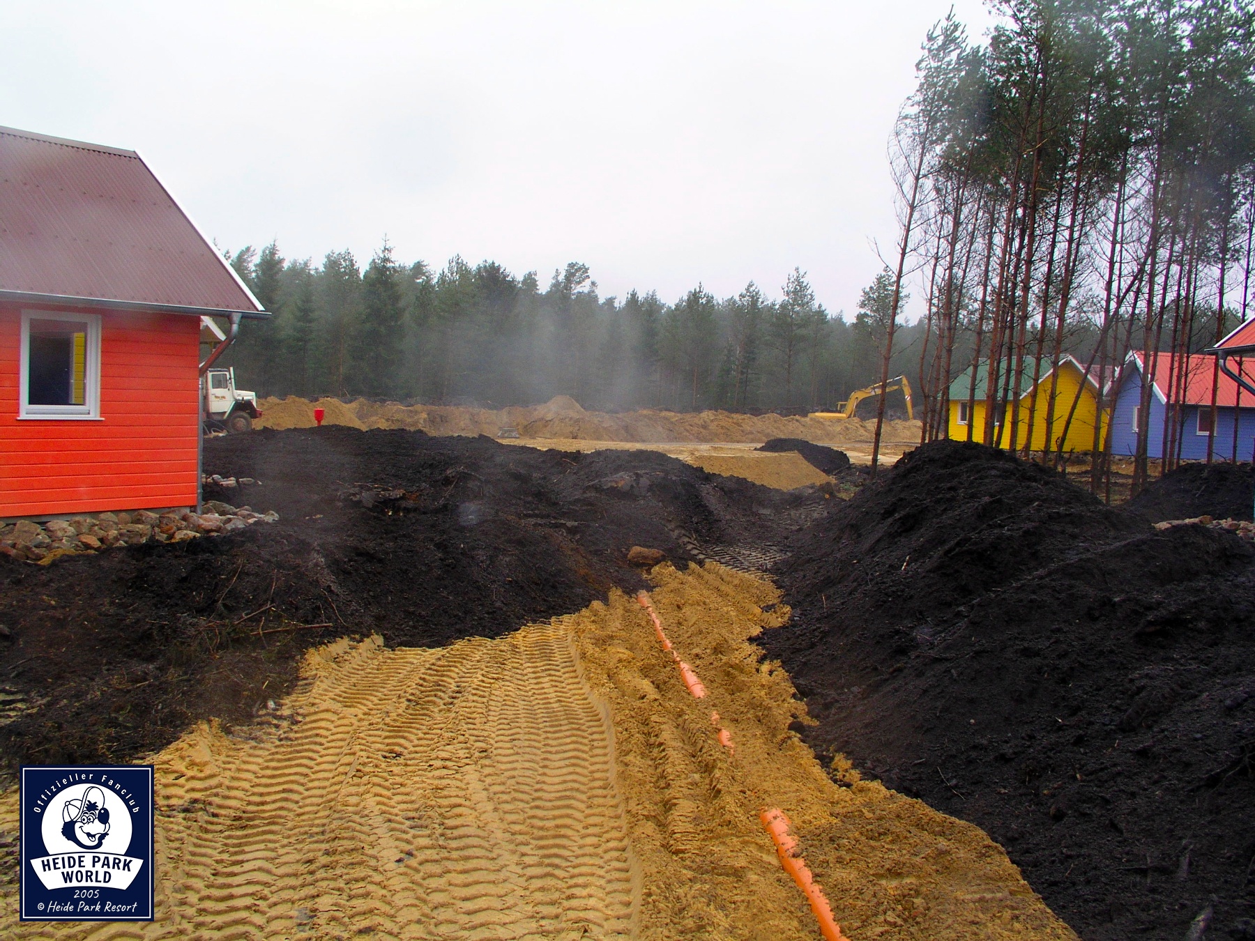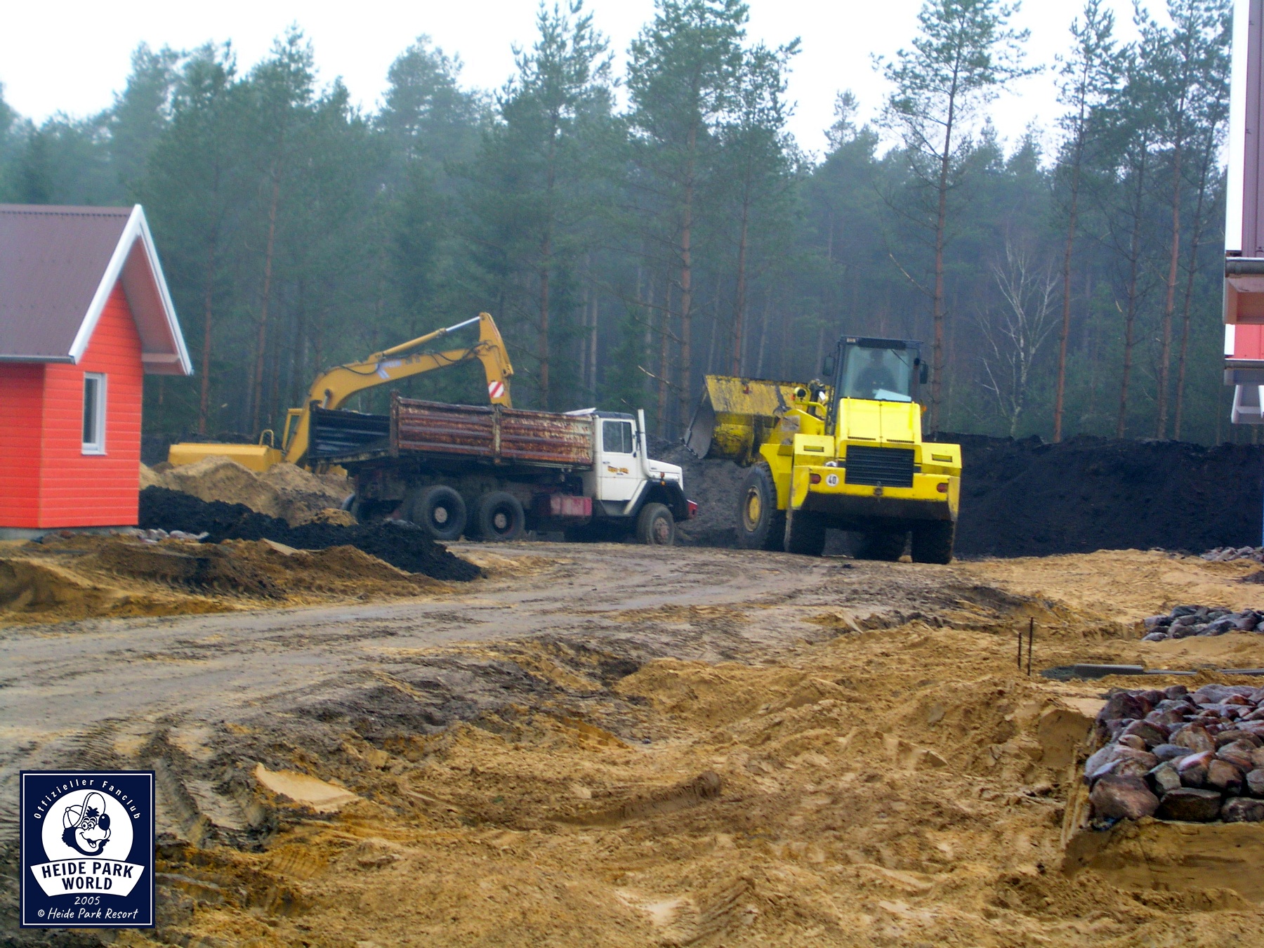 Außen herum werden Lesesteine platziert. Mit großen Maschinen geht es daran die Landschaft im Holiday Camp zu gestalten. Dazu wird jede Menge Sand benötigt und bewegt. Hier entstehen östlich des Hauptgebäudes später eine Chill-out-Area mit Sitzmöglichkeiten, einer Beach Bar, einem See und Spielplätzen.