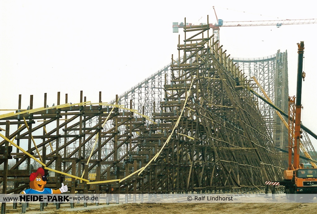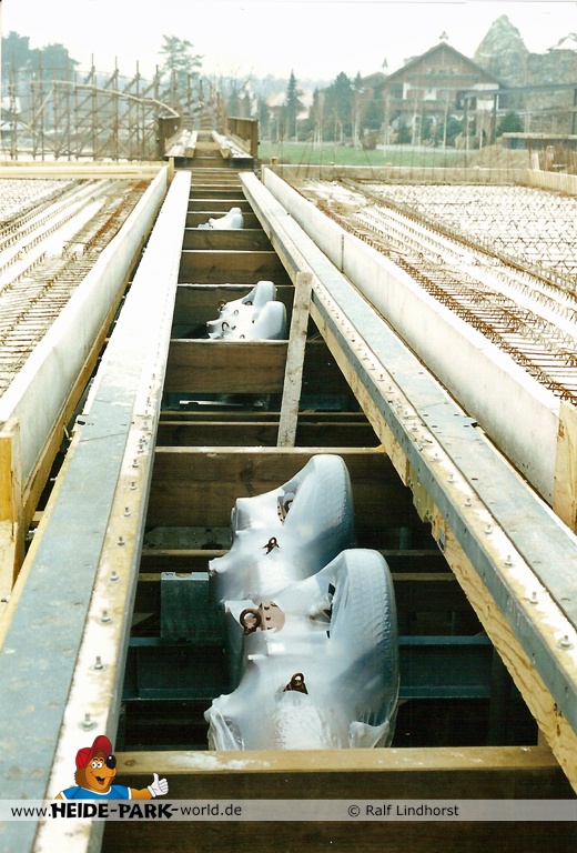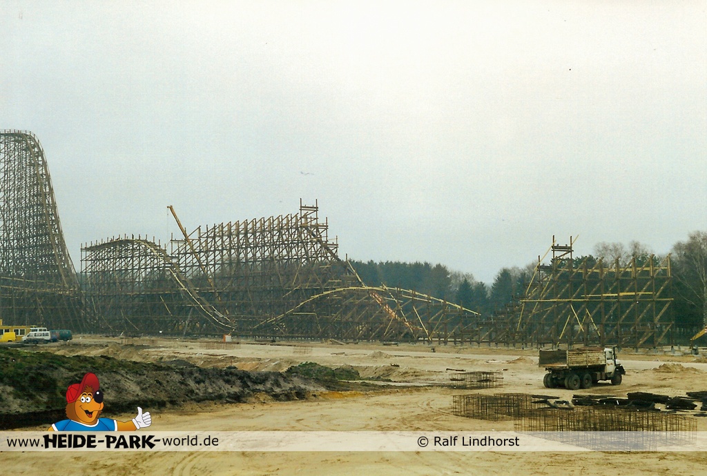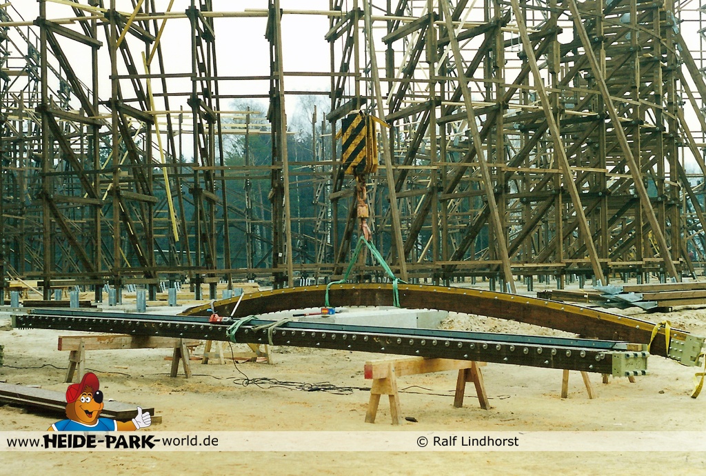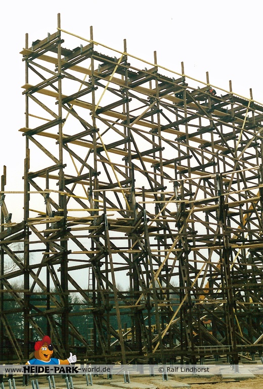 20. Januar 2001 - Die für den späteren Betrieb unerlässliche Brems- und Antriebseinheit ist zu ersten Teilen im Park angekommen. Auch der erste Camelback nimmt Gestalt an, sowie die Helix und der Zero-G Bump.