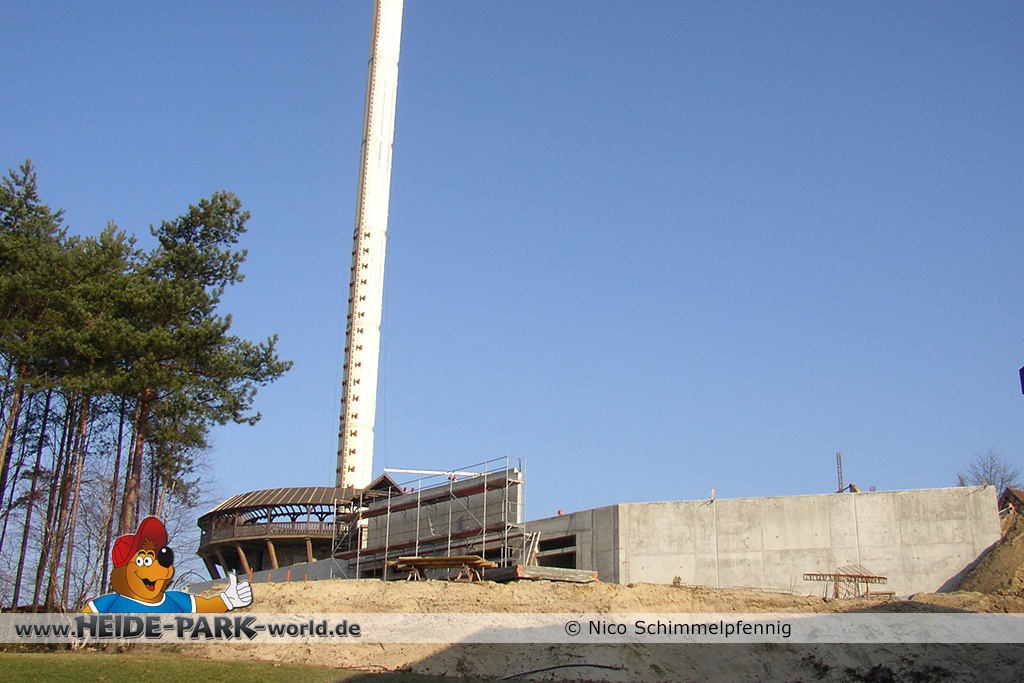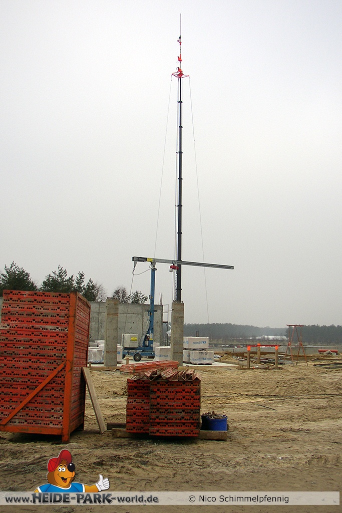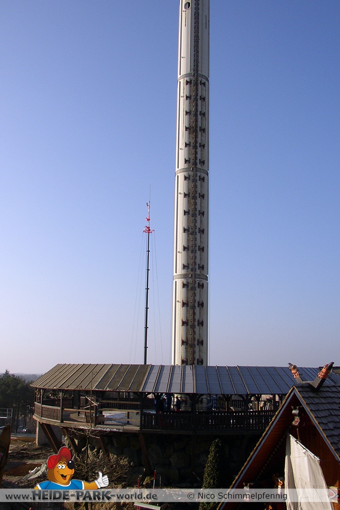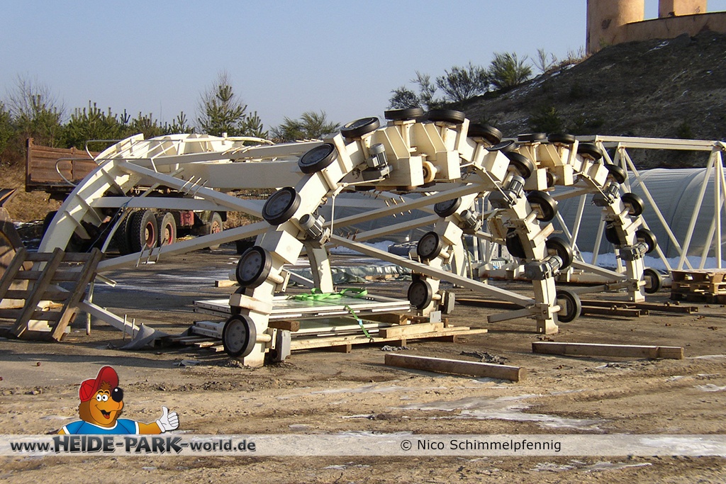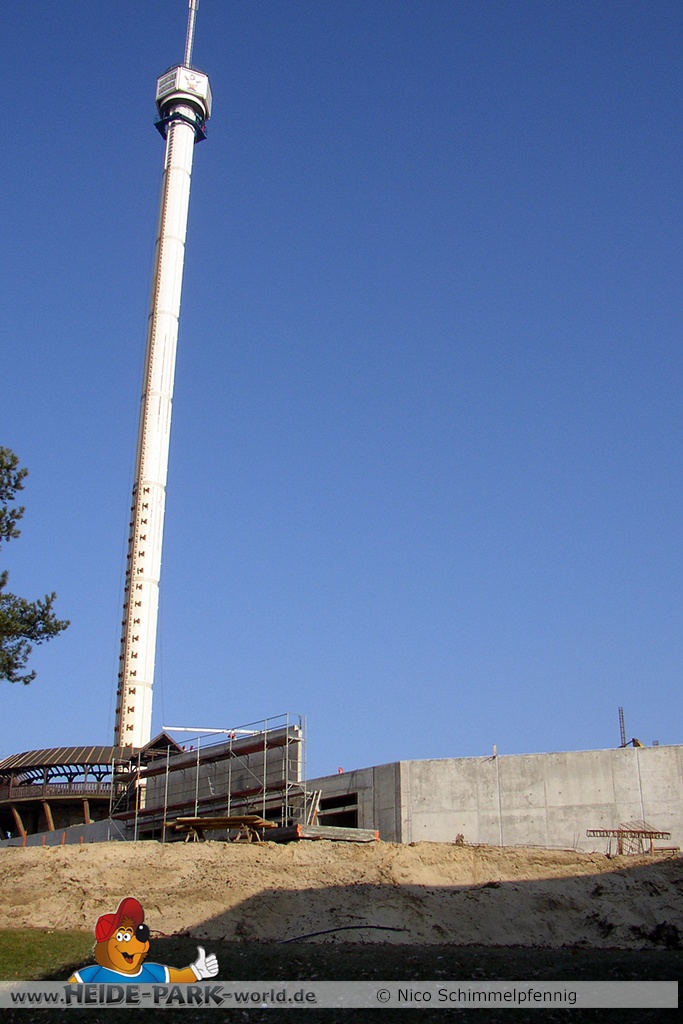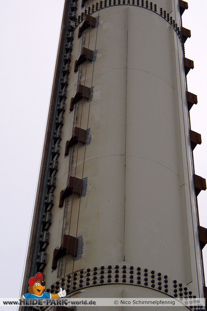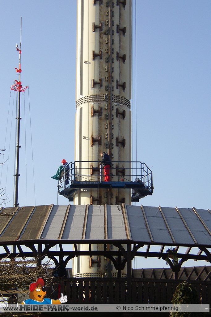 Damit auch ohne Gondel am Turm gearbeitet werden kann, wurde eine temporäre Arbeitsplattform am Turm installiert. Mit ihr können Schweißer, Maler und Elektriker jede beliebige Höhe erreichen. Als erstes wurden zwei gegenüberliegende Schienen installiert, die später die Gondel in der Spur halten werden und die Haltevorrichtungen für die Wirbelstrombremsen angeschweißt. Die ersten Wandmodule für den Scream Shop und den Imbiss wurden auch schon in Position gebracht. Weitere Teile befinden sich in Vorbereitung. Auf dem Betriebshof kann man noch Teile der Rollenauflage für die Gondel des ehemaligen Aussichtsturm 2 sehen.