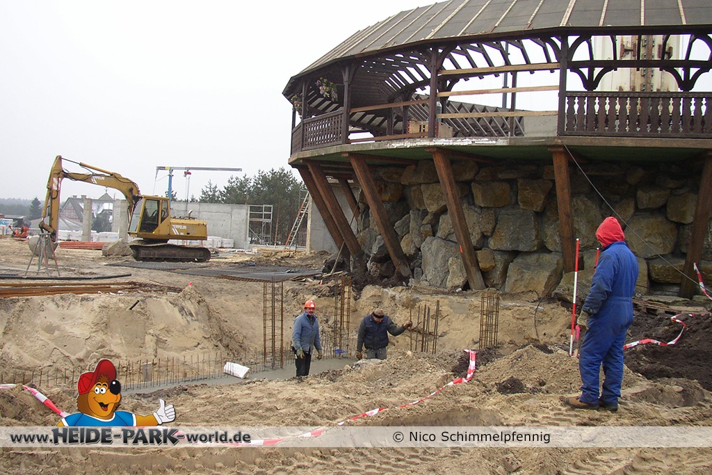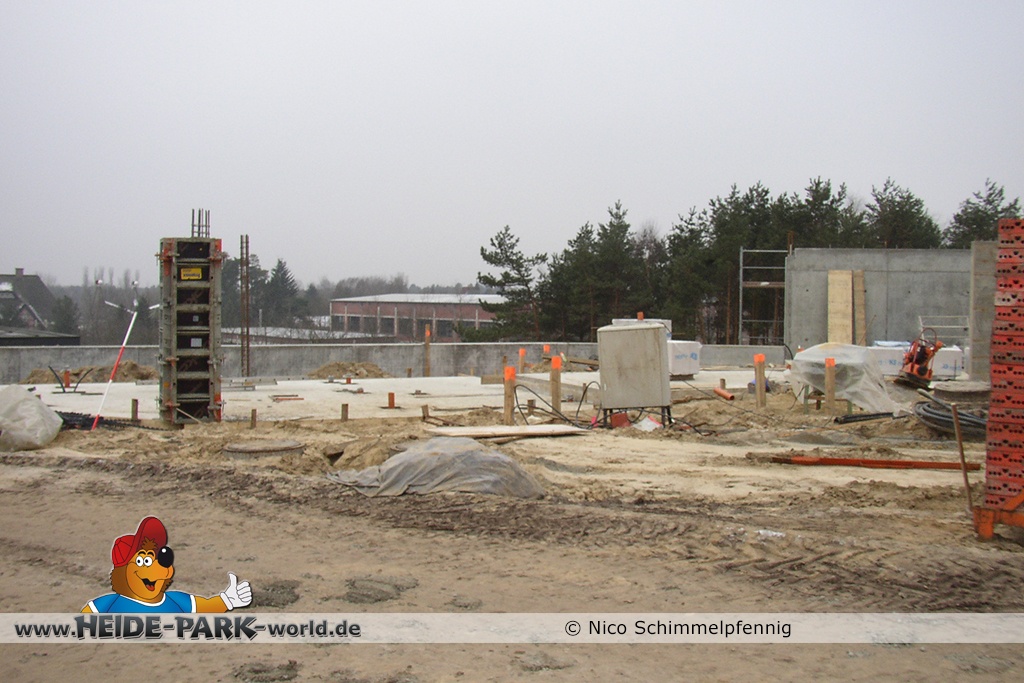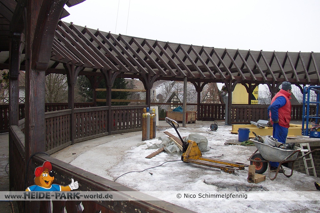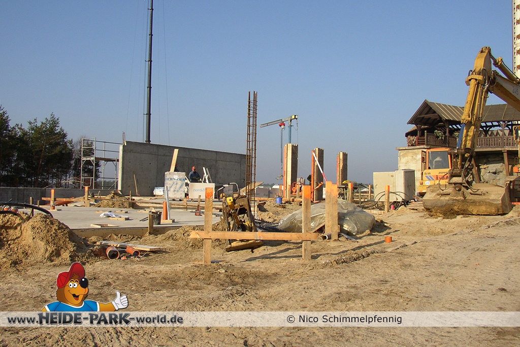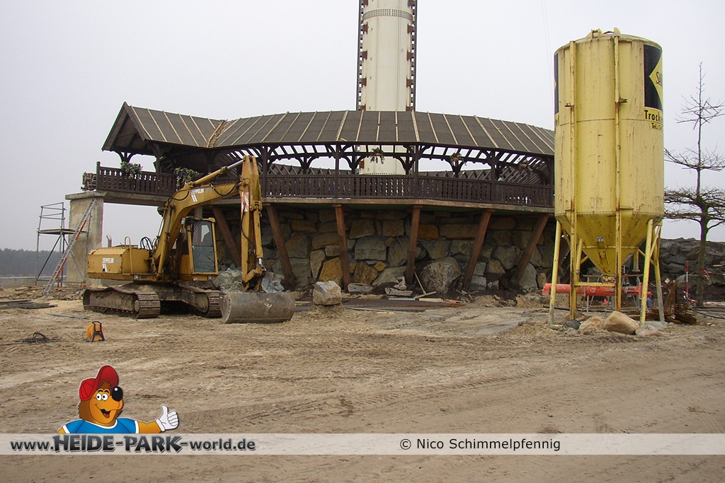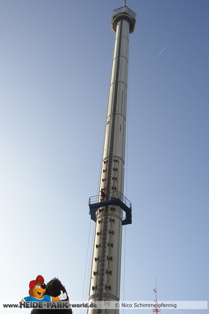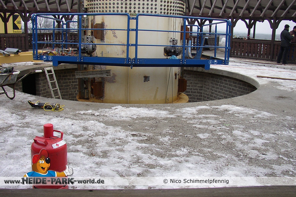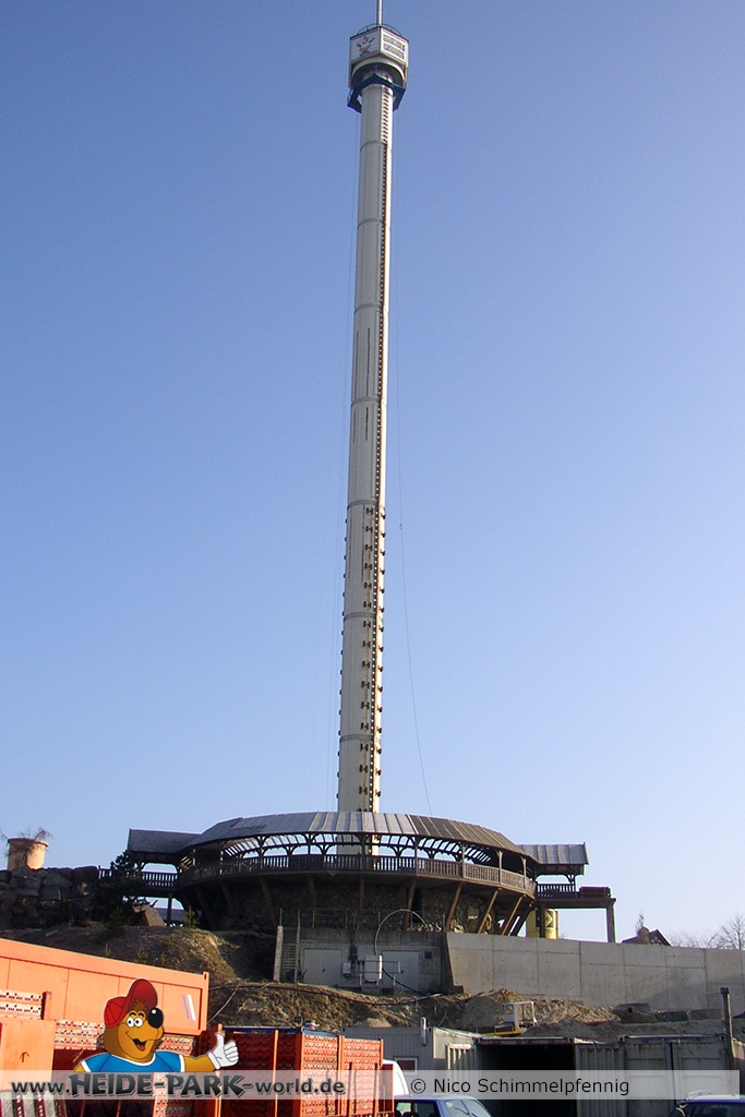 Damit auch ohne Gondel am Turm gearbeitet werden kann, wurde eine temporäre Arbeitsplattform am Turm installiert. Mit ihr können Schweißer, Maler und Elektriker jede beliebige Höhe erreichen. Als erstes wurden zwei gegenüberliegende Schienen installiert, die später die Gondel in der Spur halten werden und die Haltevorrichtungen für die Wirbelstrombremsen angeschweißt. Die ersten Wandmodule für den Scream Shop und den Imbiss wurden auch schon in Position gebracht. Weitere Teile befinden sich in Vorbereitung. Auf dem Betriebshof kann man noch Teile der Rollenauflage für die Gondel des ehemaligen Aussichtsturm 2 sehen.