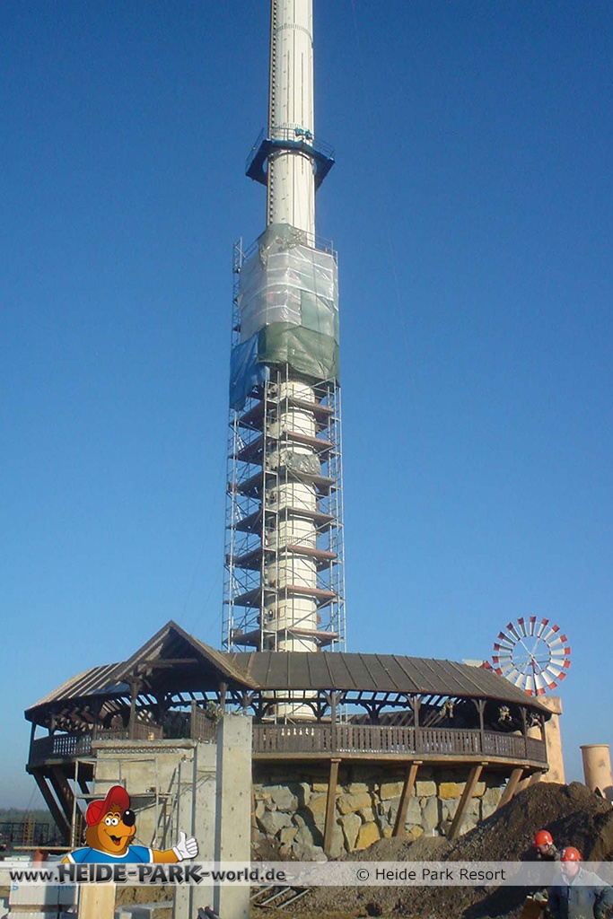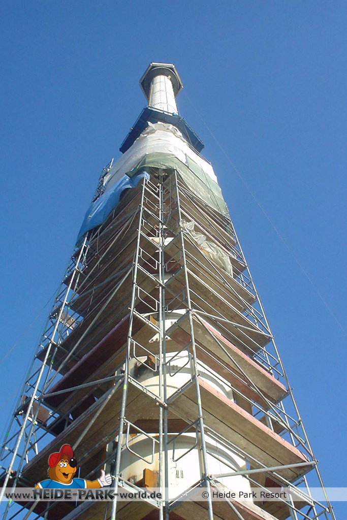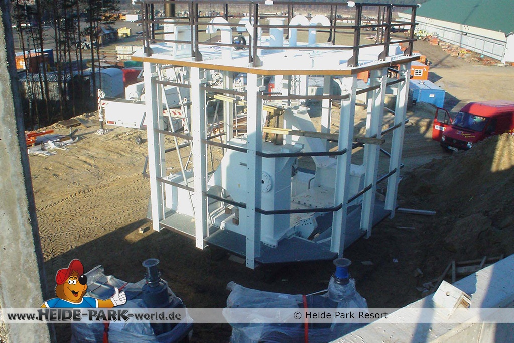 Die beiden jeweils 765 PS starken Elektromotoren werden später auf der Spitze des Turmes ihren Platz finden und nachträglich mittels Kran in das Motorenhäuschen eingesetzt. Dieses wird zurzeit auf dem Bauhof vom Heide Park zusammengebaut.