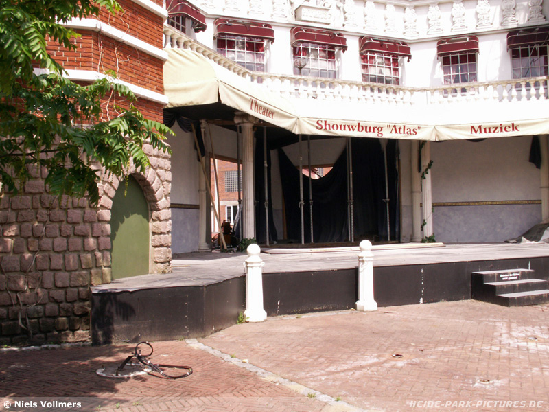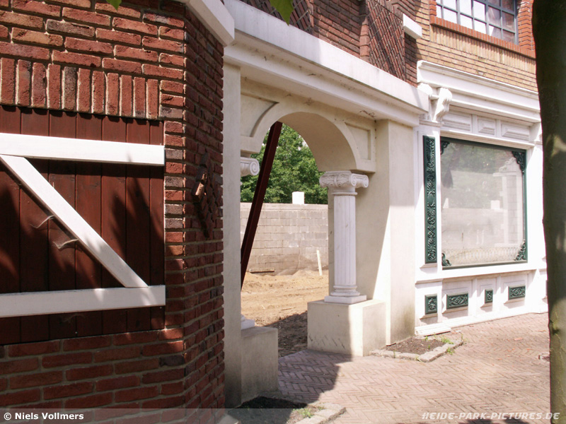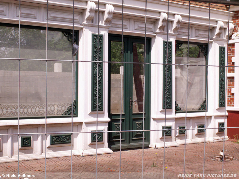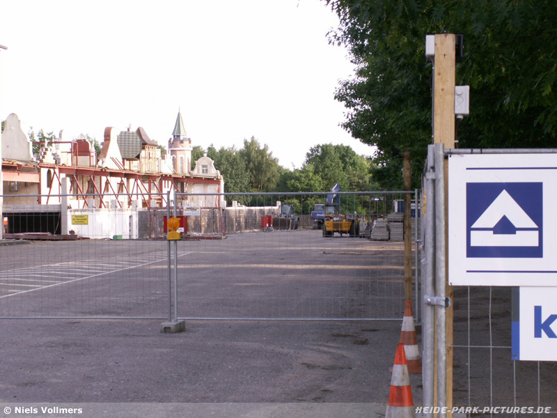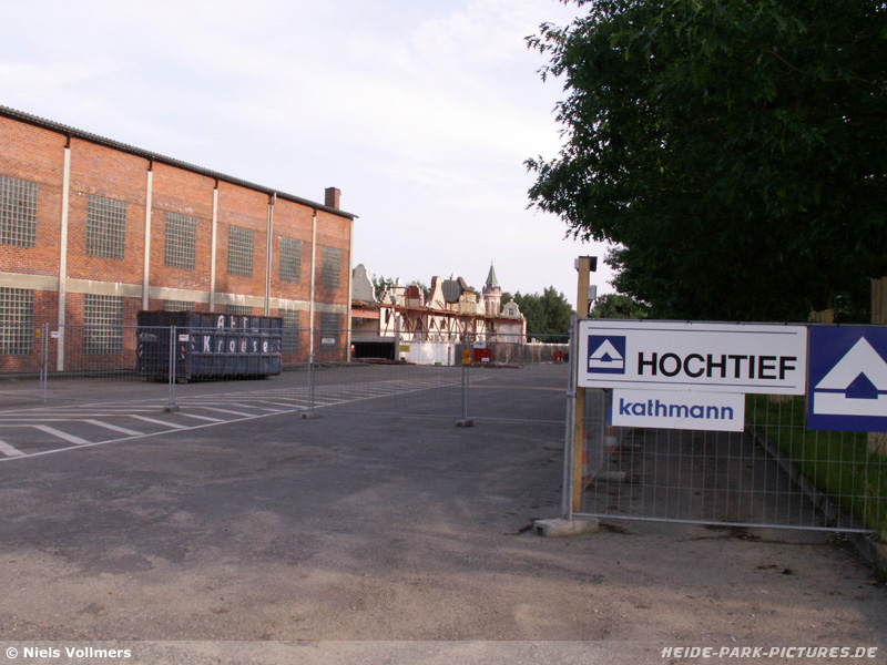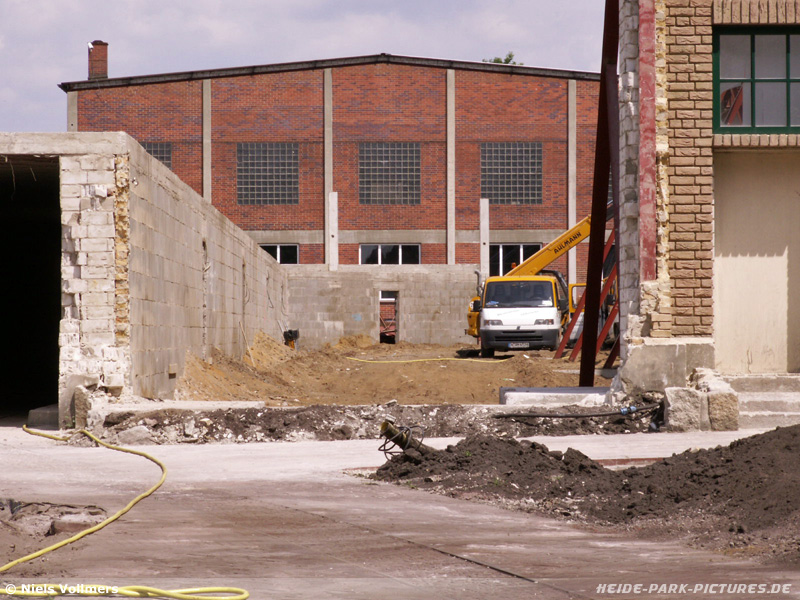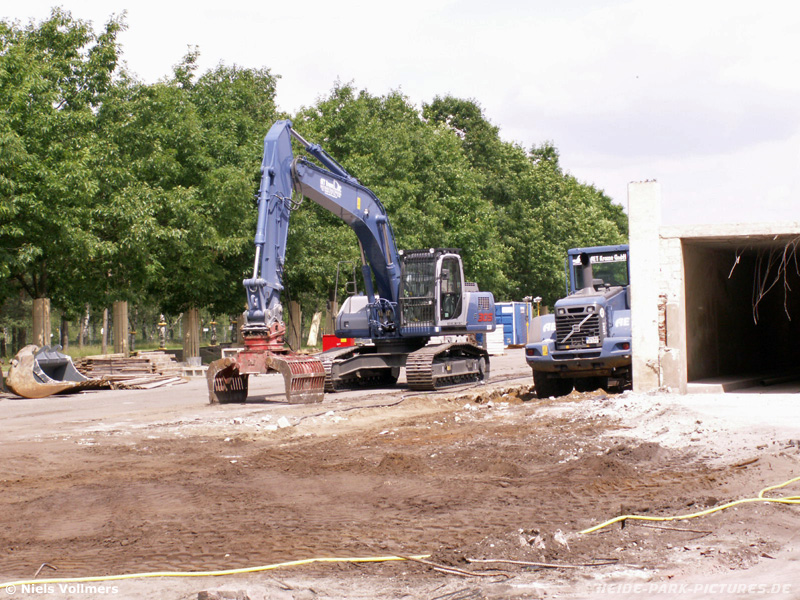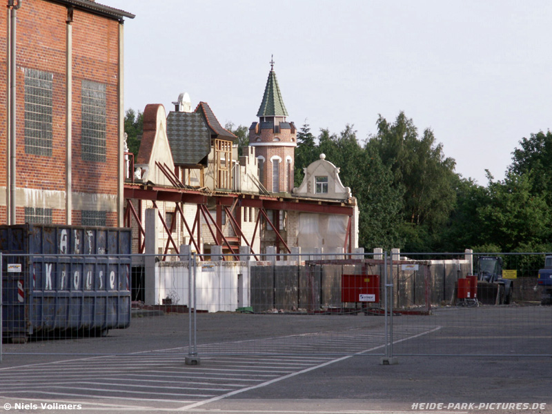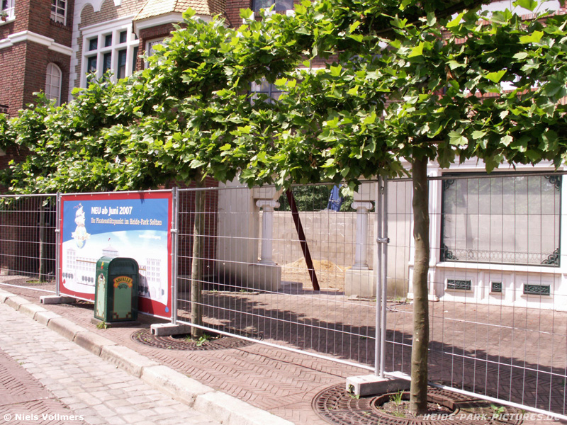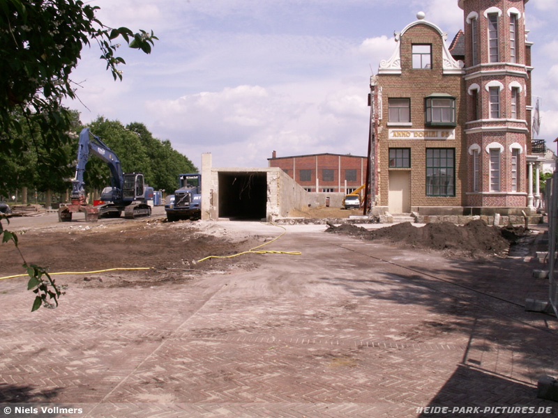 24. Juni 2006 - Letzte Woche hatte man schon begonnen, die Hallen, hinter dem Holländischen Stadtteil abzureißen. Seit diesem Wochenende steht nur noch die von Pfeilern gestützte Fassade, die später vom Hotel überragt werden soll.