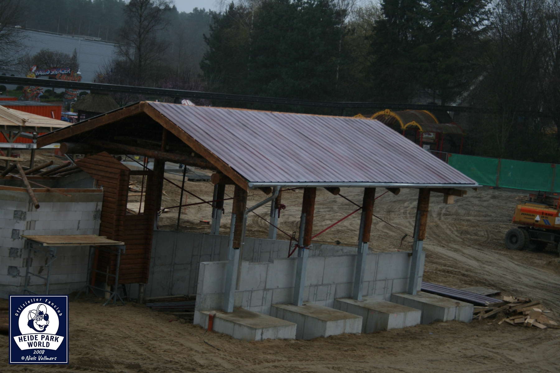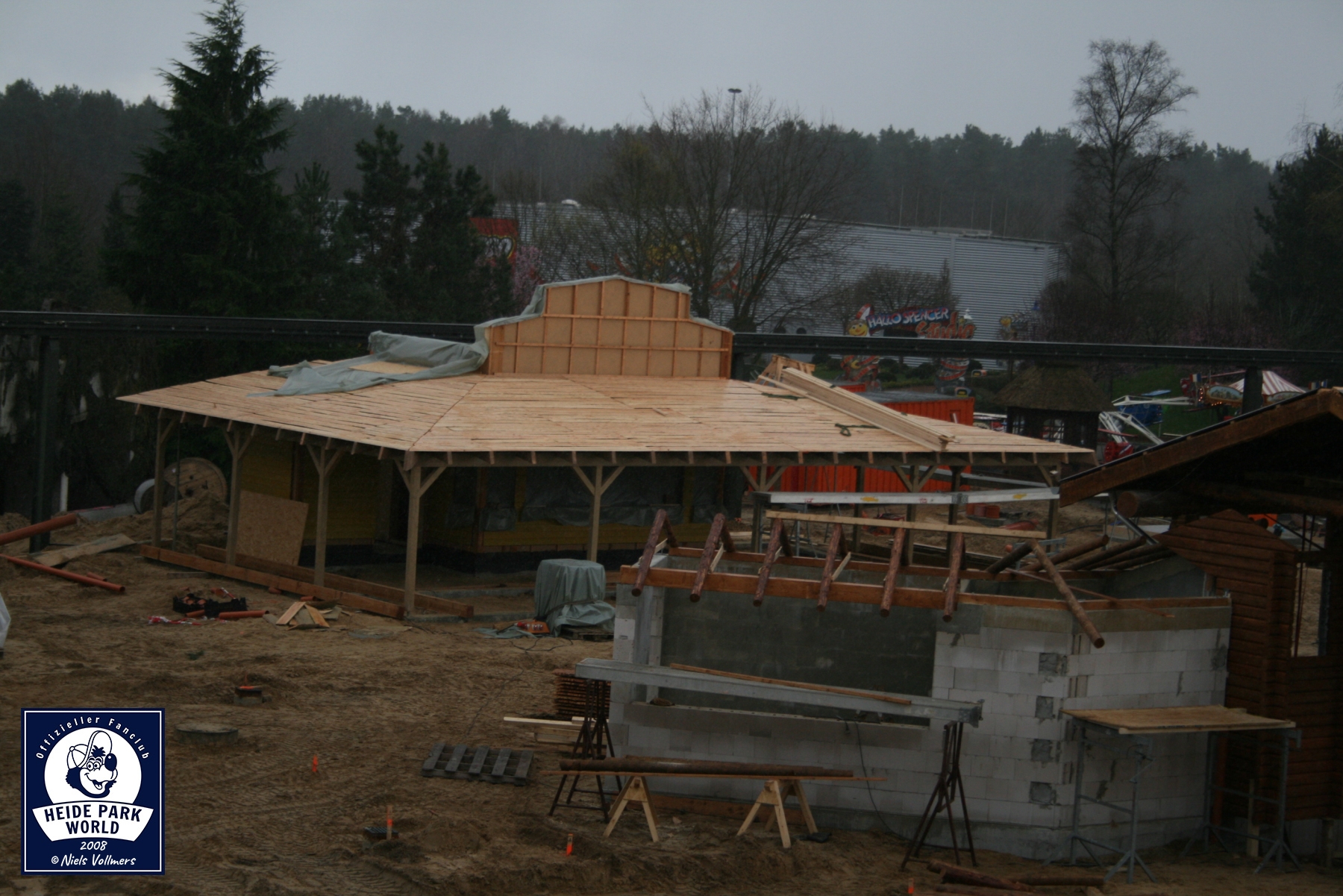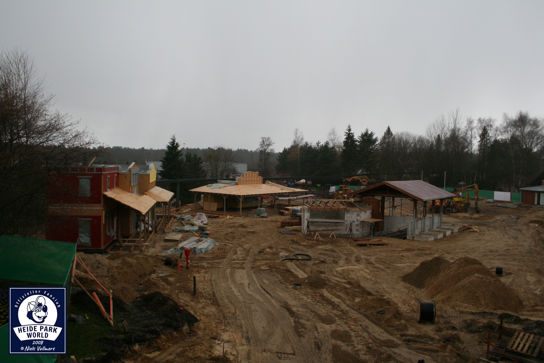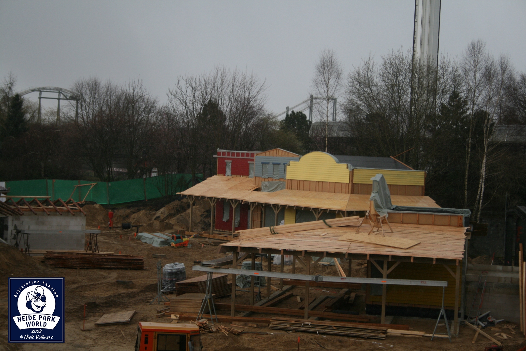 06. April 2008 - Die Gebäude im Lucky Land nehmen langsam Gestalt an. Der Western Saloon, die Shops, die Achterbahn und die Riesenrad Station sind bereits zu erkennen.