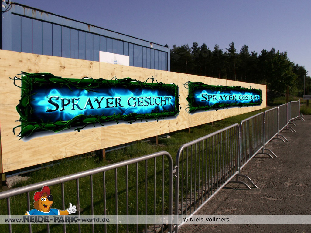 Foto (Archiv): Wie schon zum Bau von Desert Race im Jahr 2006 soll bei der ehemaligen Wildwasserbahn II ein Bauzaun errichtet werden. Dieser soll verschönert werden (Grafik Montage von uns).
