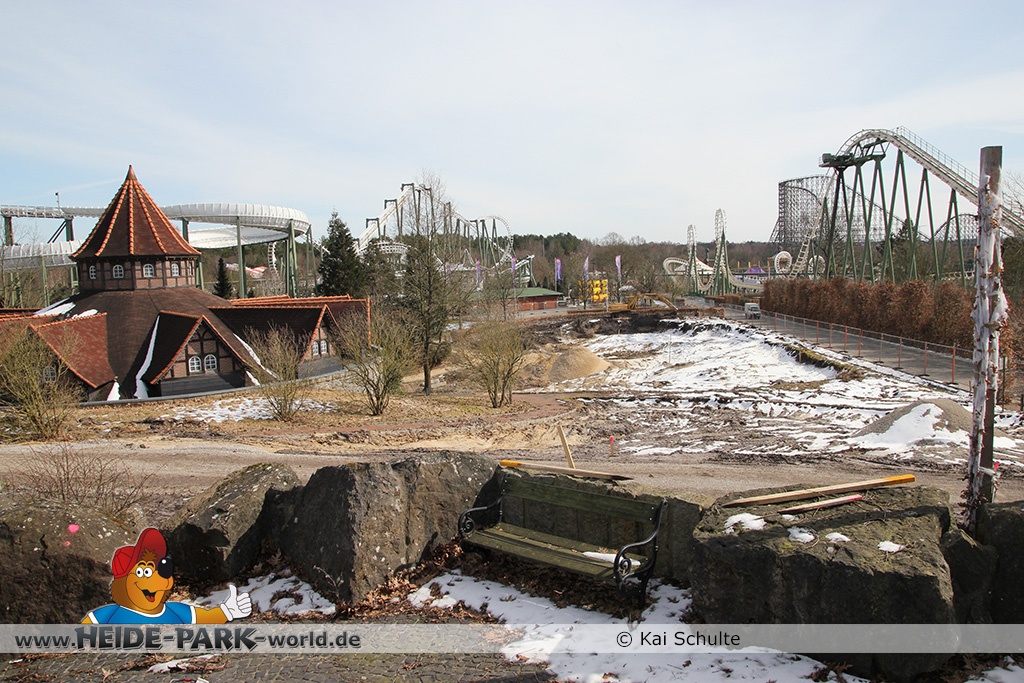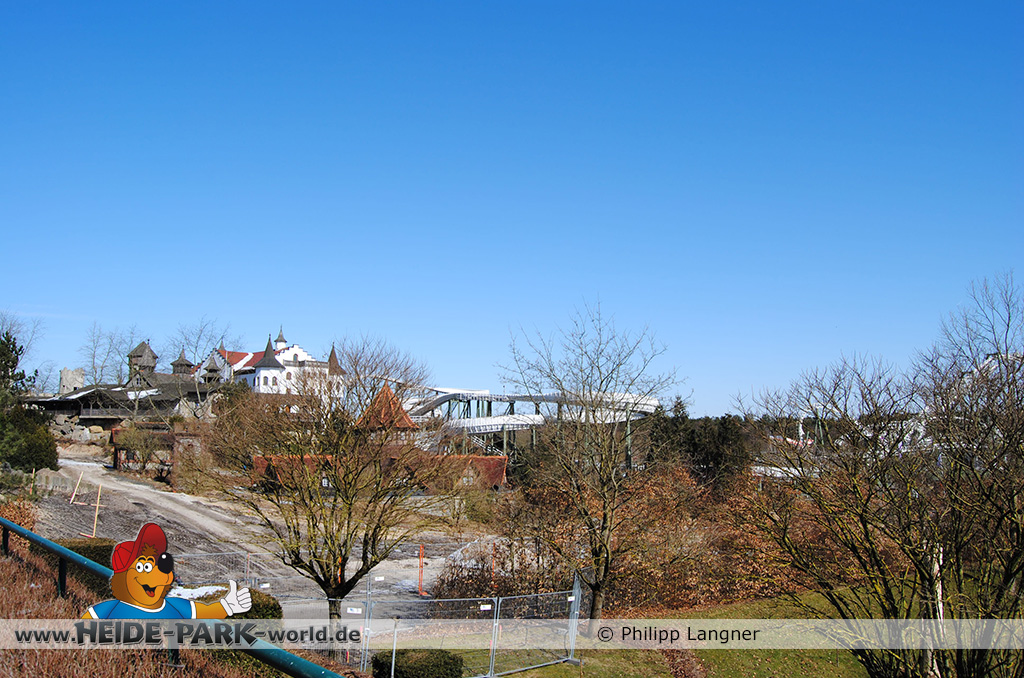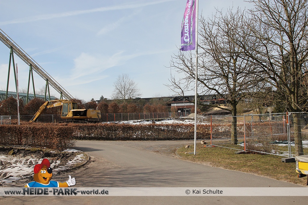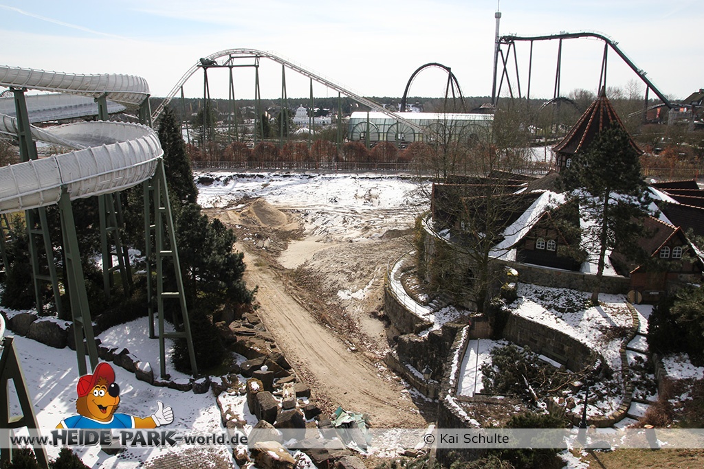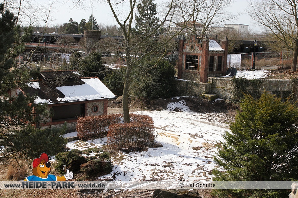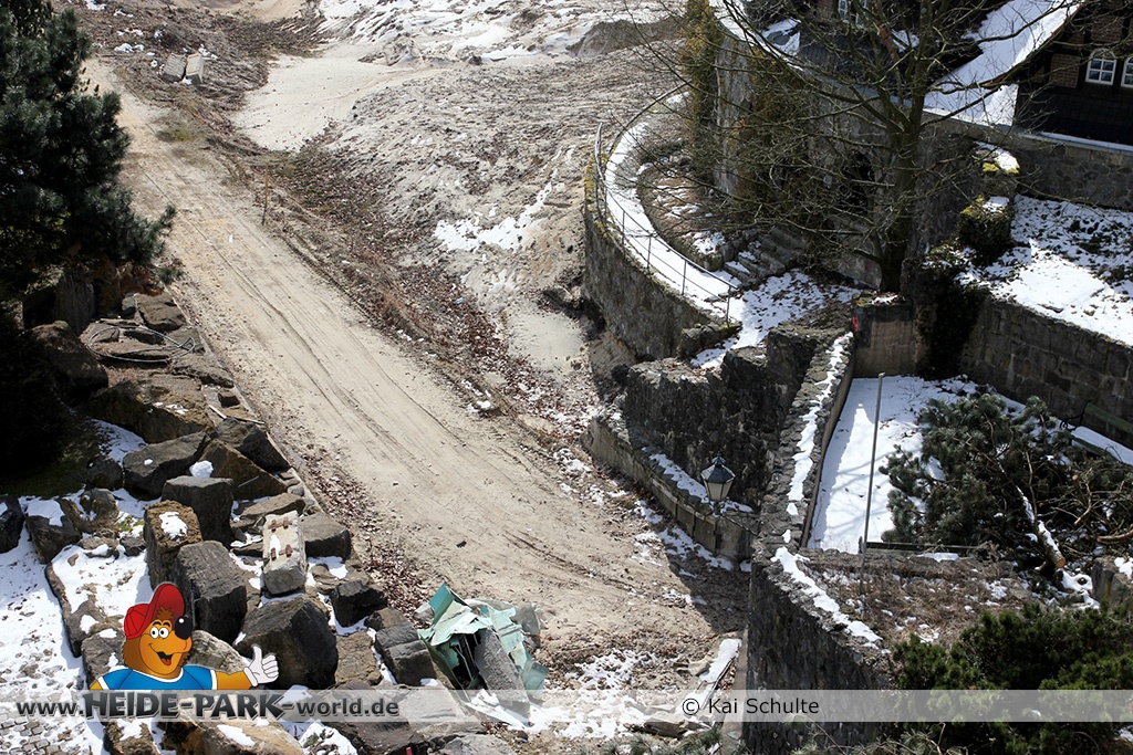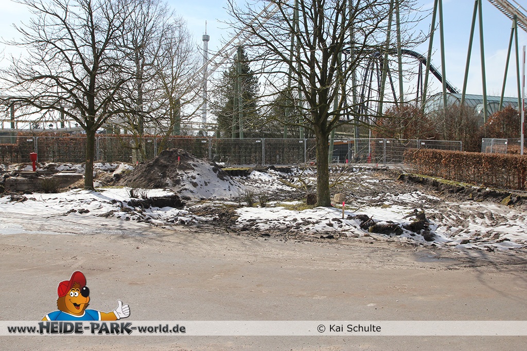26. März 2013 - Neben den vielen Neuheiten zur Saisoneröffnung stand natürlich auch die Fläche der ehemaligen Wildwasserbahn II im Fokus der Heide Park Fans. Auch im Winter wurden Rückbauarbeiten auf der Fläche vorgenommen.
