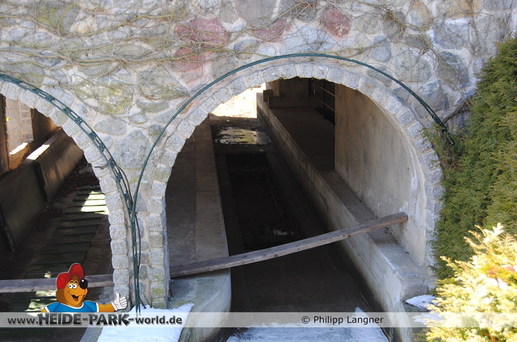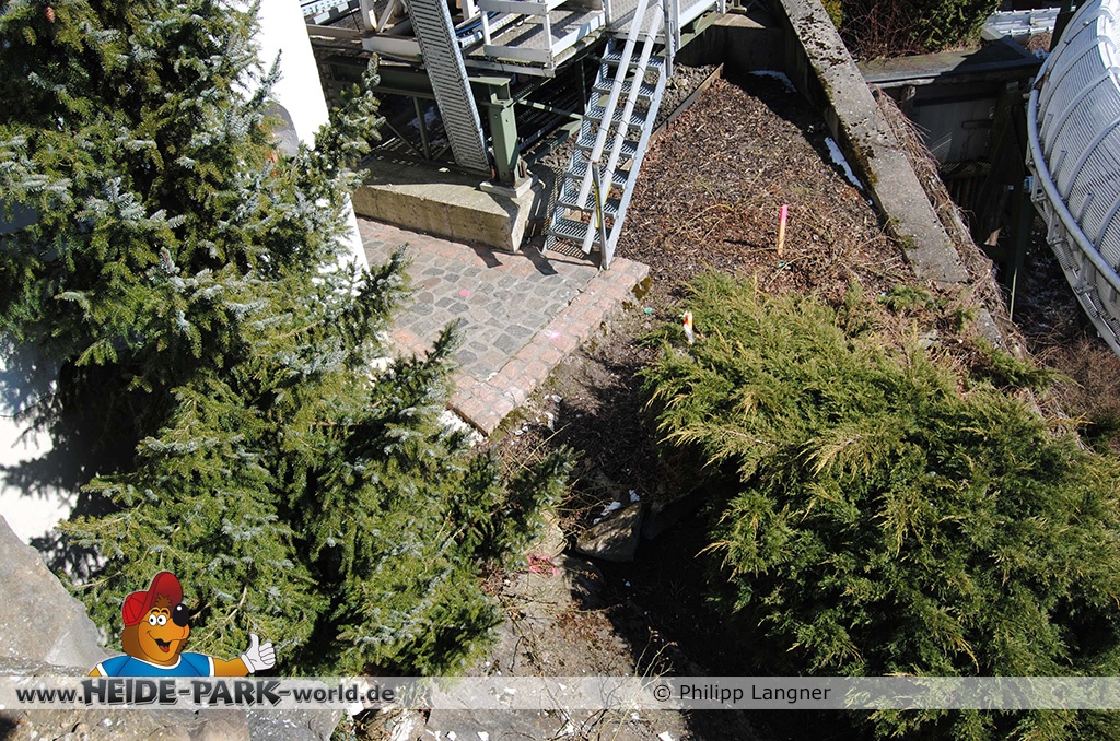 Neben der Madagascar LIVE! Show und der Tatsache, dass "auf dem Berg" sowieso nichts fuhr, rückte die Fläche der ehemaligen Wildwasserbahn fast schon in den Hintergrund. Doch eben nur fast. Wir haben uns in den öffentlich zugänglichen Bereichen einmal umgesehen und festgestellt, dass im Winter der komplette untere Teil der Wildwasserbahn rückgebaut wurde. Die Sitzecke, die sich am Auslauf befand ist verschwunden, ebenso wie die Hecke zum Betriebshof. Wer genau hinschaut, konnte Markierungspfähle entdecken, die zum Teil im letzten Jahr noch nicht da waren.