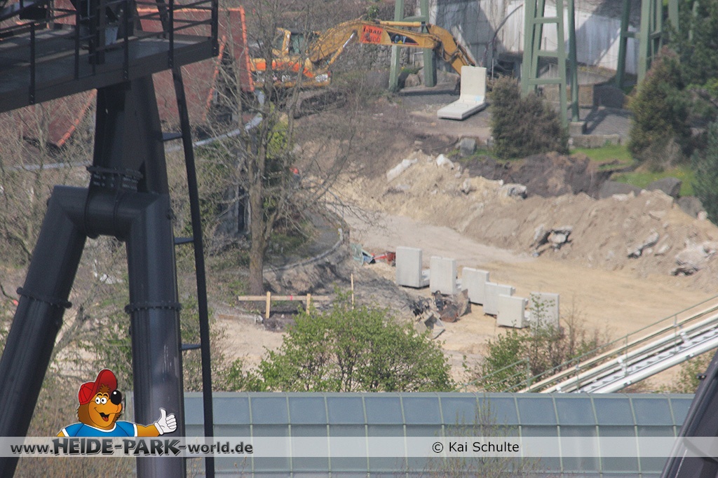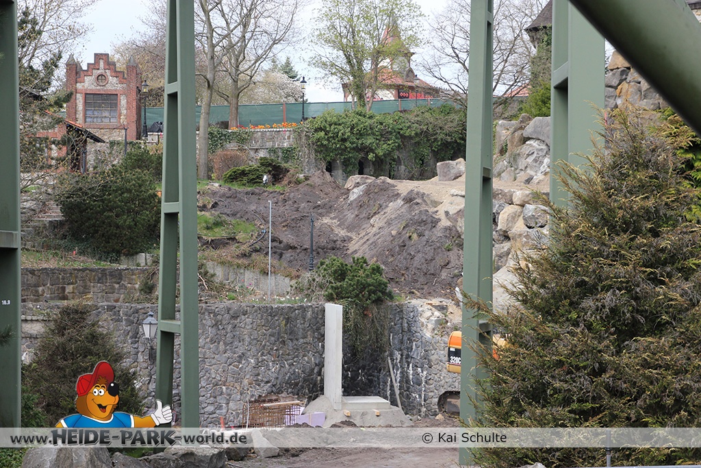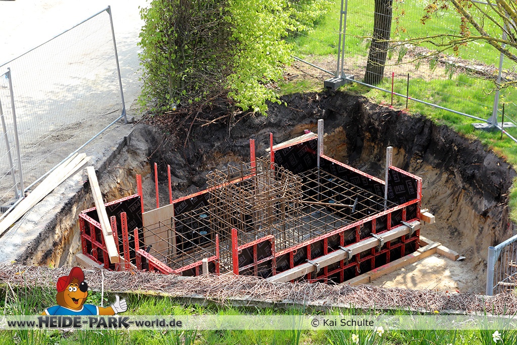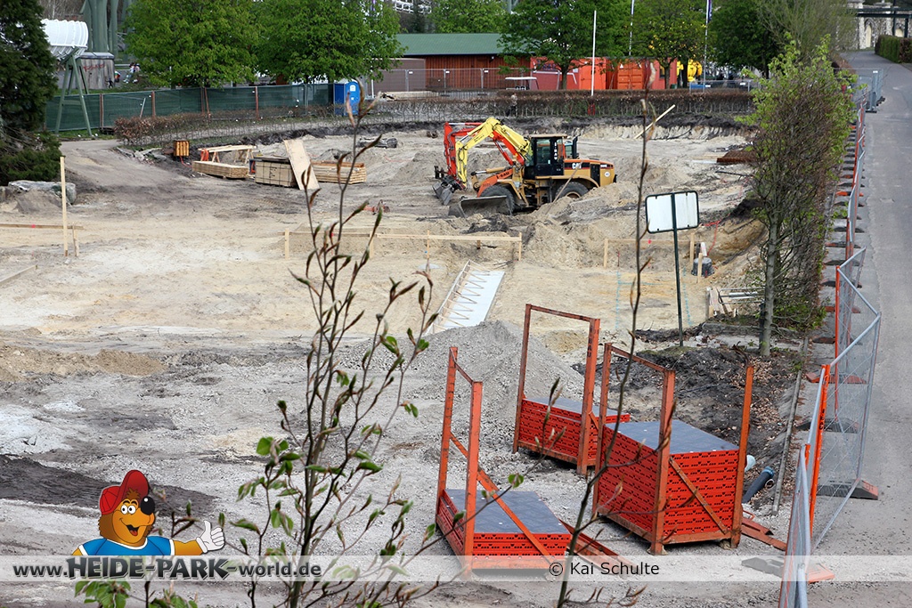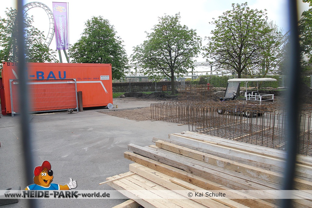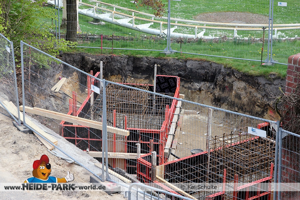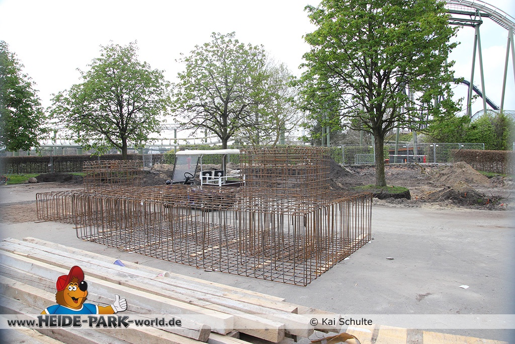 08. Mai 2013 - Vom Wochenende stammen dieses Bilder. Man sieht, dass an vielen Stellen rund um das Areal der ehemaligen Wildwasserbahn II gebuddelt und planiert wird. Die Bewährungseisen für das Fundament bei Big Loop wurden in Form gebracht. Auch oben am Ausgang der Schweizer Bobbahn scheint ein Fundament gegossen zu werden.