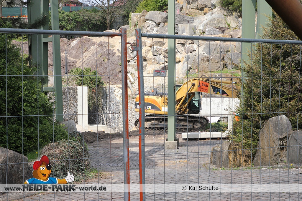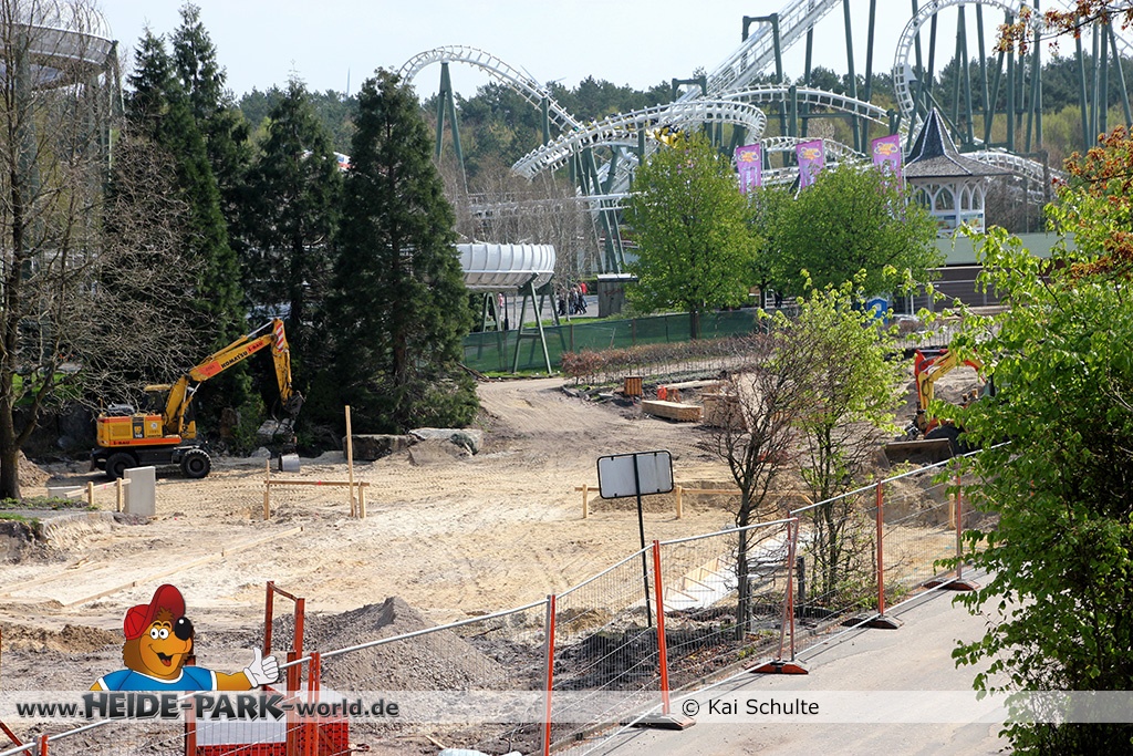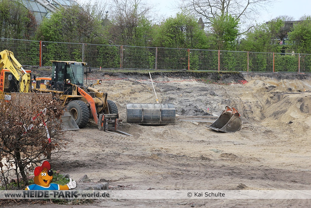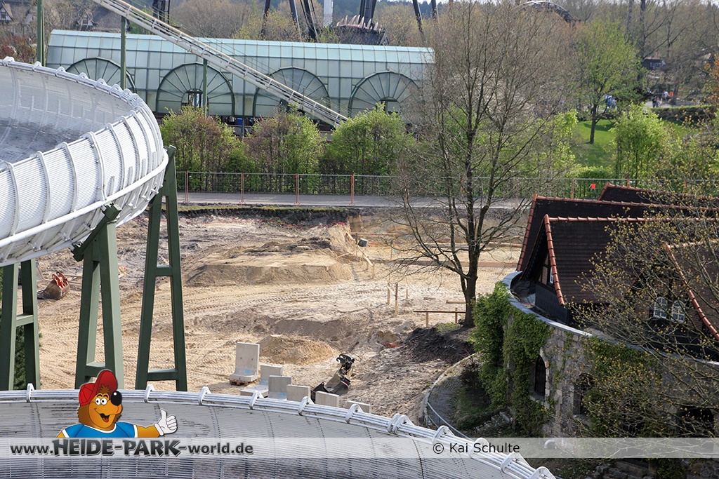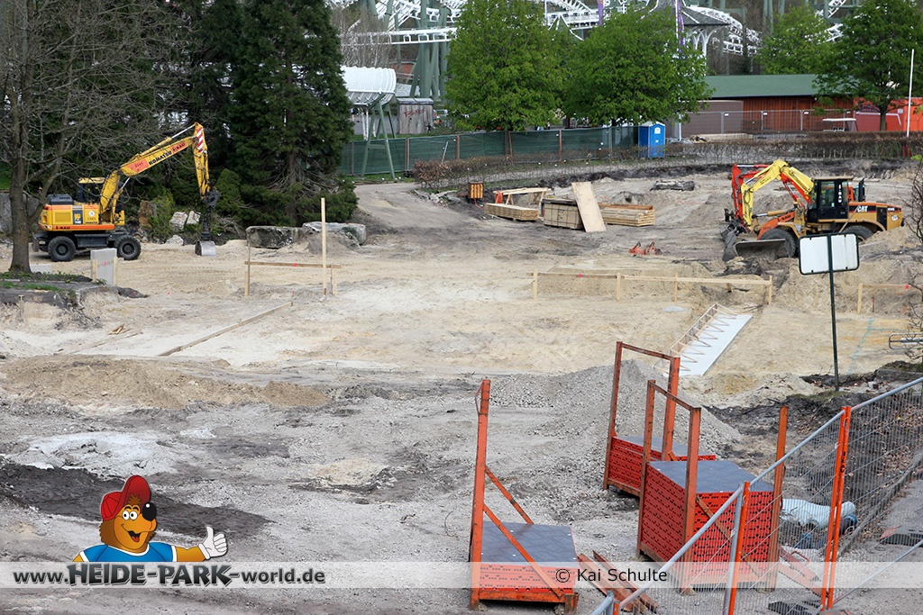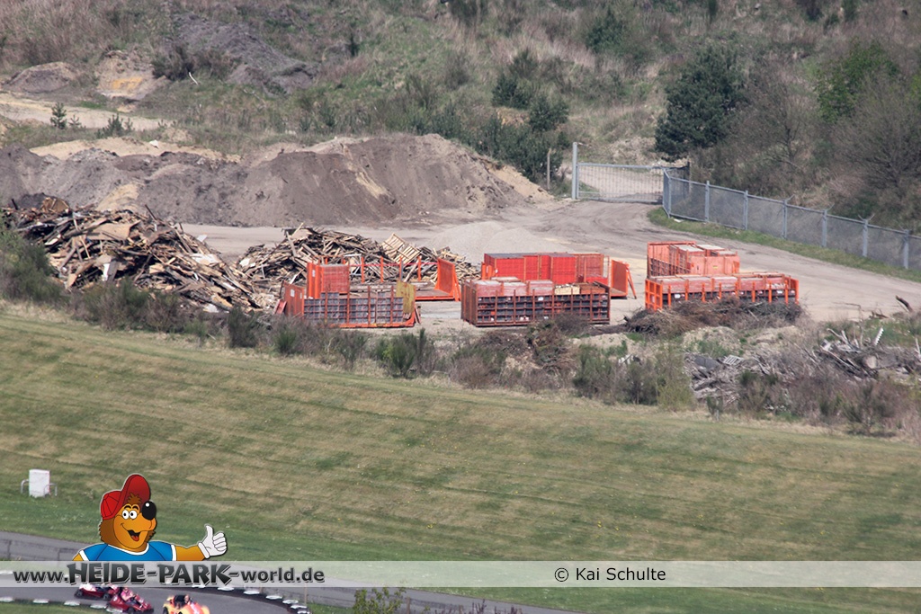 08. Mai 2013 - Vom Wochenende stammen dieses Bilder. Man sieht, dass an vielen Stellen rund um das Areal der ehemaligen Wildwasserbahn II gebuddelt und planiert wird. Die Bewährungseisen für das Fundament bei Big Loop wurden in Form gebracht. Auch oben am Ausgang der Schweizer Bobbahn scheint ein Fundament gegossen zu werden.
