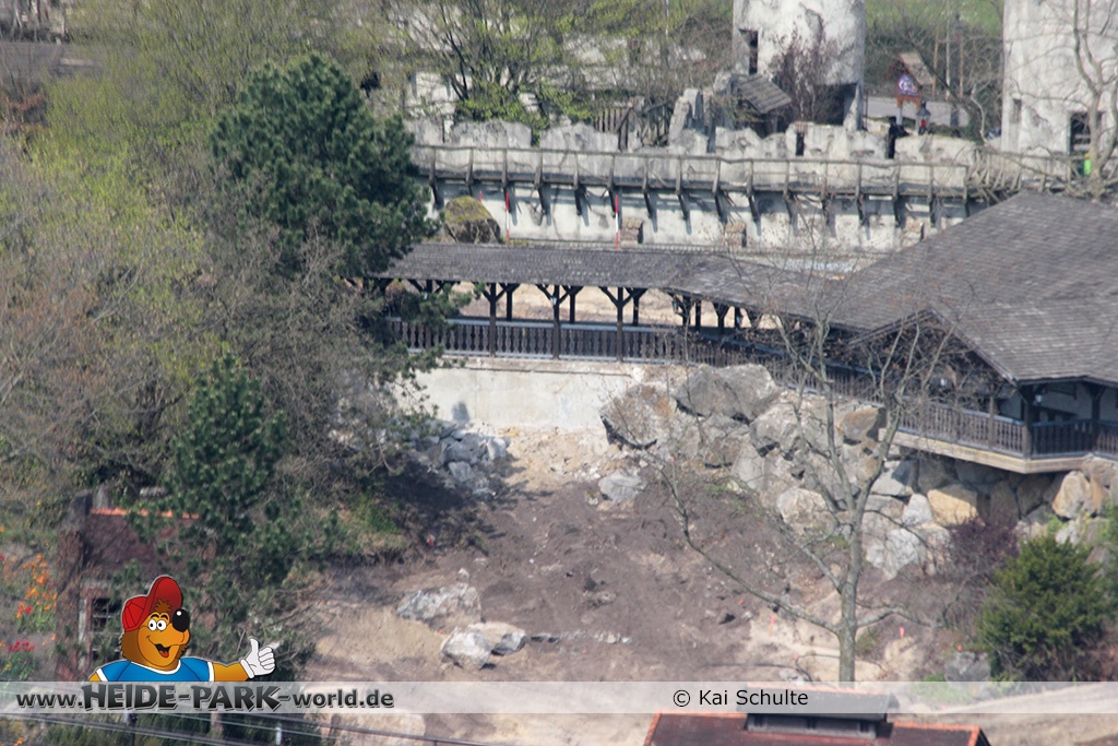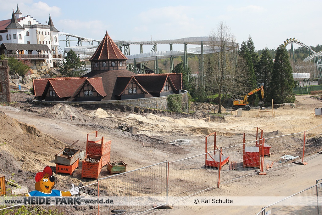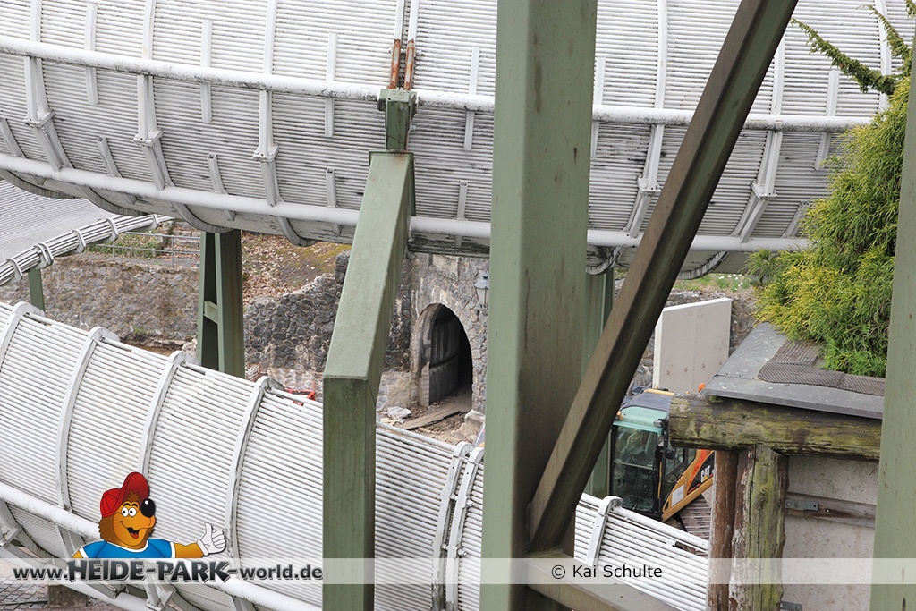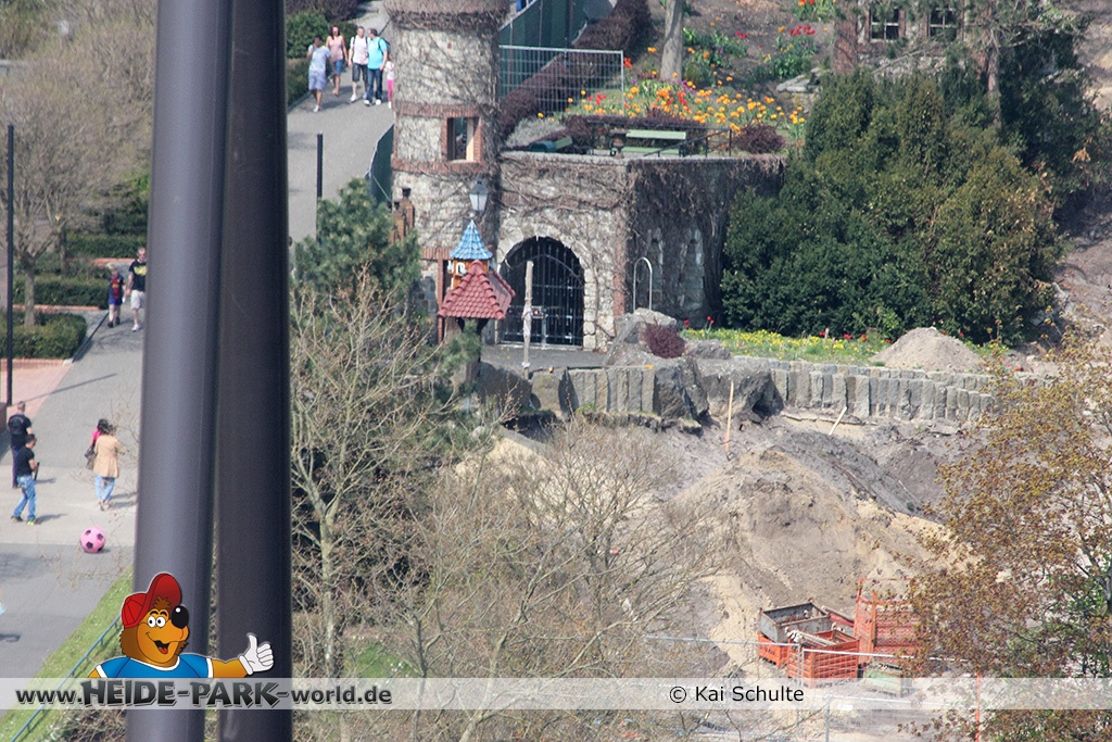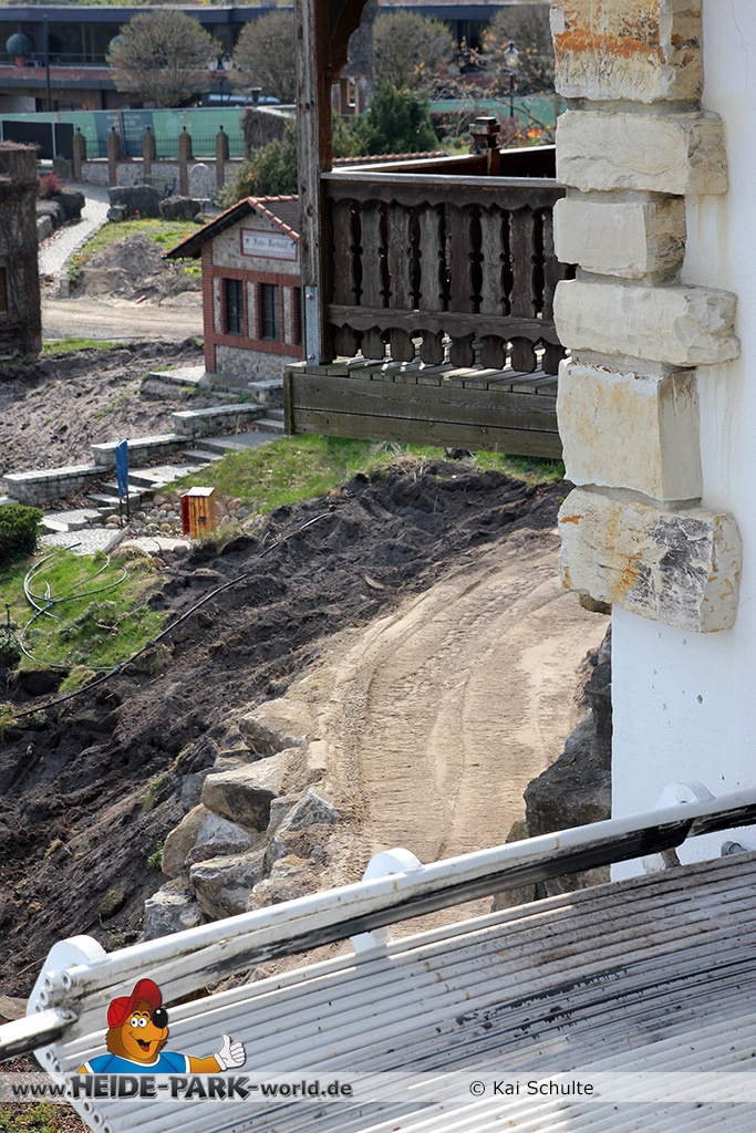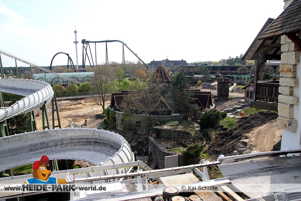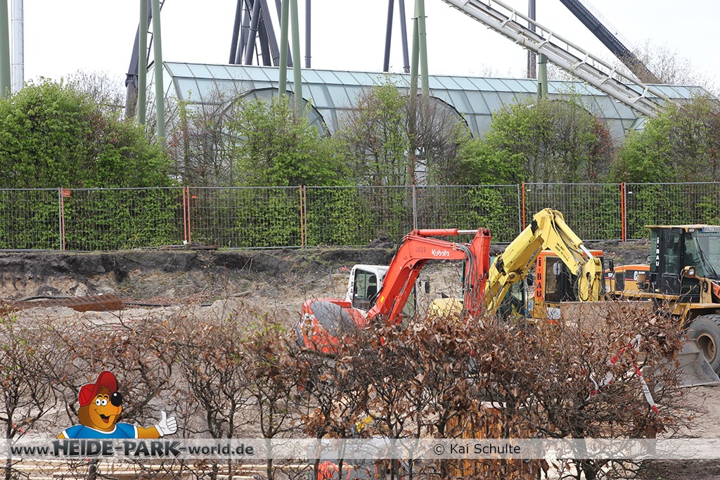08. Mai 2013 - Vom Wochenende stammen dieses Bilder. Man sieht, dass an vielen Stellen rund um das Areal der ehemaligen Wildwasserbahn II gebuddelt und planiert wird. Die Bewährungseisen für das Fundament bei Big Loop wurden in Form gebracht. Auch oben am Ausgang der Schweizer Bobbahn scheint ein Fundament gegossen zu werden.