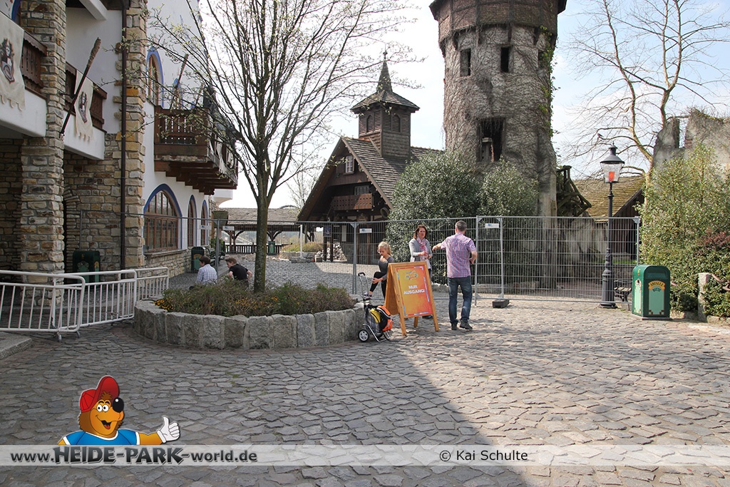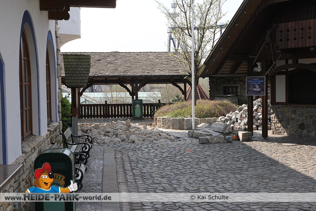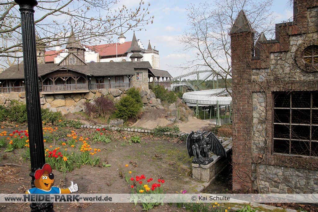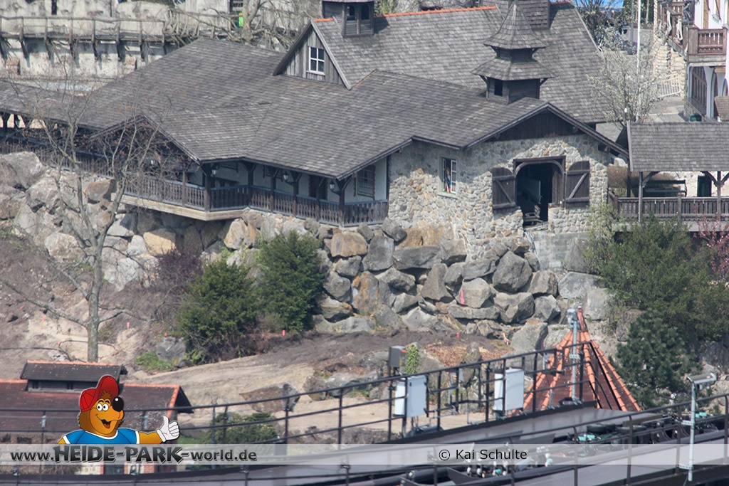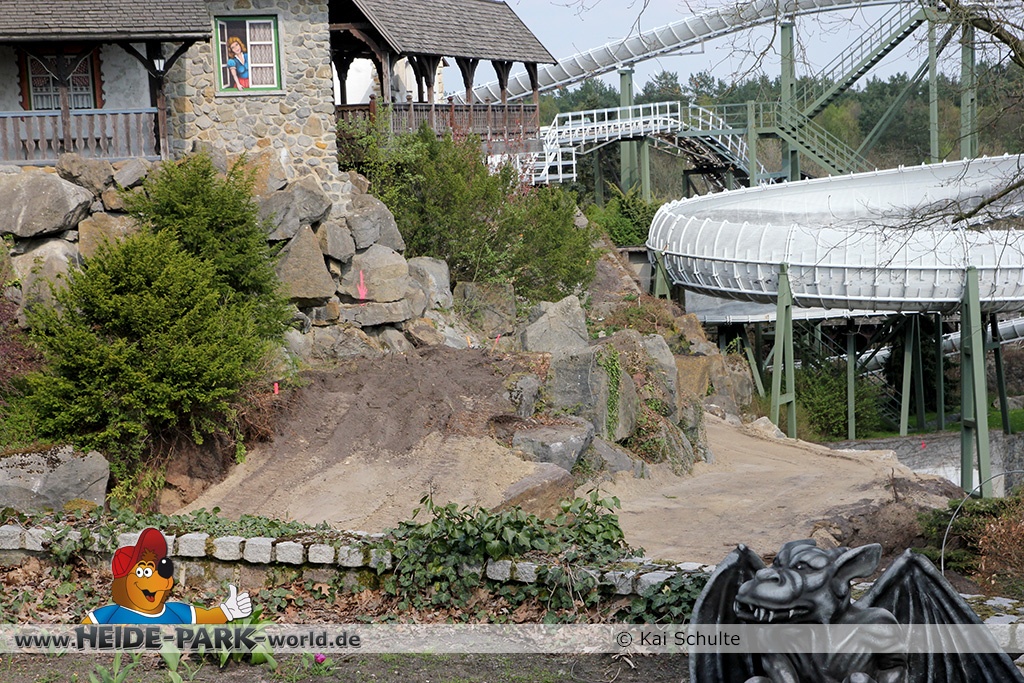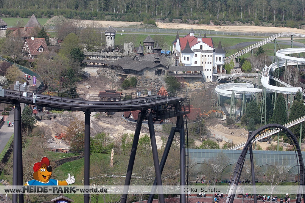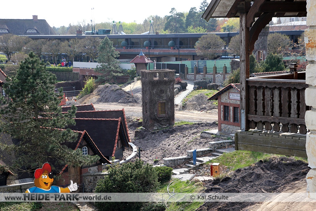 08. Mai 2013 - Vom Wochenende stammen dieses Bilder. Man sieht, dass an vielen Stellen rund um das Areal der ehemaligen Wildwasserbahn II gebuddelt und planiert wird. Die Bewährungseisen für das Fundament bei Big Loop wurden in Form gebracht. Auch oben am Ausgang der Schweizer Bobbahn scheint ein Fundament gegossen zu werden.