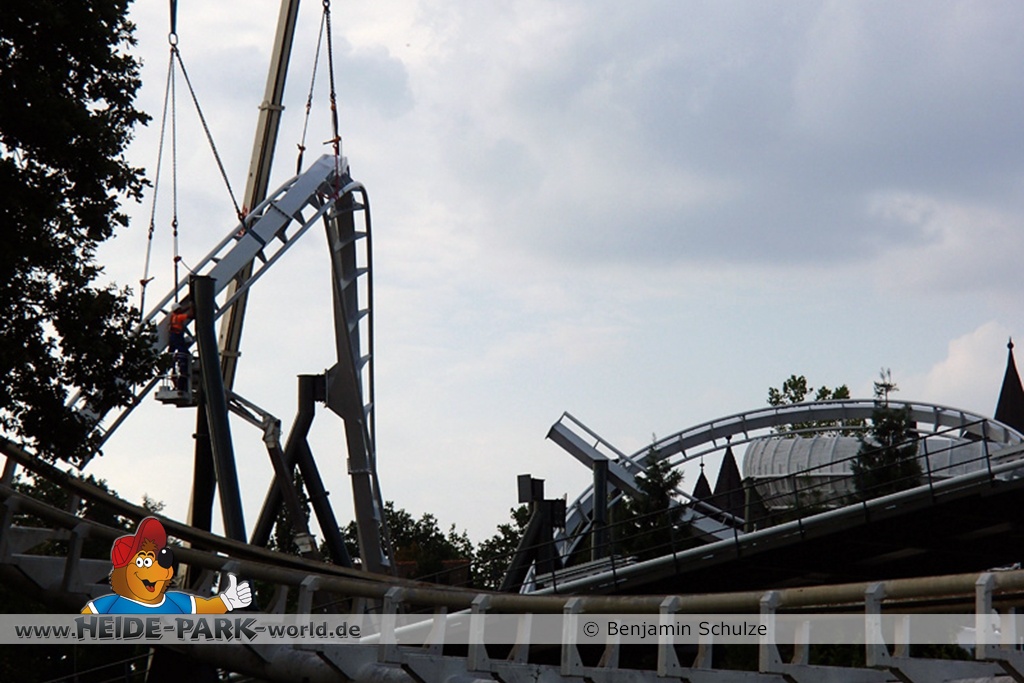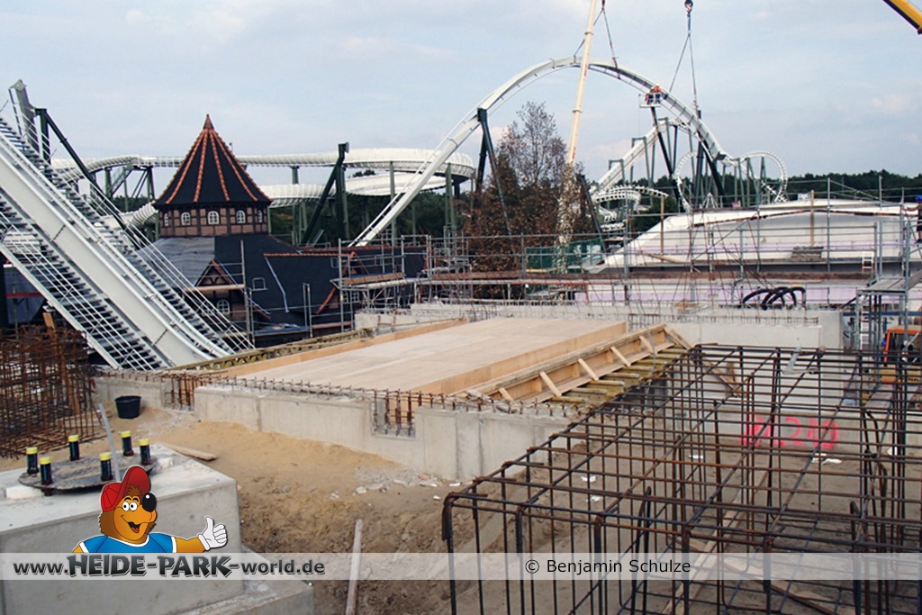 Ebenso wurde gleich nach der „Panorama Kurve“ an dem sogenannten „Brezel Knot“, welcher aus 2 Inversionen besteht, weitergearbeitet und die erste Inversion von diesem montiert. Doch damit nicht genug: Außerdem begann man mit der Montage des Dive Drops, damit dieser demnächst eingetunnelt werden kann. Aber auch an anderer Stelle wird fleißig gebaut: Die Bodenplatte für den späteren Shop wurde gegossen. Parallel dazu wurde die Verschalung bei der darunter liegenden Mauer entfernt.