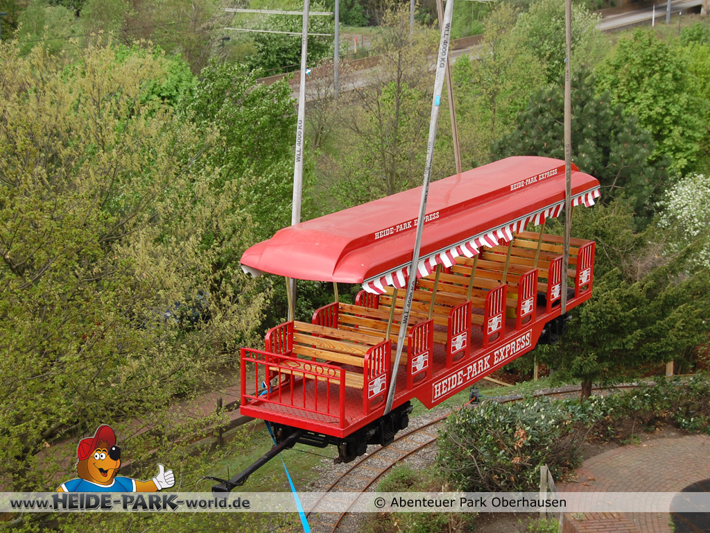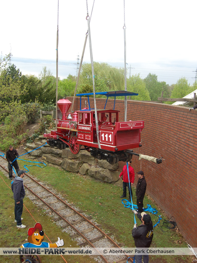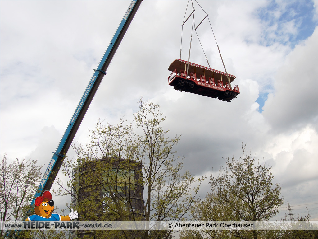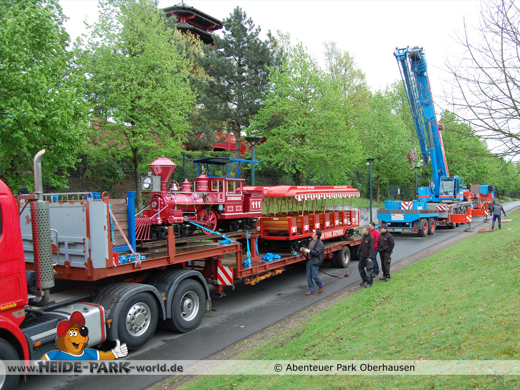 15. April 2014 - UFO-Alarm in Oberhausen!? Nein, es war kein klassisches UFO, das am 8. April früh morgens plötzlich über den Baumkronen des Abenteuer Park Oberhausen schwebte, sondern eine der drei neuen Familienattraktionen, die der Freizeitpark in der Saison 2014 präsentiert. Genauer gesagt war es eine rote Lok, die aus dem Heide Park Resort stammt.