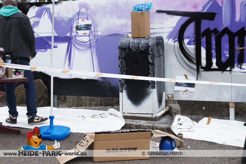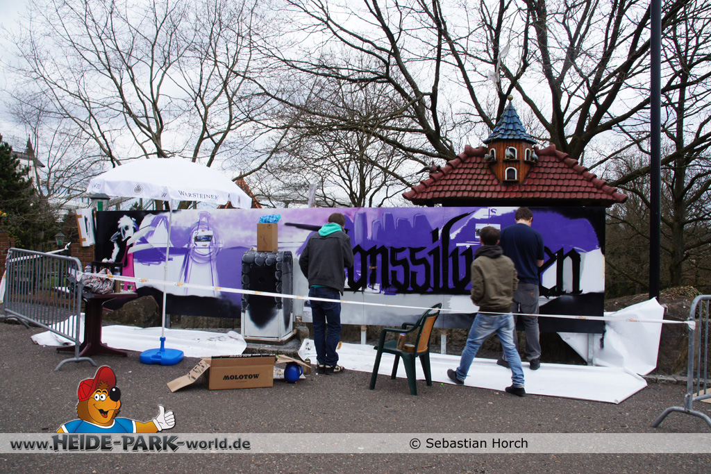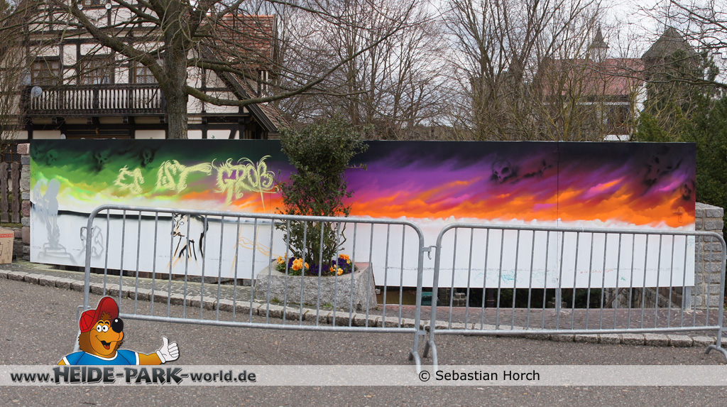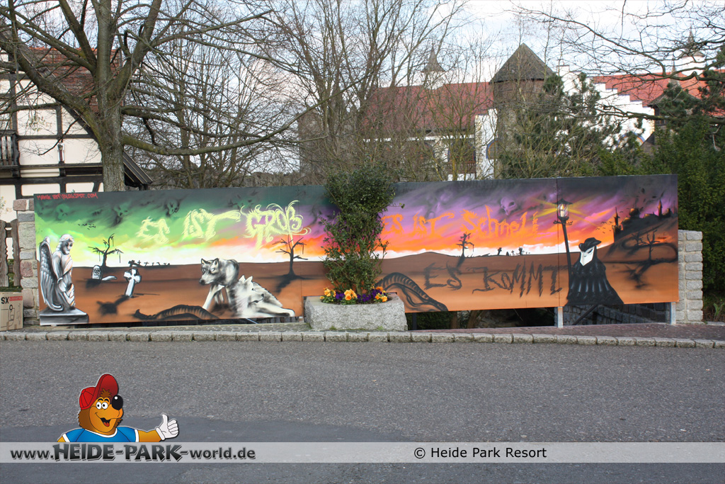 Marko Engelmann gestaltete die Wand am Scream, welche einen schaurigen Ausblick auf die Neuheit 2014 geben soll. Viel ist jedoch nicht hineinzuinterpretieren. Die zweite Wand, welche den Zugang gegenüber der Verwaltung absperrt, wurde in Gemeinschaftsarbeit von Nikolai Proskurin, Marek Ruhanen und Chris Schumann gestaltet. Sie stellt einen Überblick über den Themenbereich "Transsilvanien" dar. Sehr gut zu erkennen ist der Scream Tower. Für diese Aktion verbrauchten alle vier Sprayer weit mehr als 100 Spraydosen.