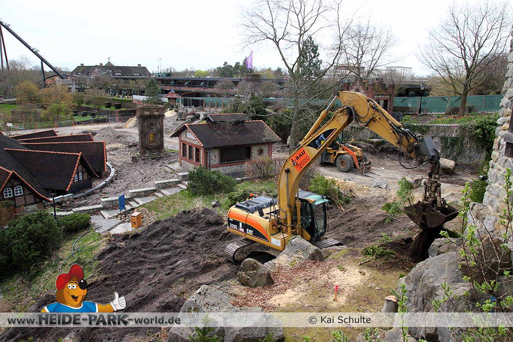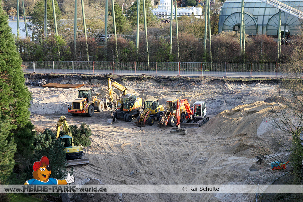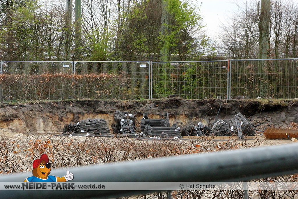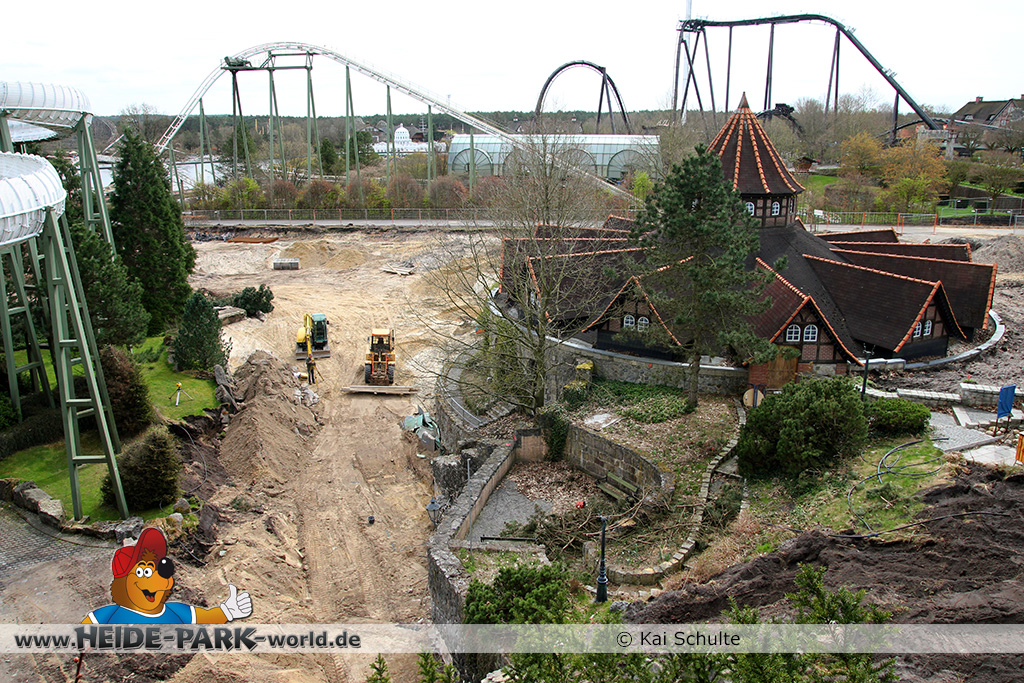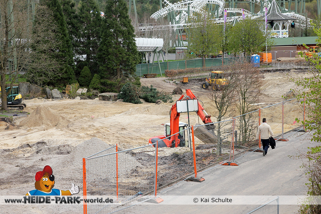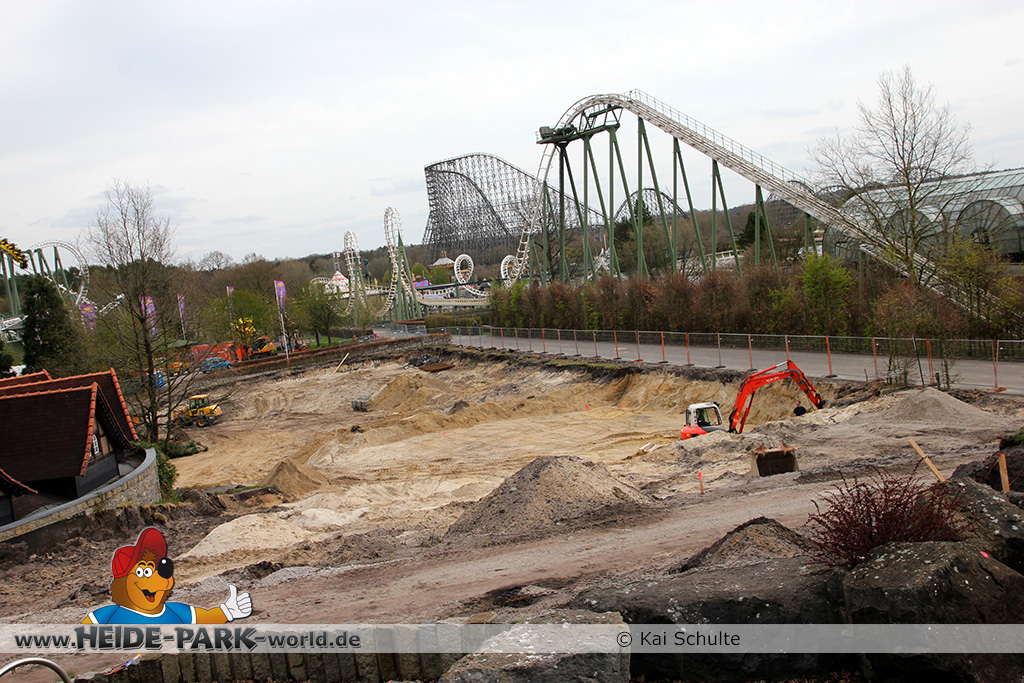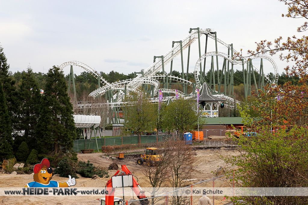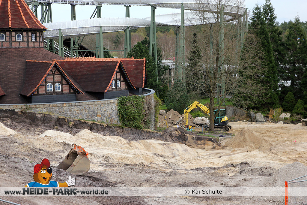 30. April 2013 - Pünktlich zur ersten Walpurgisnacht im Heide Park Resort geht es auch mit den Arbeiten auf der Baustelle weiter. An Big Loop sowie im Bereich des Auslaufs der ehemaligen Wildwasserbahn wurden die ersten Fundamente gegossen. Der Bauzaun wurde mit einem grünen Sichtschutz zugehangen. Ähnliches geschah auch beim Bau der Krake vor drei Jahren. Im Bereich unterhalb des Balkons am Ausgang der Bobbahn sowie am ehemaligen Zugang gegenüber der Verwaltung finden noch immer Erdarbeiten statt.