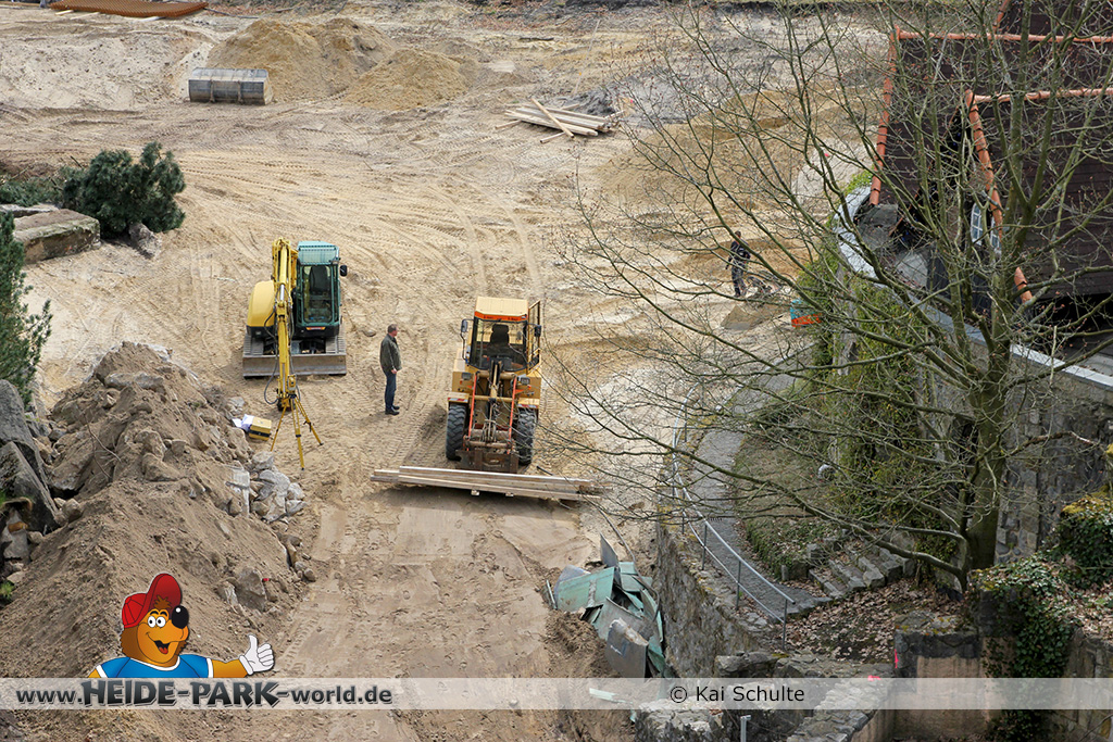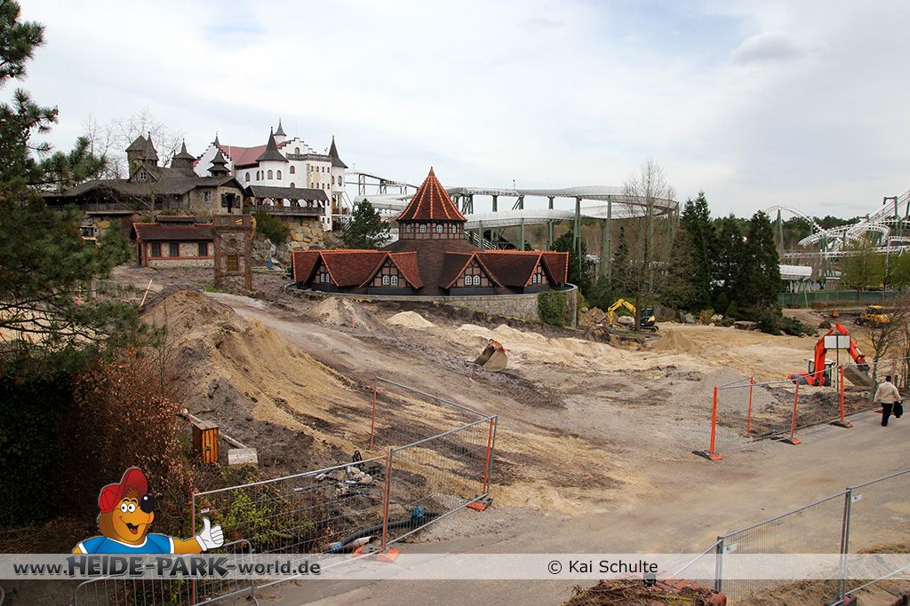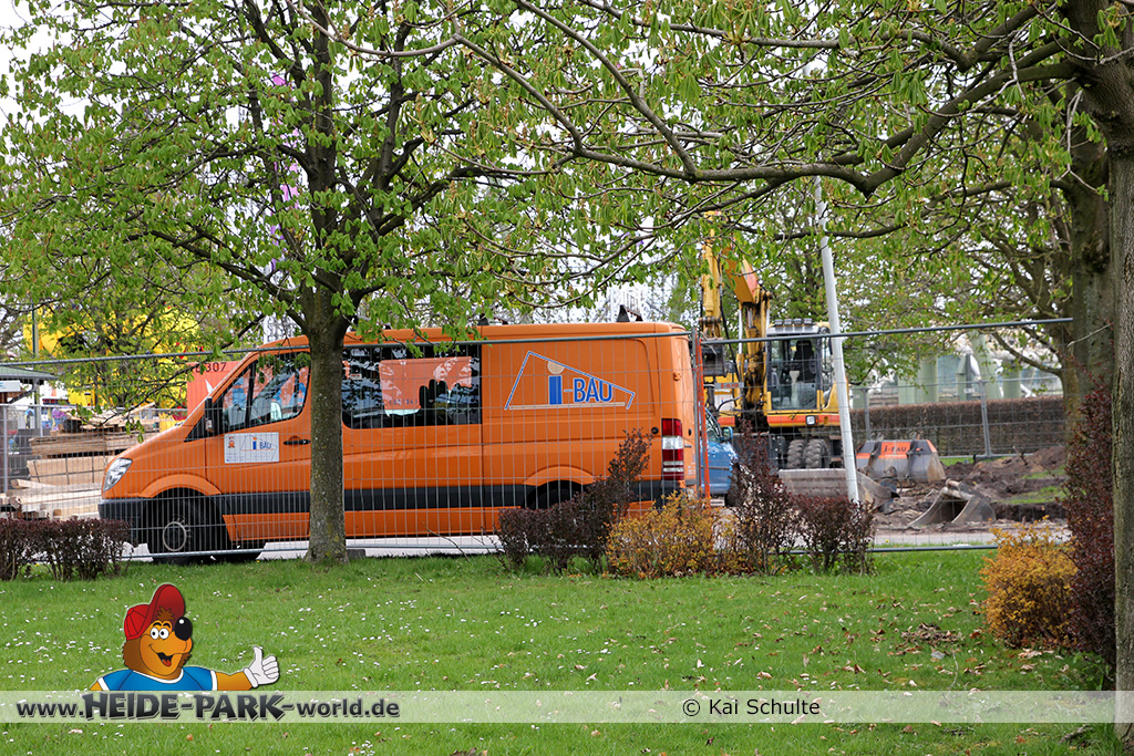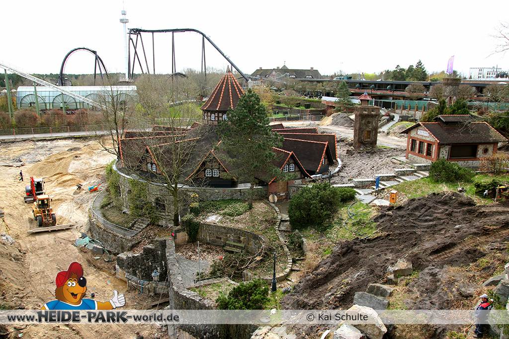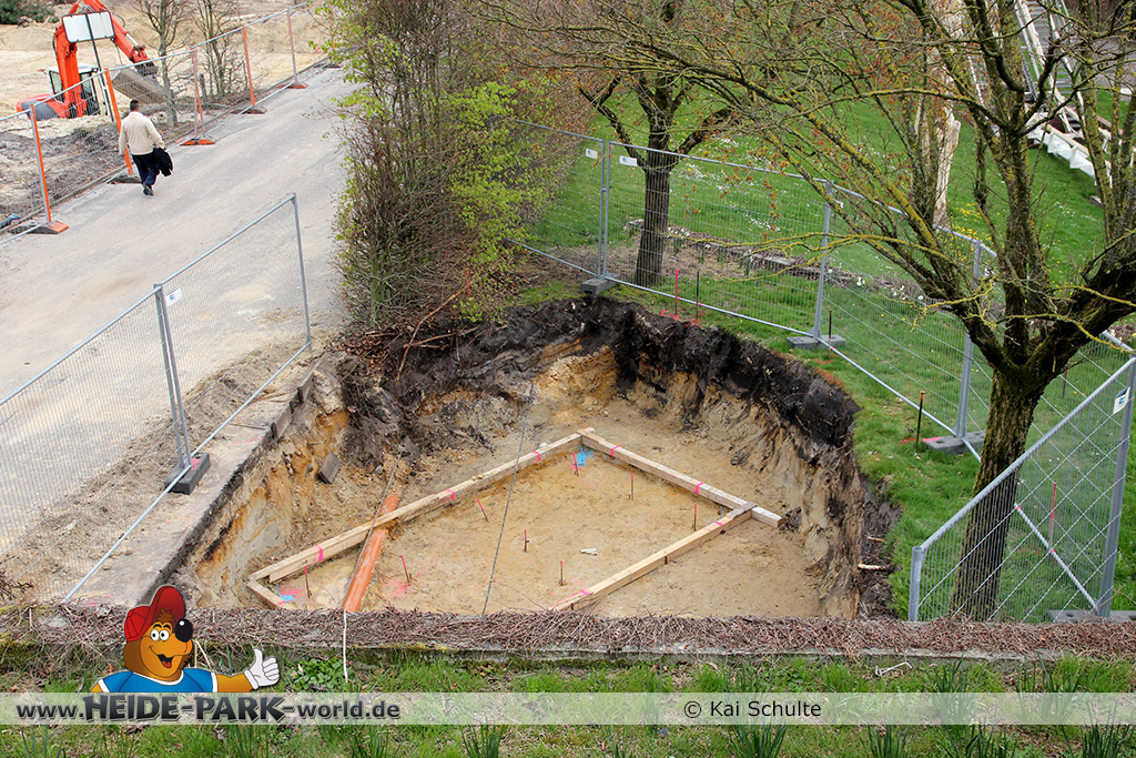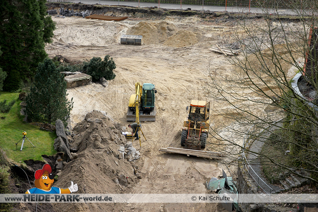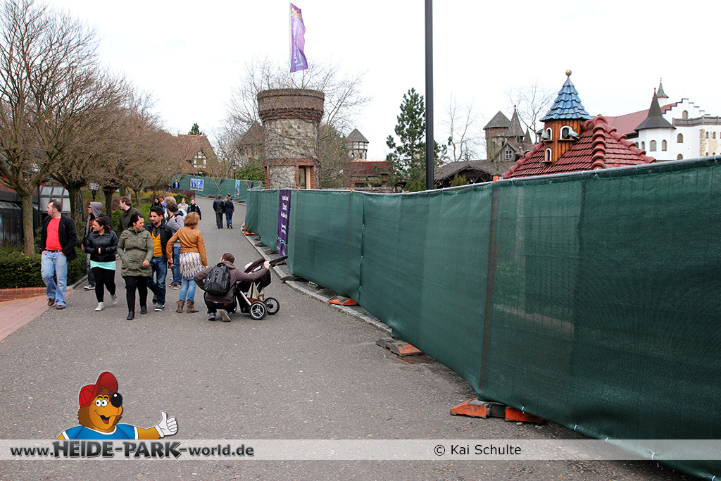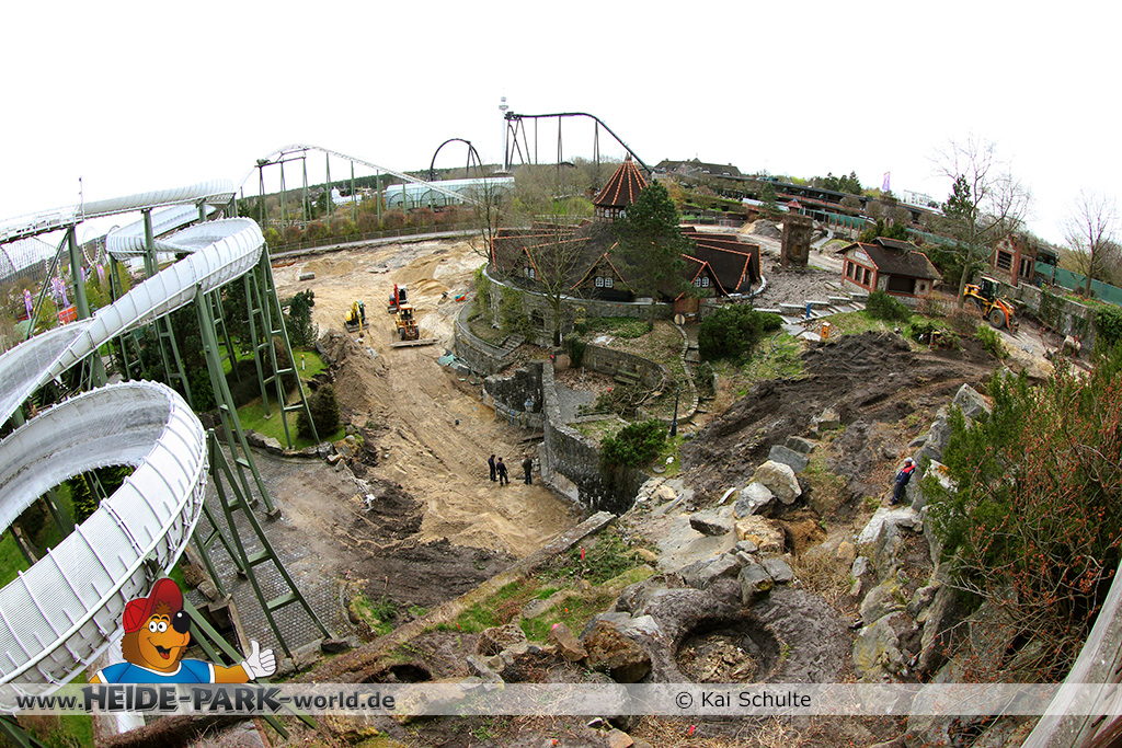 30. April 2013 - Pünktlich zur ersten Walpurgisnacht im Heide Park Resort geht es auch mit den Arbeiten auf der Baustelle weiter. An Big Loop sowie im Bereich des Auslaufs der ehemaligen Wildwasserbahn wurden die ersten Fundamente gegossen. Der Bauzaun wurde mit einem grünen Sichtschutz zugehangen. Ähnliches geschah auch beim Bau der Krake vor drei Jahren. Im Bereich unterhalb des Balkons am Ausgang der Bobbahn sowie am ehemaligen Zugang gegenüber der Verwaltung finden noch immer Erdarbeiten statt.