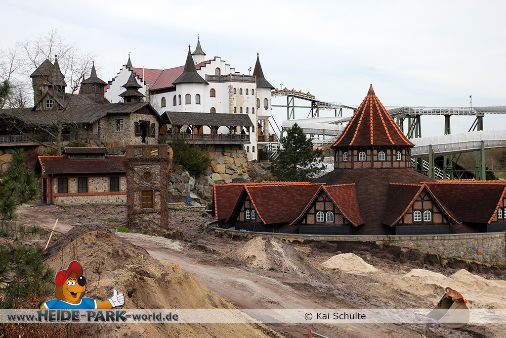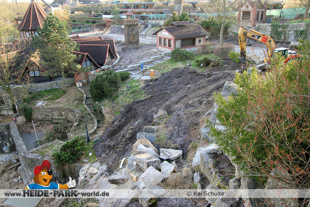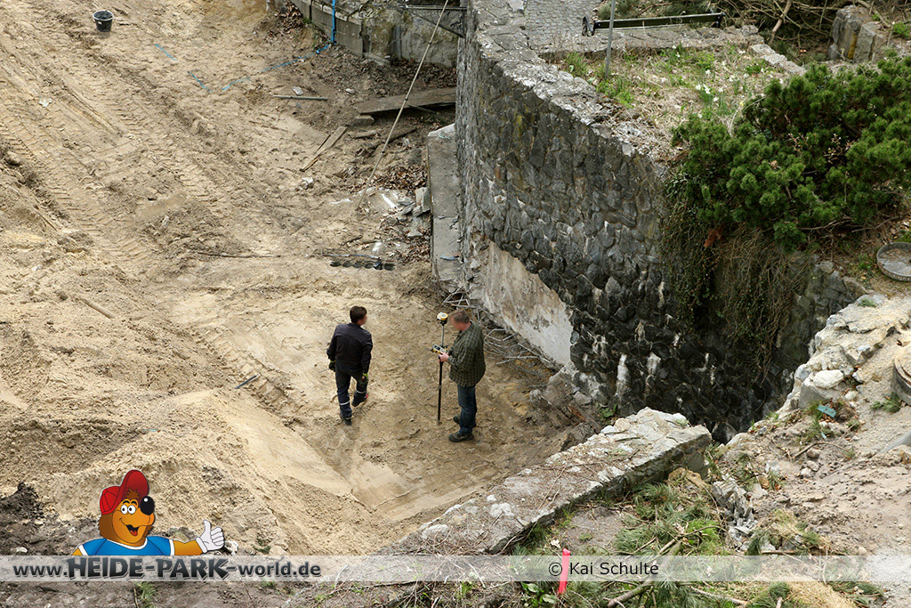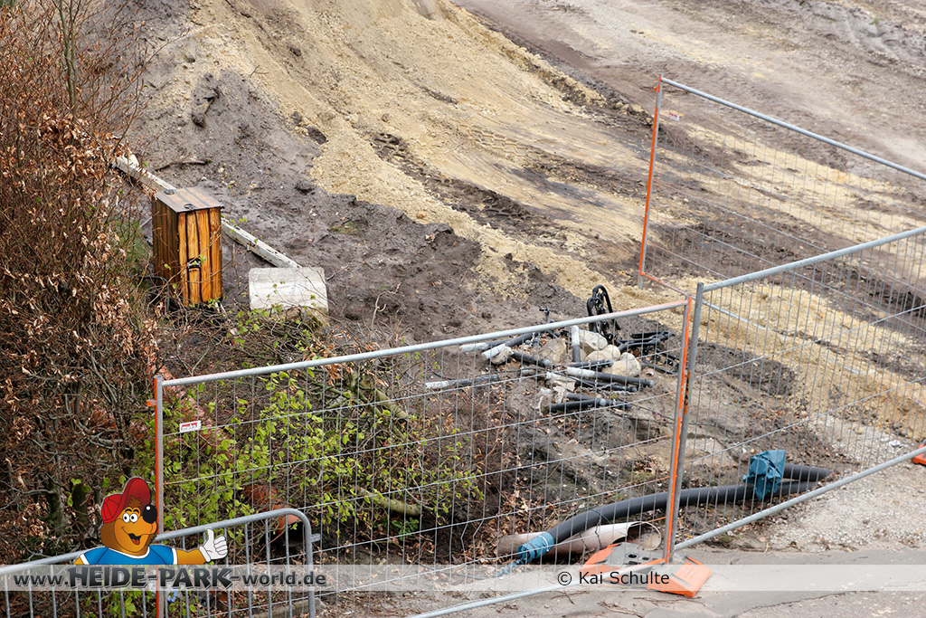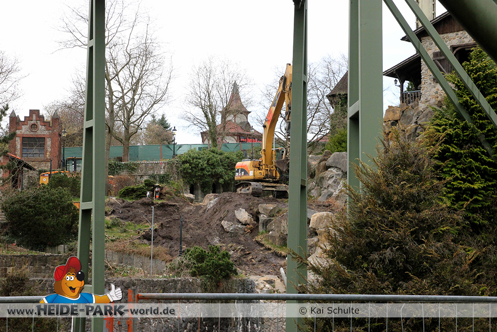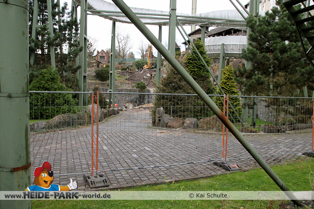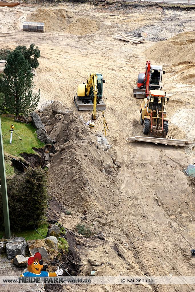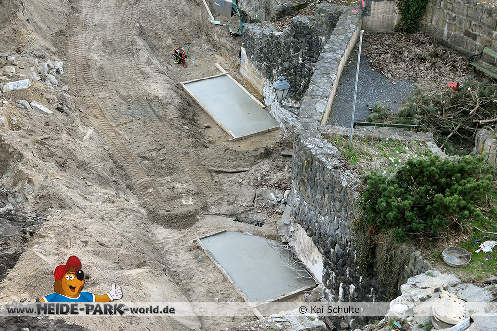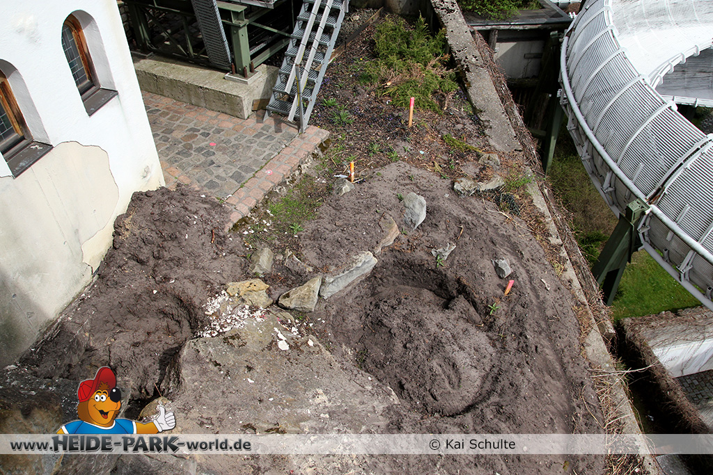 30. April 2013 - Pünktlich zur ersten Walpurgisnacht im Heide Park Resort geht es auch mit den Arbeiten auf der Baustelle weiter. An Big Loop sowie im Bereich des Auslaufs der ehemaligen Wildwasserbahn wurden die ersten Fundamente gegossen. Der Bauzaun wurde mit einem grünen Sichtschutz zugehangen. Ähnliches geschah auch beim Bau der Krake vor drei Jahren. Im Bereich unterhalb des Balkons am Ausgang der Bobbahn sowie am ehemaligen Zugang gegenüber der Verwaltung finden noch immer Erdarbeiten statt.