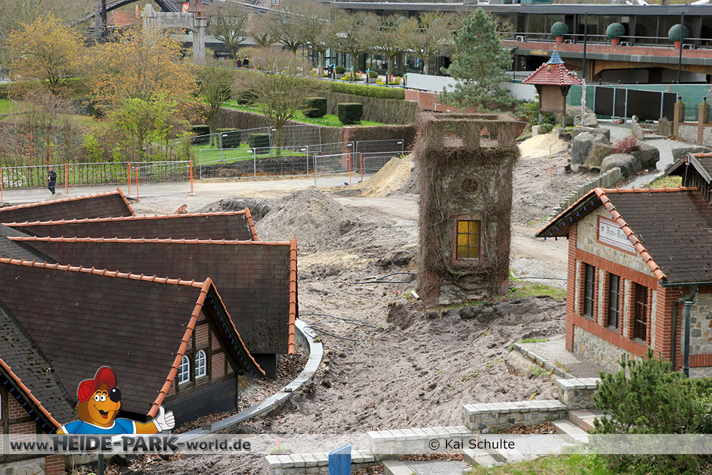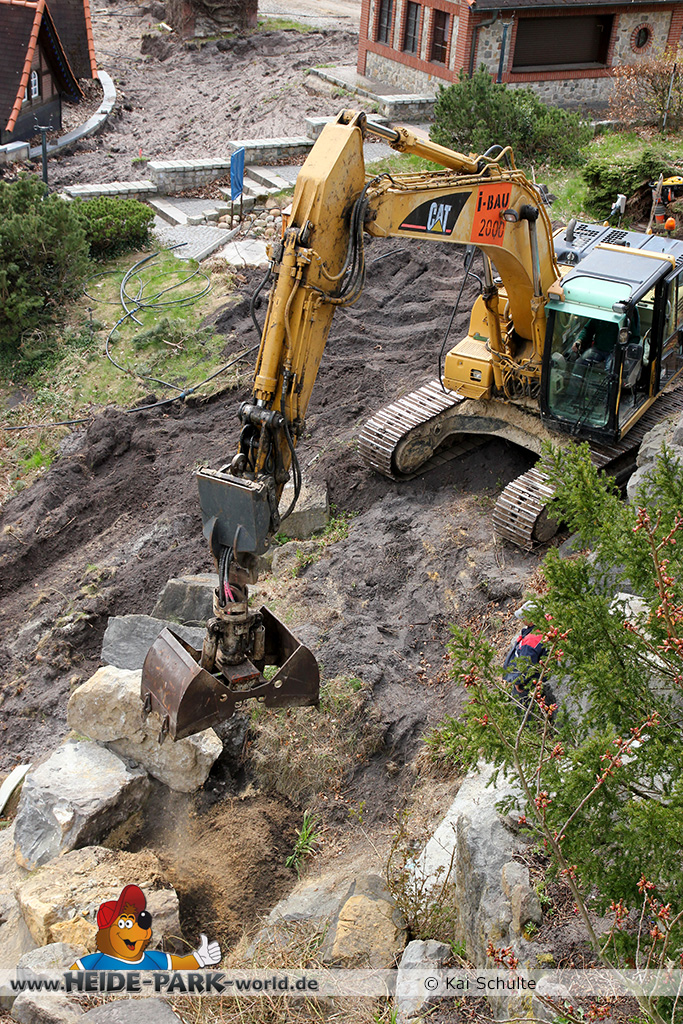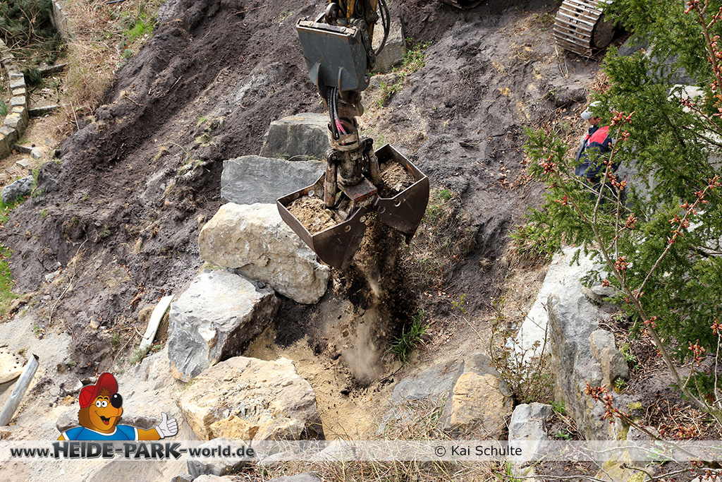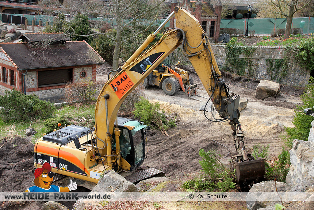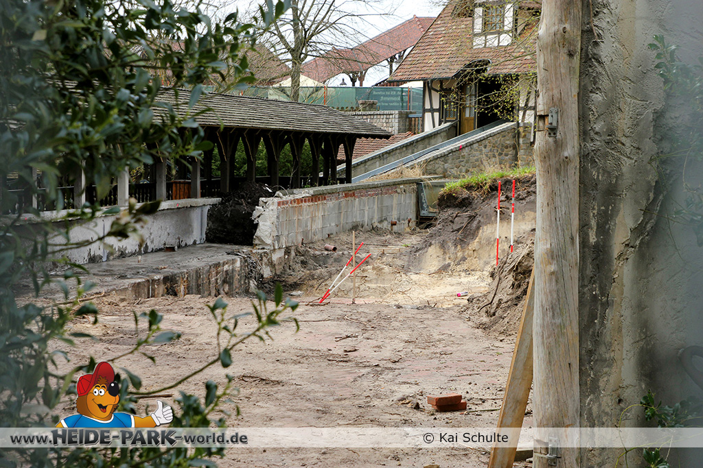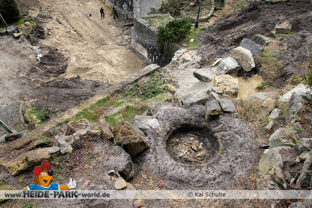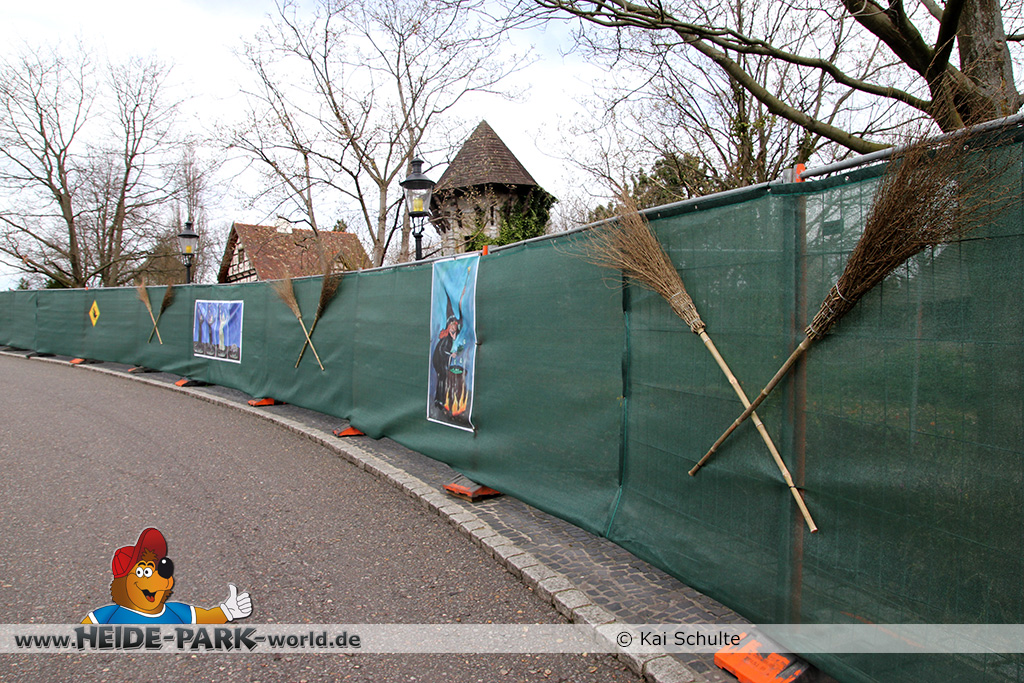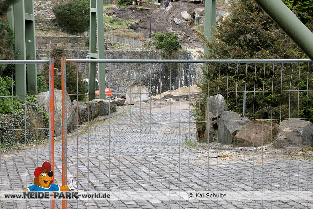30. April 2013 - Pünktlich zur ersten Walpurgisnacht im Heide Park Resort geht es auch mit den Arbeiten auf der Baustelle weiter. An Big Loop sowie im Bereich des Auslaufs der ehemaligen Wildwasserbahn wurden die ersten Fundamente gegossen. Der Bauzaun wurde mit einem grünen Sichtschutz zugehangen. Ähnliches geschah auch beim Bau der Krake vor drei Jahren. Im Bereich unterhalb des Balkons am Ausgang der Bobbahn sowie am ehemaligen Zugang gegenüber der Verwaltung finden noch immer Erdarbeiten statt.