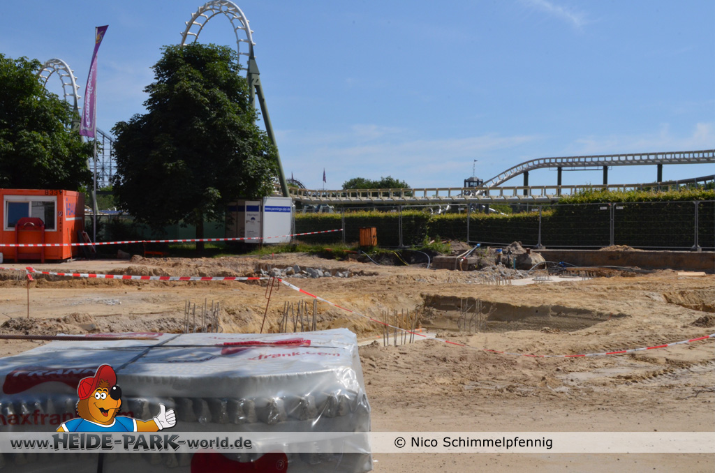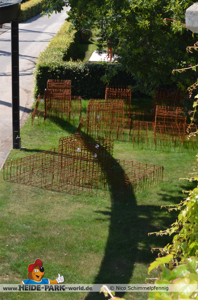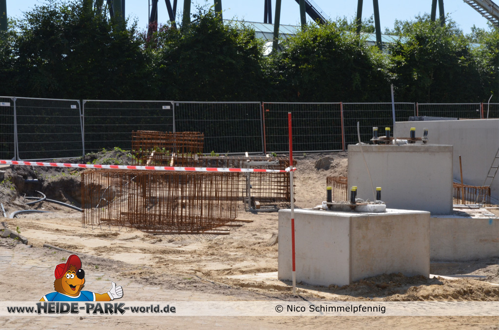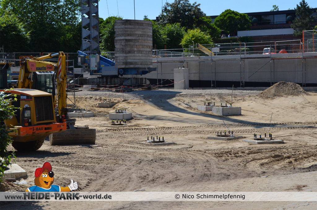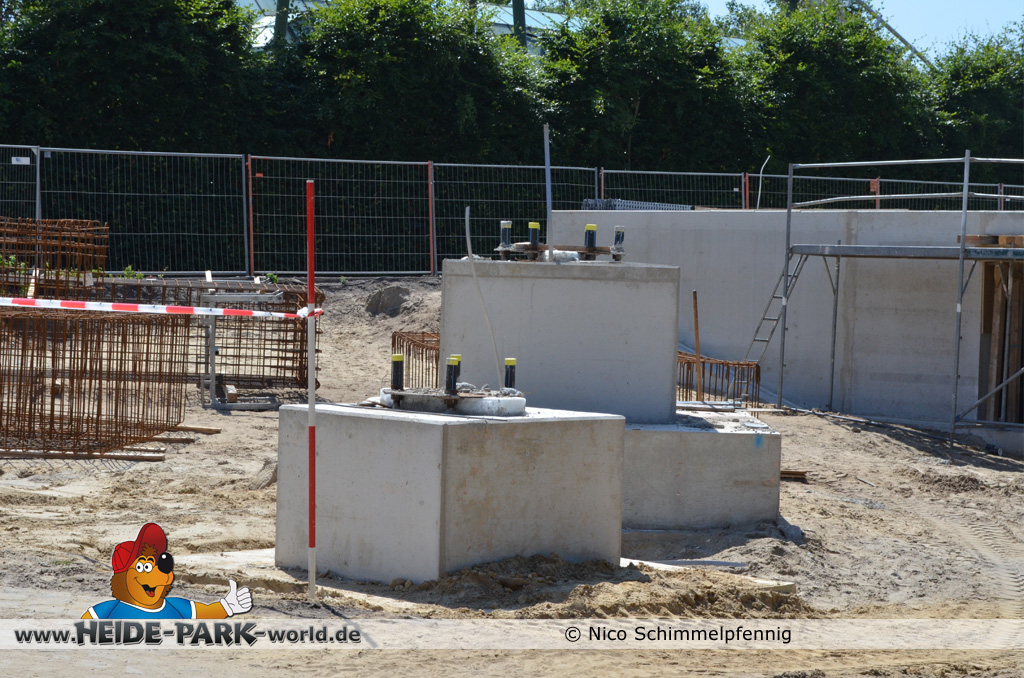 07. Juli 2013 - Auf der Baustelle geht es weiter voran. Immer mehr Fundamente werden gegossen und fertig gestellt, damit bald alles rechtzeitig zum Aufbau der Bahn fertig ist. Weitere Metallbewährungsgitter stehen zum Bau für die Fundamente bereit. Auch Boden- und Planierarbeiten fanden weiterhin statt.