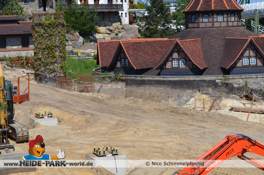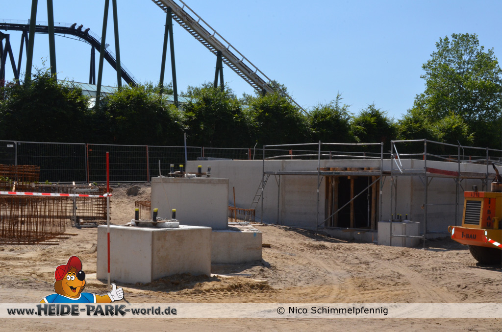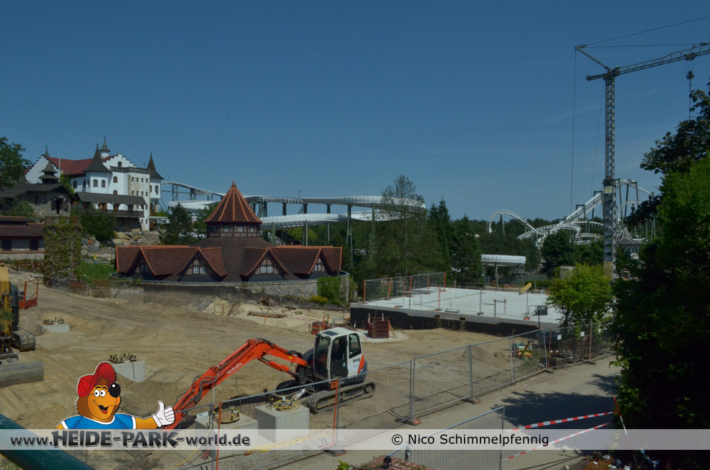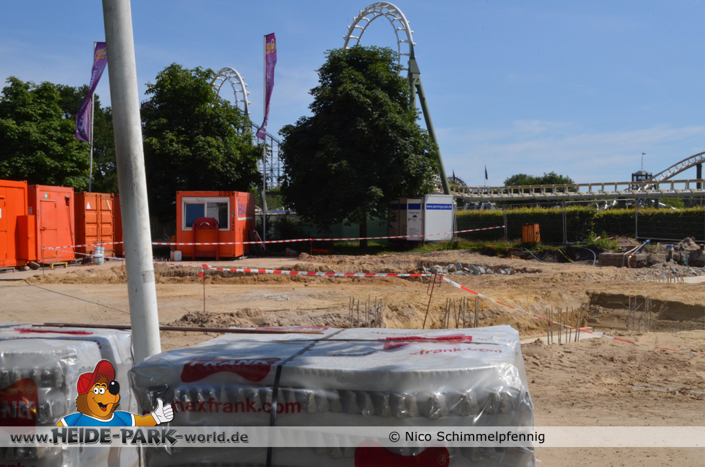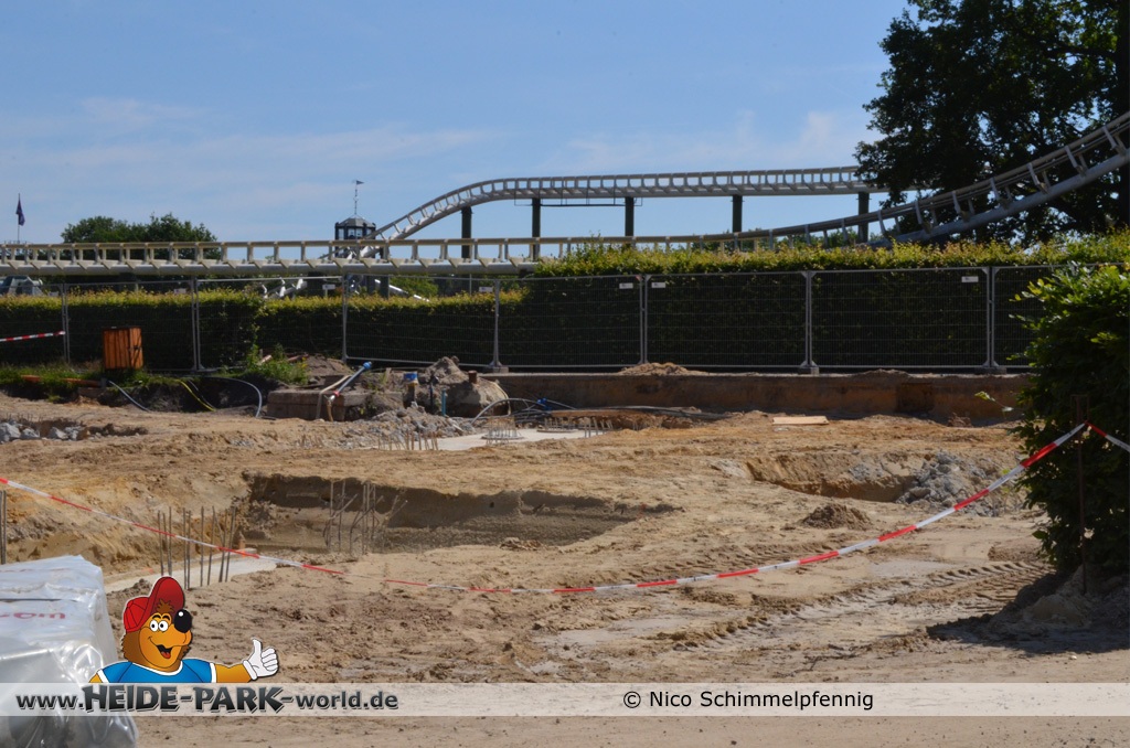 07. Juli 2013 - Auf der Baustelle geht es weiter voran. Immer mehr Fundamente werden gegossen und fertig gestellt, damit bald alles rechtzeitig zum Aufbau der Bahn fertig ist. Weitere Metallbewährungsgitter stehen zum Bau für die Fundamente bereit. Auch Boden- und Planierarbeiten fanden weiterhin statt.