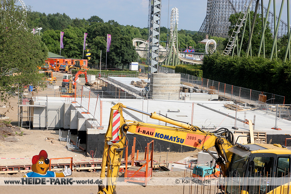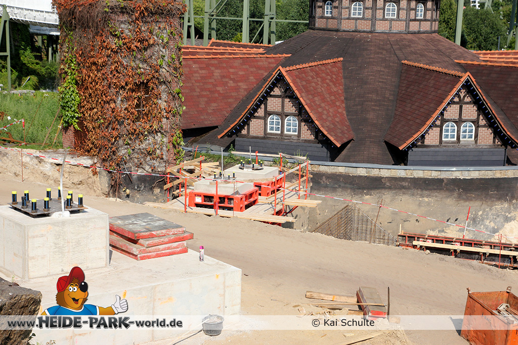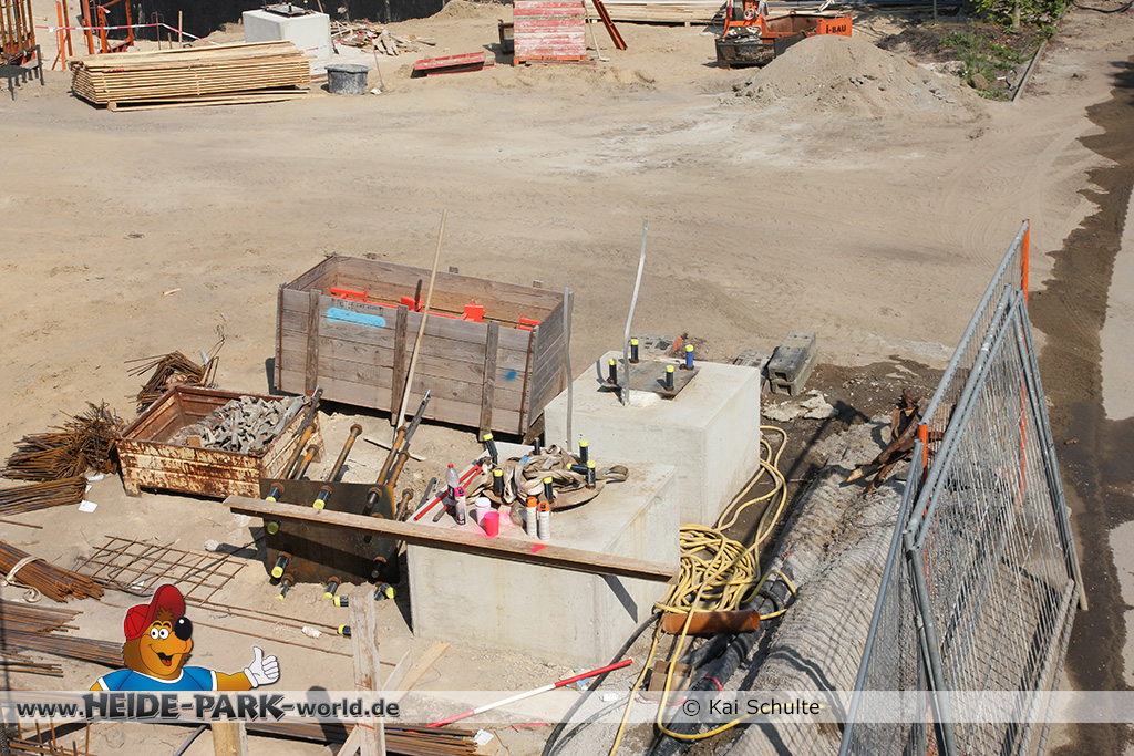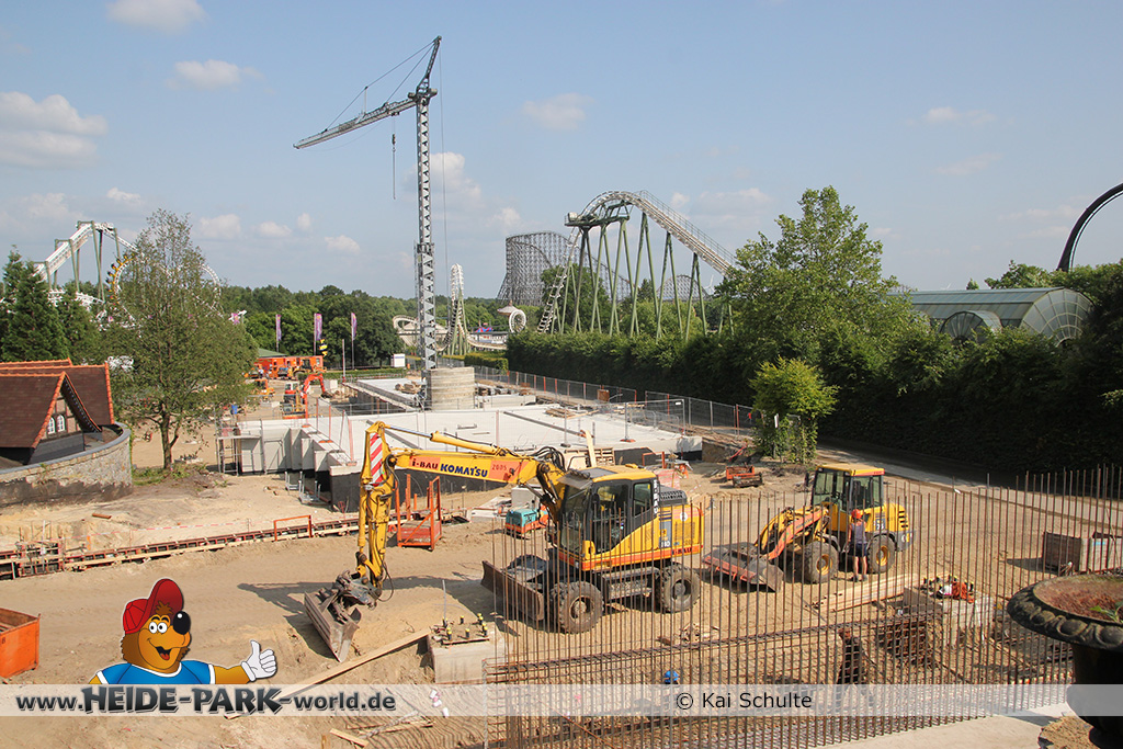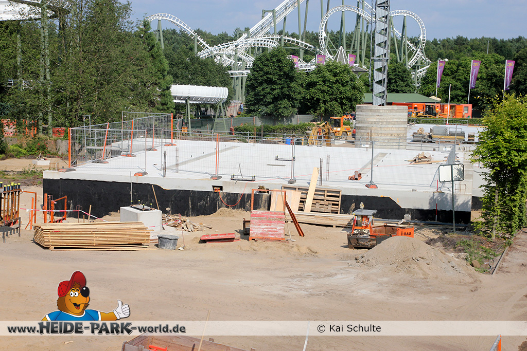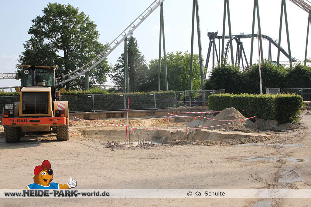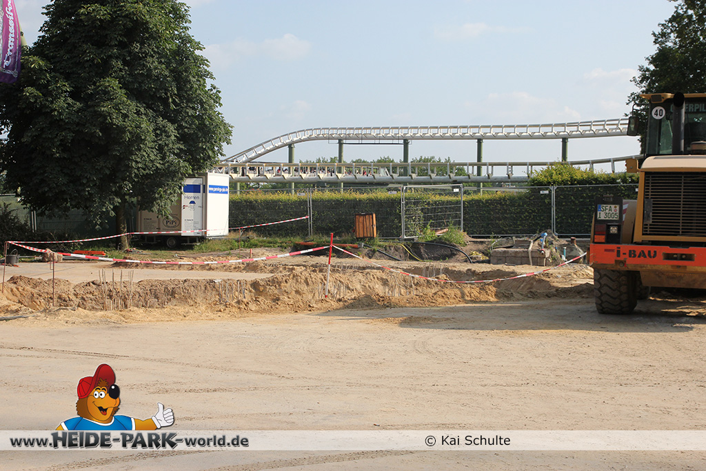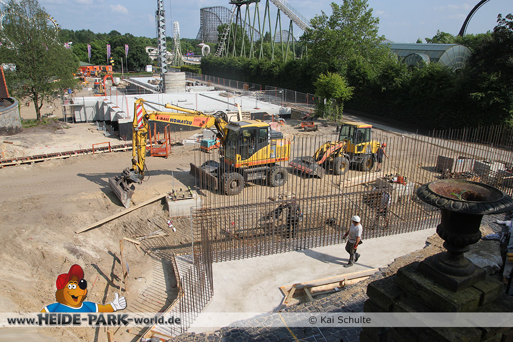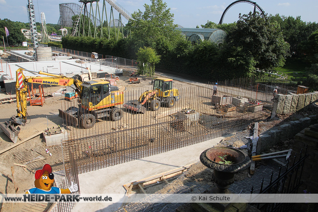 12./14. Juli 2014 - Auch in dieser Woche wurde auf der Baustelle zur neuen Attraktion 2014 gearbeitet. Auf den ersten Blick fallen neue Stahlstangen auf, die parallel zum Weg zu Scream verlaufen. Des weiteren fanden wieder Arbeiten an den Fundamenten statt, die später die Stützen tragen.