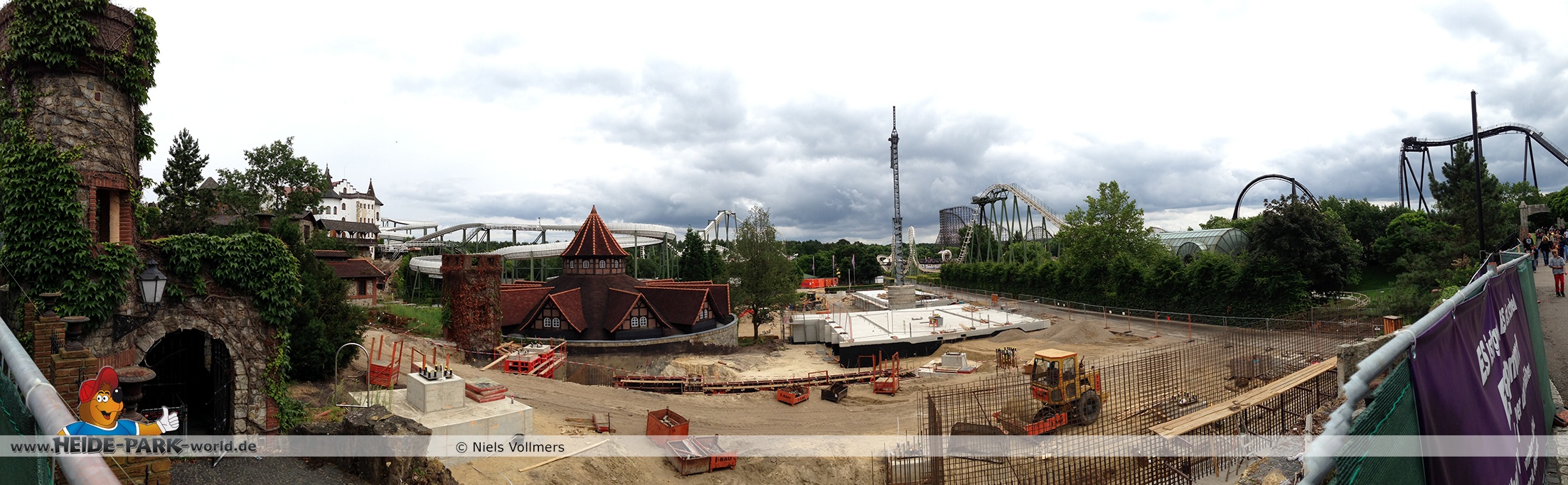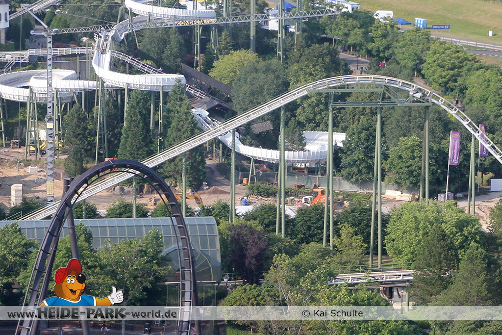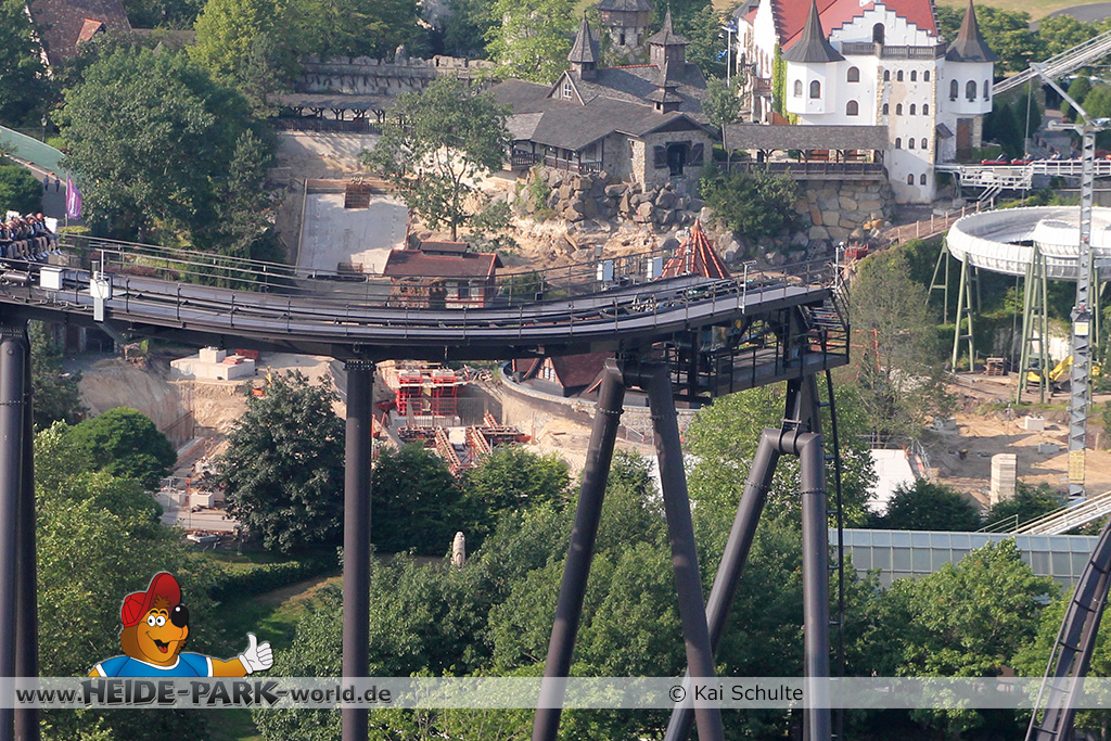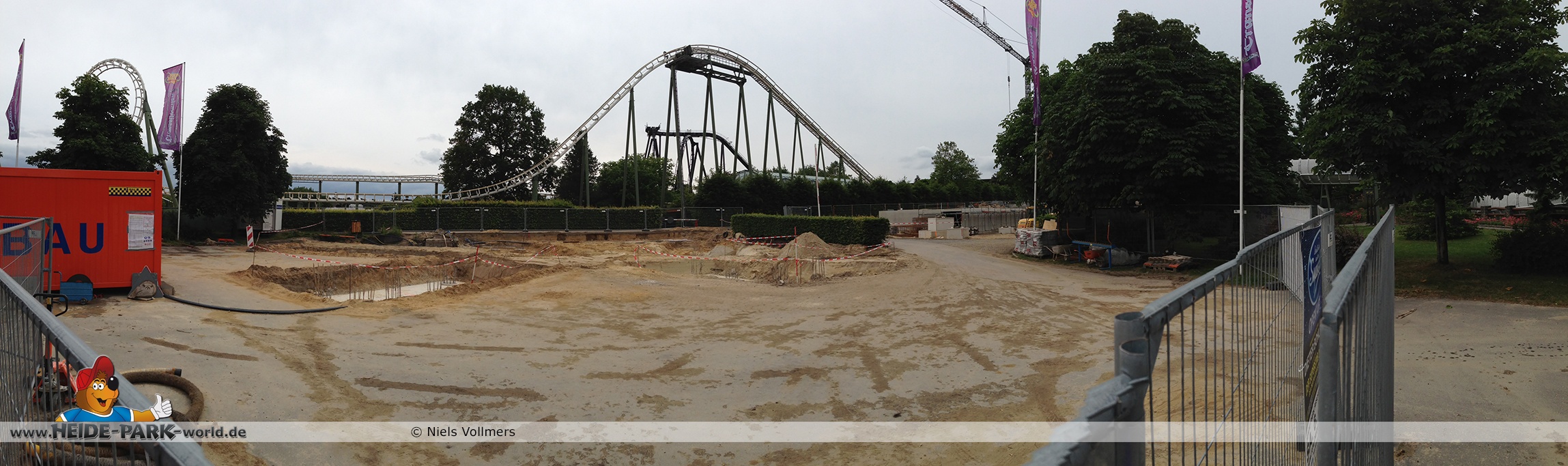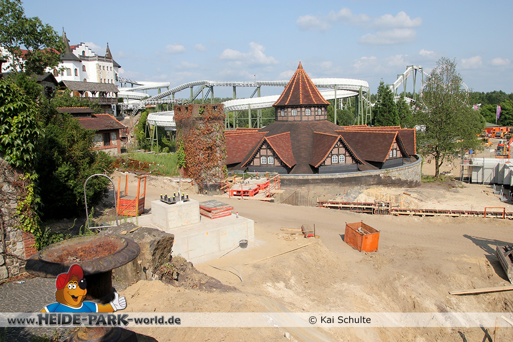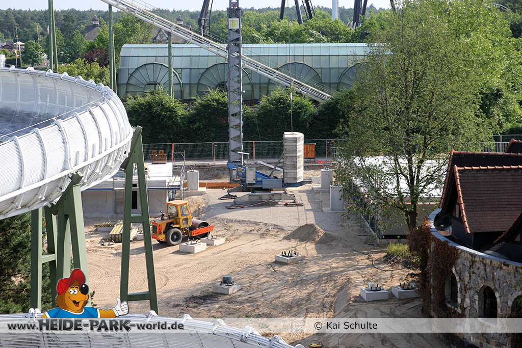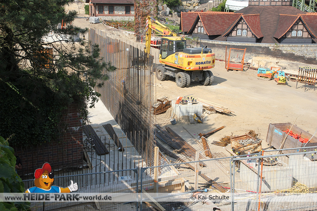 12./14. Juli 2014 - Auch in dieser Woche wurde auf der Baustelle zur neuen Attraktion 2014 gearbeitet. Auf den ersten Blick fallen neue Stahlstangen auf, die parallel zum Weg zu Scream verlaufen. Des weiteren fanden wieder Arbeiten an den Fundamenten statt, die später die Stützen tragen.