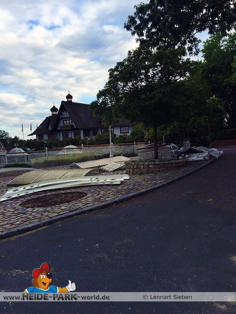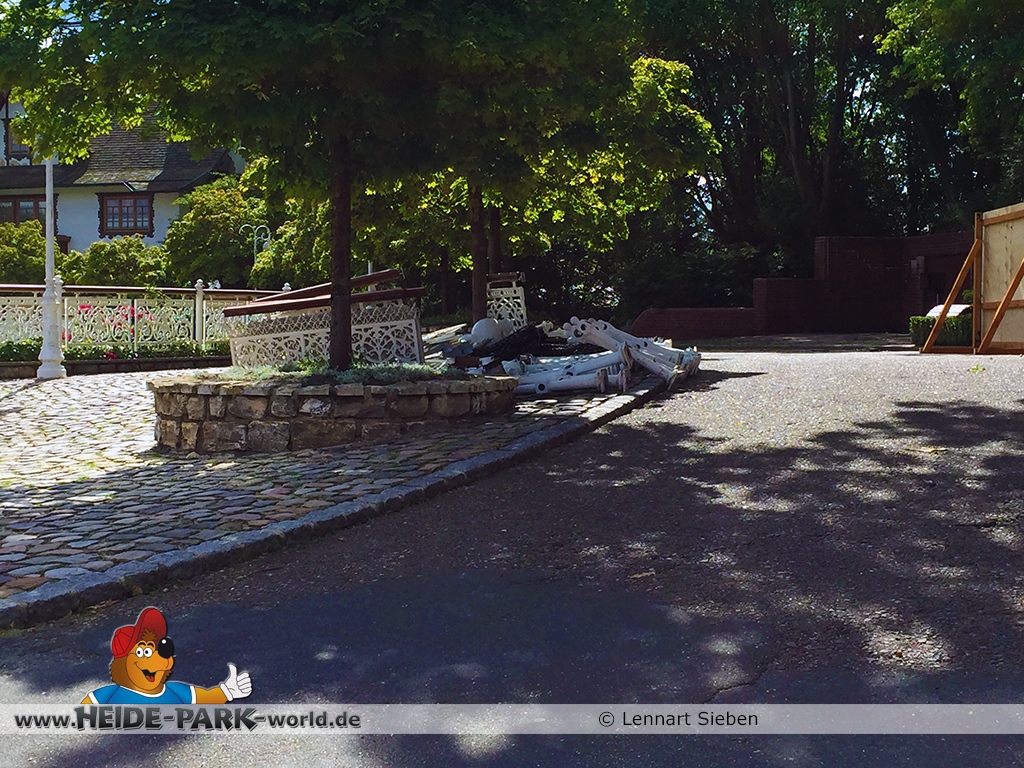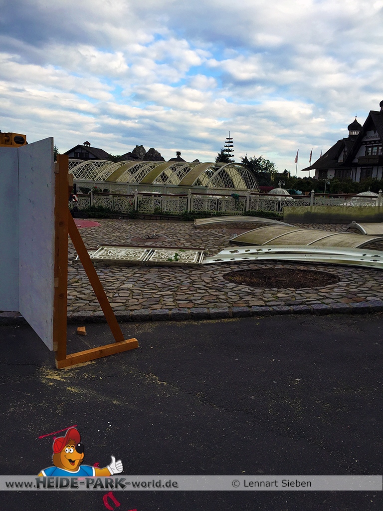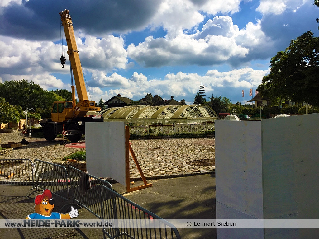02. September 2015 - Der Rückbau der Märchenfahrt Station geht mit großen Schritten voran. Ein Kran hat heute die Dachelemente der Station entfernt. Ringsrum um den gesamten Komplex entsteht ein großer Bauzaun. Die Spannung steigt!