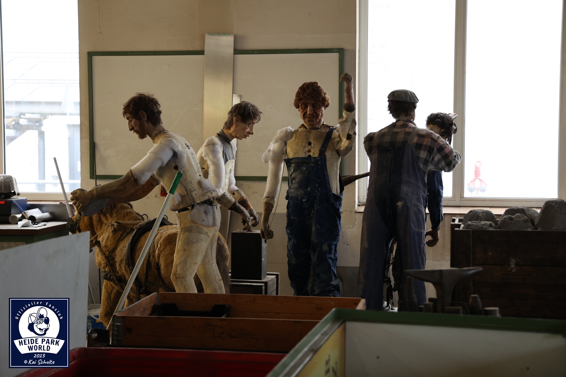 Im Atelier werden u.a. alle Verschönerungen für den Park vorbereitet, Schilder gestaltet und Figuren wieder frisch hergerichtet. Direkt in den Fokus der begeisterten Fans fielen die Animatronics aus der Wildwasserbahn II. Mit einem strahlenden Lächeln auf den Lippen wurde verkündet, dass man diese in der kommenden Saison an anderer Stelle des Parks wiederfinden wird.