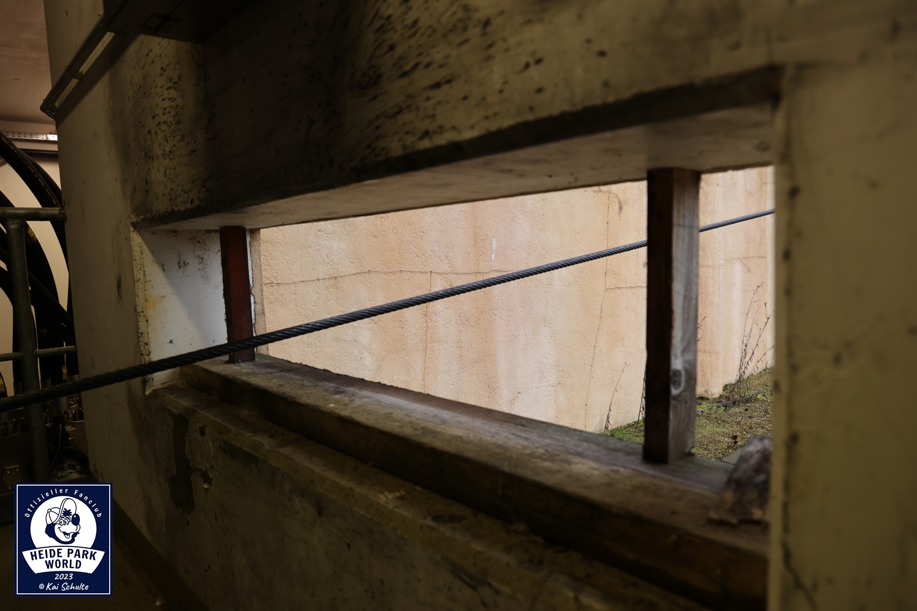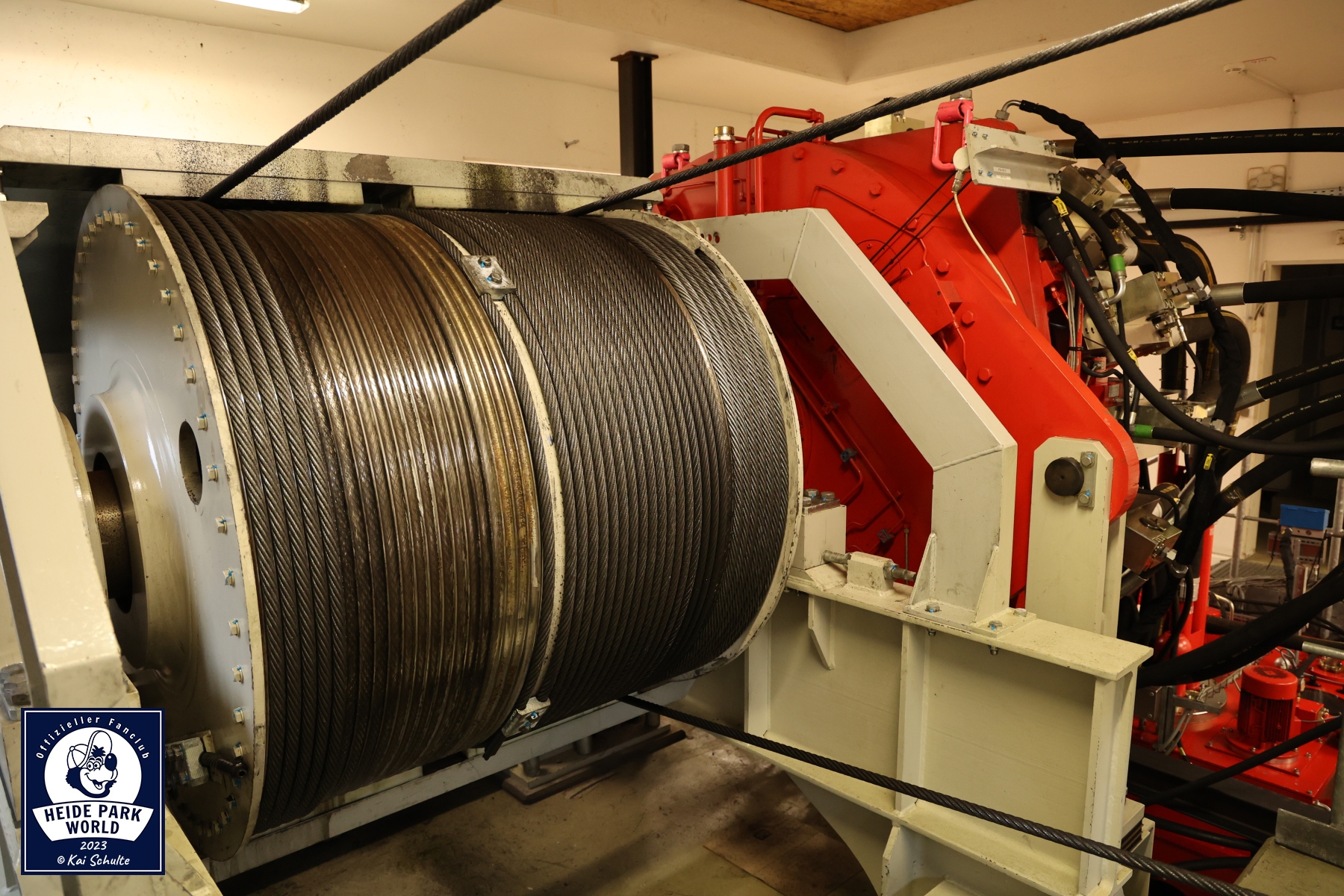 Weiter ging es in die Wüste der Lüneburger Heide. Genauer gesagt zu Desert Race. Das erste Ziel befand sich in der letzten Kurve des Coasters - die Wartungshalle. Dort konnte ein neugieriger Blick auf und unter den blauen Zug geworfen werden, welcher sich aktuell in den letzten Zügen der Prüfung befand. Unterhalb der Station und der Strecke ging es nun in den Innenbereich. Dort wurde uns ein spannender Einblick in den Hydraulikraum gewährt. Zwischen den meterhohen Tanks konnte auch das Seil des Catchcars bestaunt werden, dessen Wendepunkt sich mit im Gebäude befindet. Während der laufenden Saison ist ein Einblick aus Sicherheitsgründen leider nicht möglich. Marcel erklärte sehr ausführlich, wie Desert Race und der Abschuss funktionieren. Über den Catwalk entlang der Launch-Strecke ging es zurück in die Station, wo ein spannender Blick auf das Catchcar gewährt wurde.