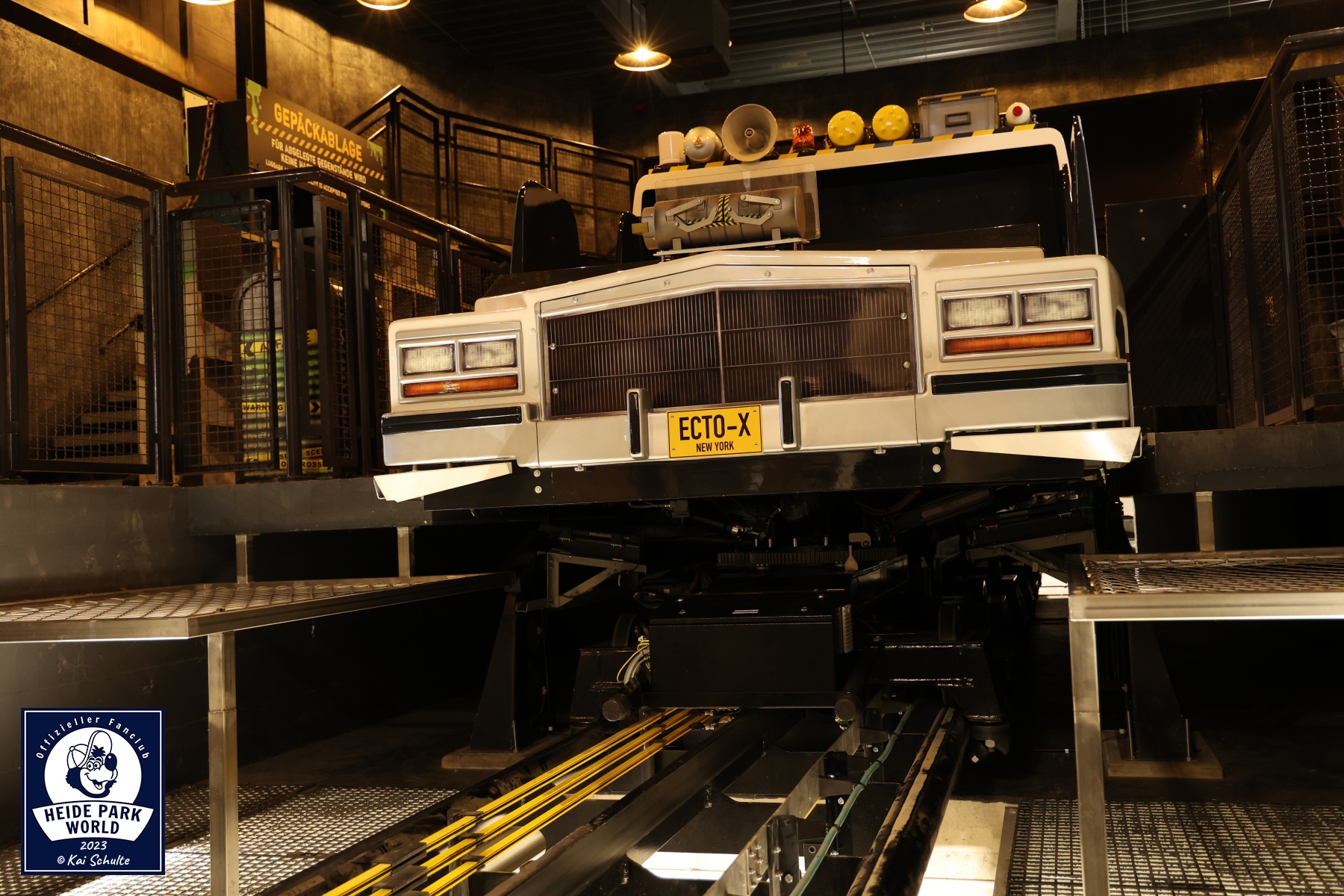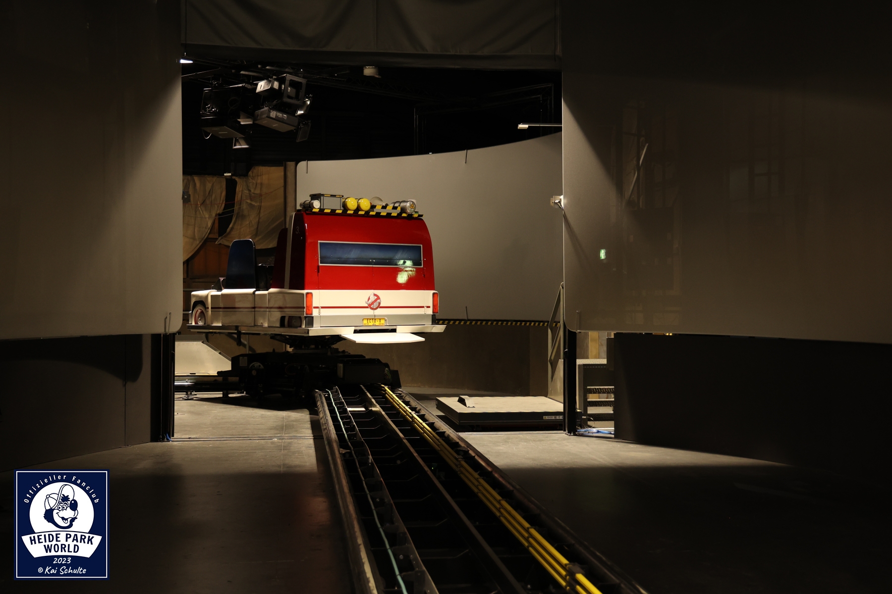 Die Reise ging weiter in Richtung Ghostbusters 5D. Den ersten exklusiven Einblick gab es in den "Waschraum" - also dort, wo die tausenden 3D Brillen täglich mehrfach für die Gäste gereinigt werden. Über einen Einstieg in der Station begann unsere weitere Reise entlang der Strecke. Hier konnte einmal aus der Nähe der QR Code bestaunt werden, welcher dem Computer meldet, wo im Streckenverlauf sich die Fahrzeuge befinden. Aufmerksame Fans konnten zudem versteckte Eastereggs in den Dekoelemten entdecken. Apropos Fahrzeug - mitten auf der Strecke befand sich eines der insgesamt neun Fahrzeuge und wurde gerade auf die Saison vorbereitet. Mit ausreichendem Sicherheitsabstand wurde uns gezeigt, wie dieses per Hand gesteuert werden kann.