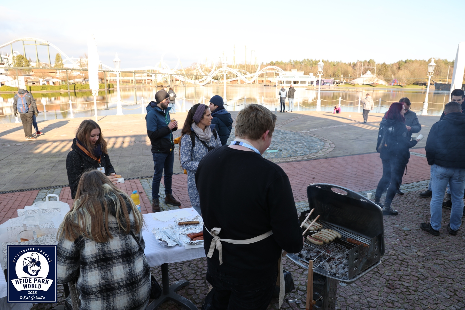 Wieder aufgewärmt ging es durch Obscuria weiter in den vorderen Parkteil, wo ein verlassener Eingangsbereich und ohne die fröhliche Musik die Teilnehmer*innen begrüßte, bevor die Reise weiter in Richtung Terrasse vom Mamma Rosas Pizza & Pasta ging. Dort haben wir für die Fans zur Stärkung fleißig gegrillt und Getränke zum Aufwärmen bereitgestellt. Bei einem leckeren Würstchen und Kinderpunsch oder Glühwein kam es zu spannenden Gesprächen unter den Teilnehmer*innen, bevor die Fantreffen sich langsam dem Ende neigten und alle gemeinsam über den Betriebshof den Park verließen.