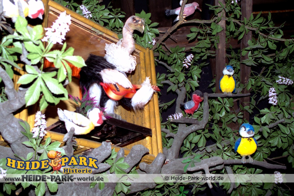 Wumbo, das lebenslustige Wappentier des Heide-Parks, war der Showmaster, seine Stars waren die Vögel. Galius-Gänsegeier zum Beispiel, ein berühmt-berüchtigter Westernheld. Rabe, Storch und Papagei konnten den Schnabel nicht halten und klopften freche Sprüche. Hein-Schnucke schmetterte bekannte Volkslieder, Frösche spielten Instrumente und Bäume sangen.