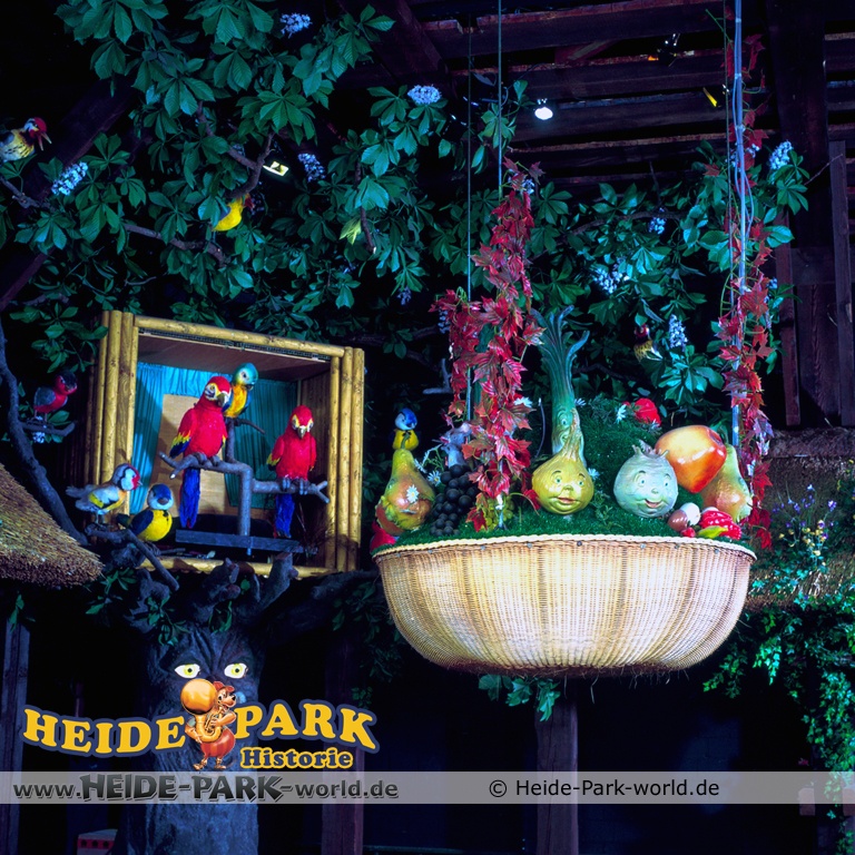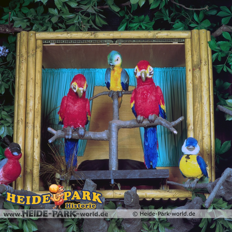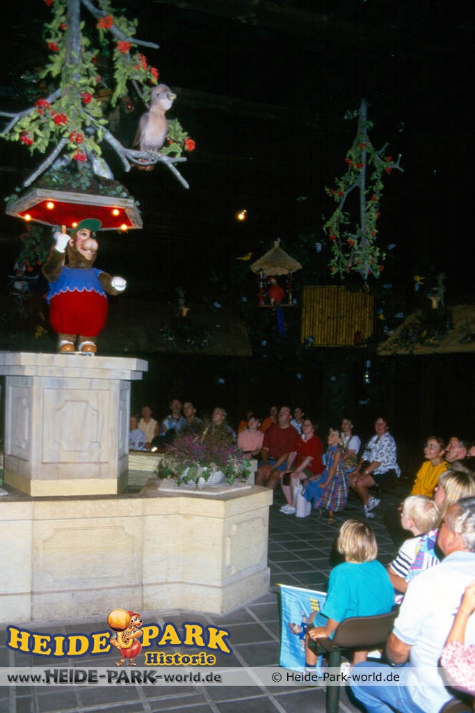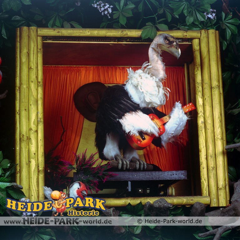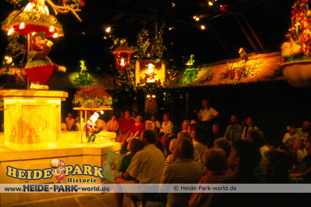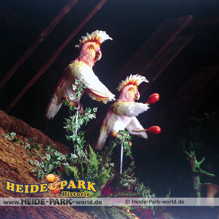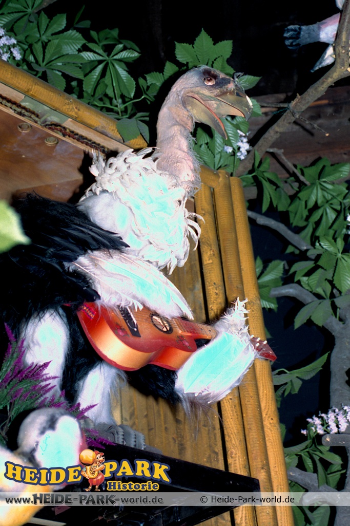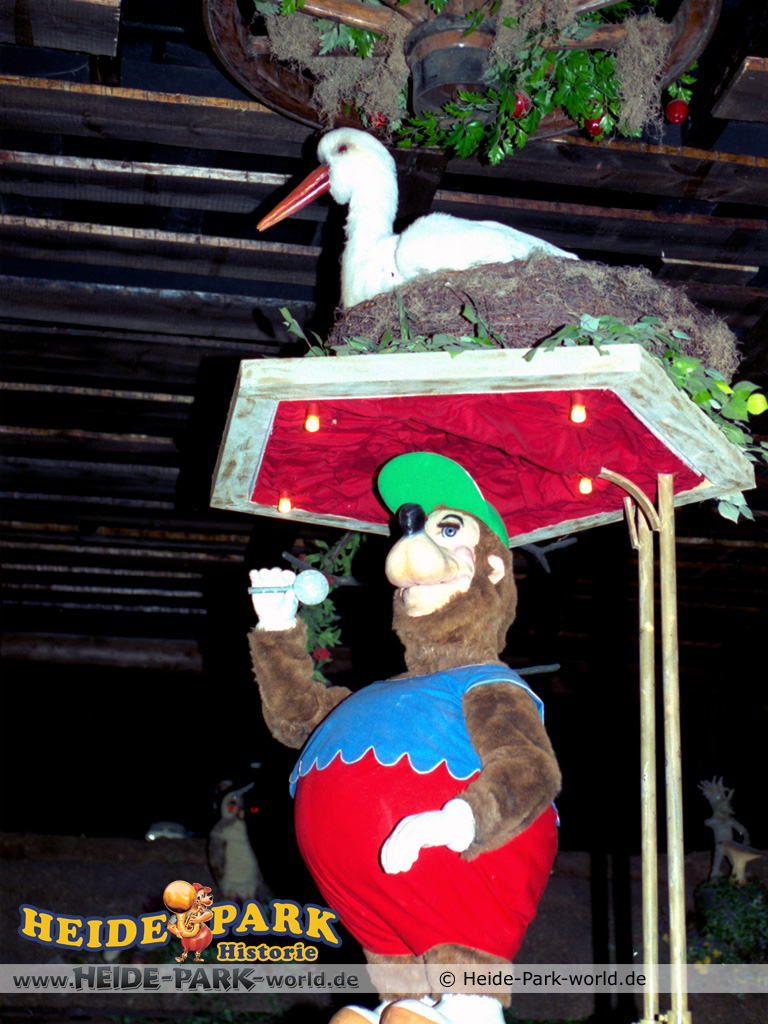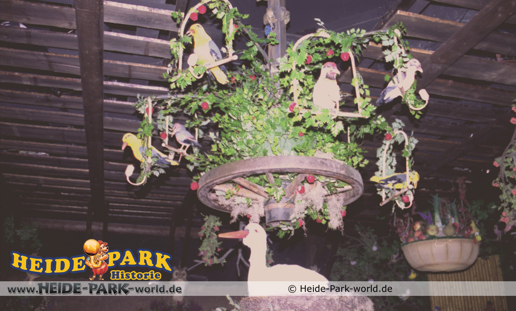 Wumbo, das lebenslustige Wappentier des Heide-Parks, war der Showmaster, seine Stars waren die Vögel. Galius-Gänsegeier zum Beispiel, ein berühmt-berüchtigter Westernheld. Rabe, Storch und Papagei konnten den Schnabel nicht halten und klopfen freche Sprüche. Hein-Schnucke schmetterte bekannte Volkslieder, Frösche spielten Instrumente und Bäume sangen. Am Ende der Saison 2009 wurde die Show im Elektronischen Vogeltheater nach über 20 Jahren Spielzeit eingestellt. Hier findet ihr einige Bilder aus dem Inneren des Vogeltheaters, welche sicherlich viele Kindheitserinnerungen wecken werden