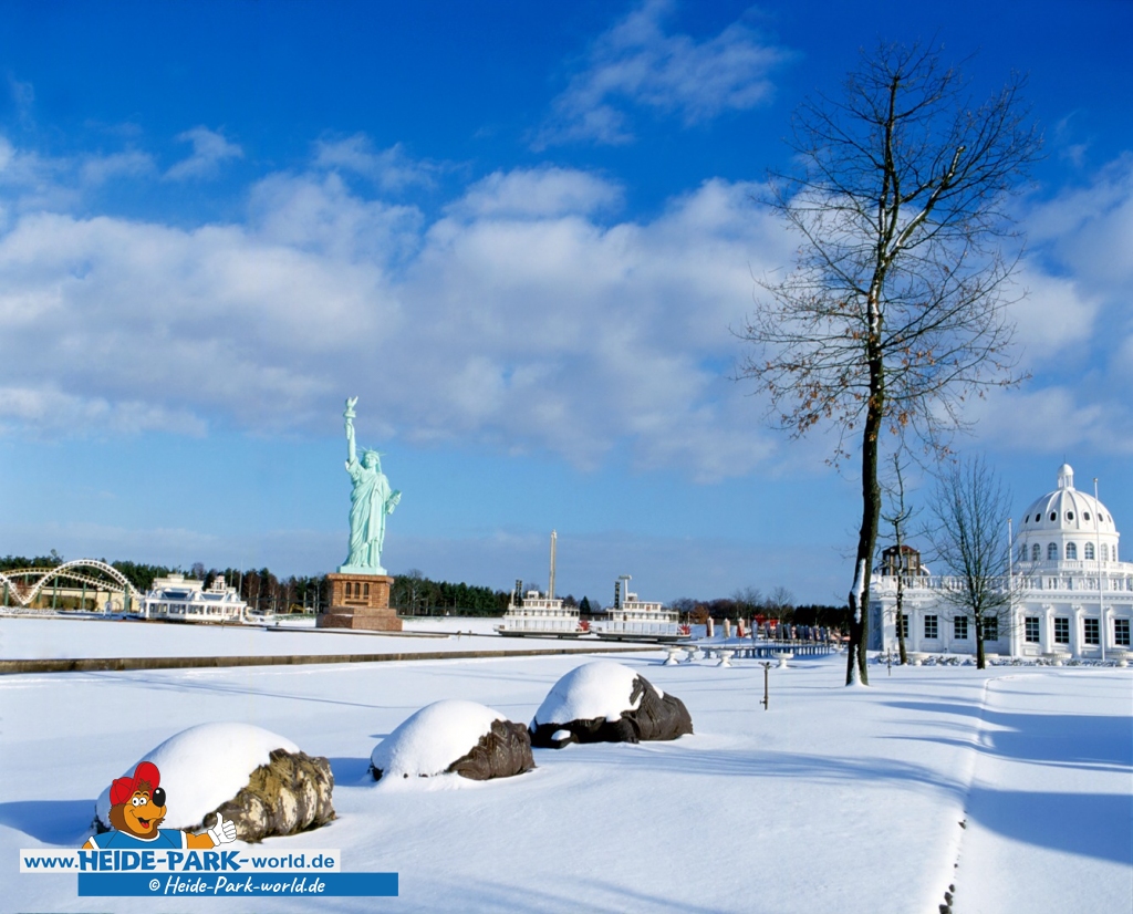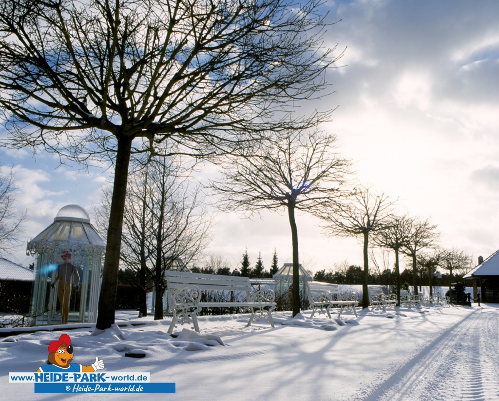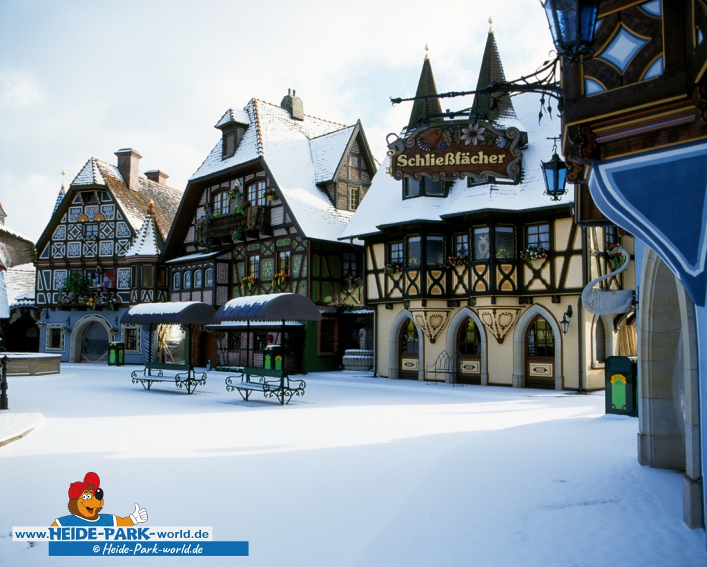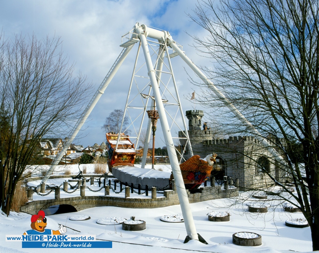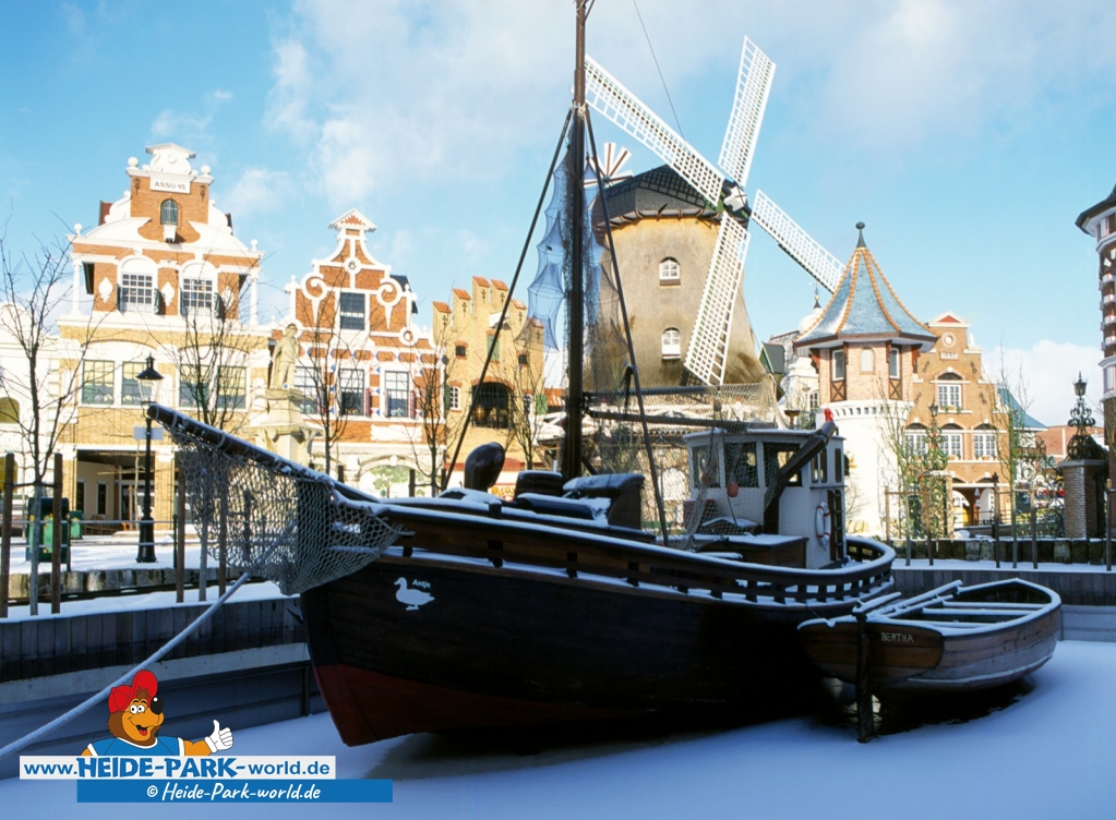 Es war das Jahr der Fertigstellung des Holland Dorfes mit der Grachtenfahrt und dem Bau des Nostalgiekarussells im Eingangsbereich. Eine dichte Schneedecke hat den Heide Park bei unserem Spaziergang im Winter 1997 / 1998 bedeckt. Bei unserer kleinen Tour durch den Park kommen wir am großen See mit der Freiheitstatue und den Mississippi Dampfern vorbei. Im Holland Dorf liegt der Kutter "Antje" vor Anker. Die bunten Clowns und Puppen der Kinderlok "Old 99" halten in ihren gläsernen Behausungen Winterschlaf. Gleich nebenan steht die gut verpackte Schiffschaukel "Santa Maria". Das Heide-Dorf mit seinen dekorativen Häusern liegt wie ein verschlafenes Heide-Örtchen da und lädt zum Schlendern ein.