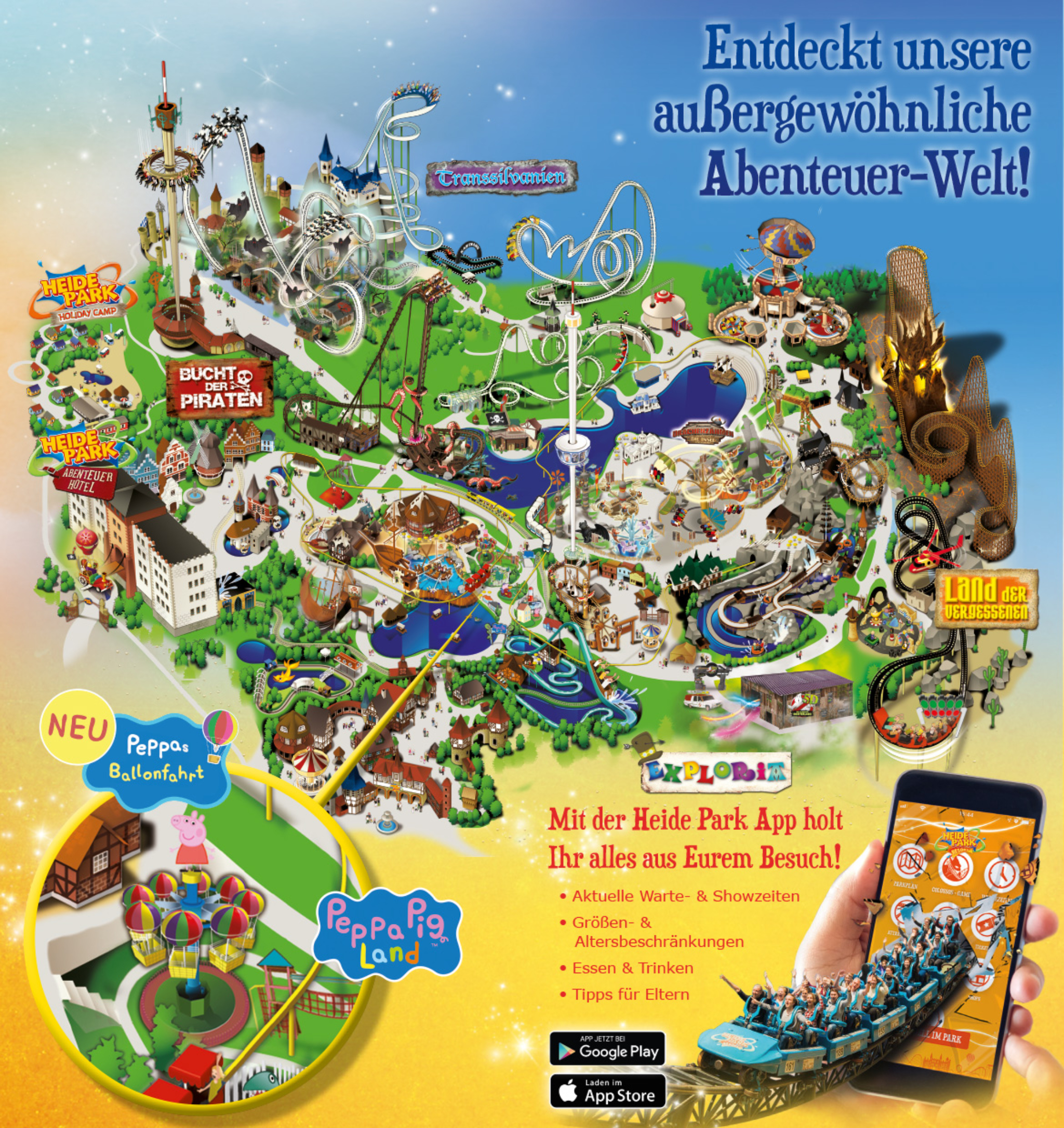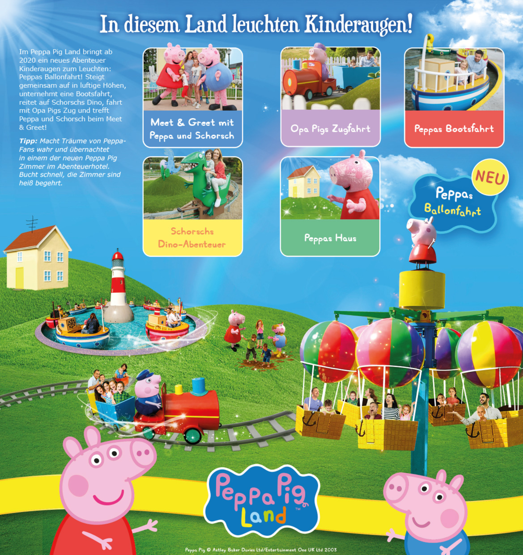 Auch ein kleiner Lageplan ist im neuen Flyer enthalten. Besonders hervorgehoben ist in diesem Jahr "Peppas Ballonfahrt", welche das Peppa Pig Land ab 2020 bereichert.