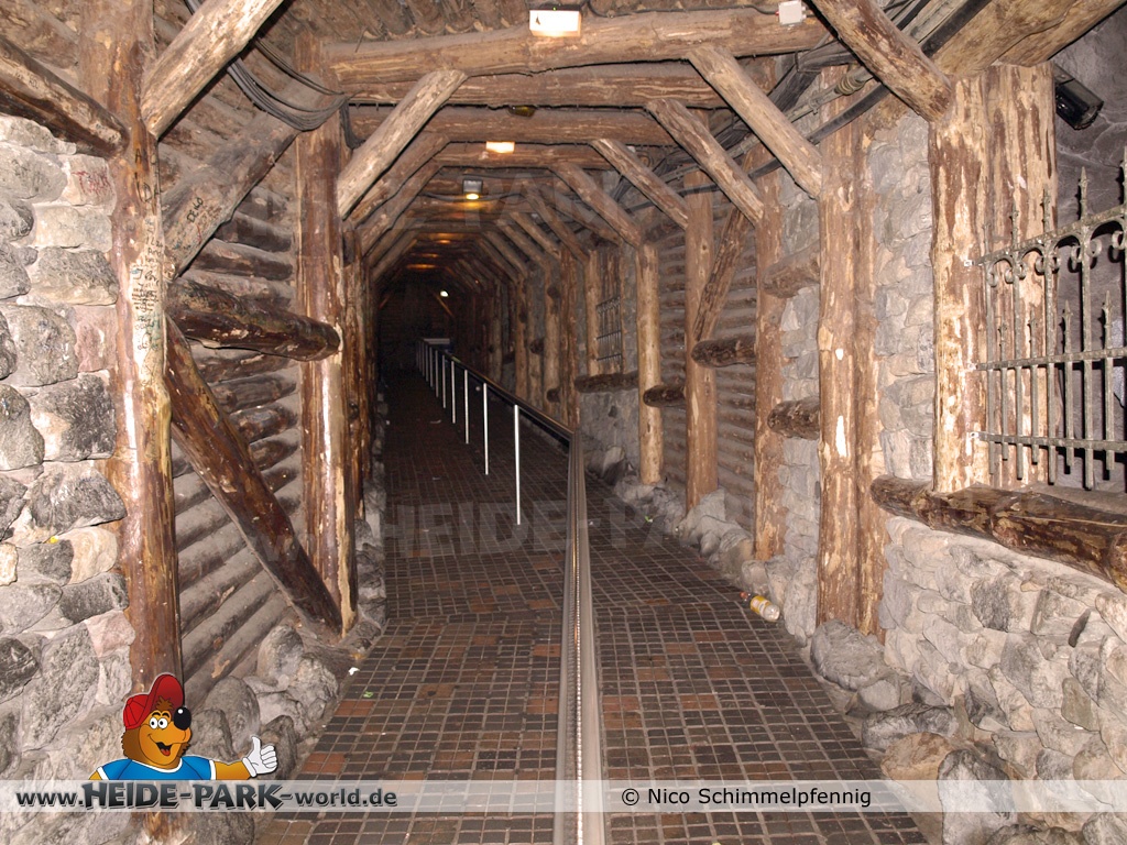 Um mit der Wildwasserbahn fahren zu können, mussten die Besucher den Hauptweg verlassen. Mit dem Betreten der Warteschlange, welche mit schönen Bildern und alten Werkzeugen ausgeschmückt war, wurde man in die Welt unter Tage versetzt. Am Ende des Eingangbereichs ging es in das nachgebildete Innere eines Stollens. Früher trafen hier zwei Warteschlangen zusammen, wovon eine jedoch schon vor längerer Zeit geschlossen wurde.
