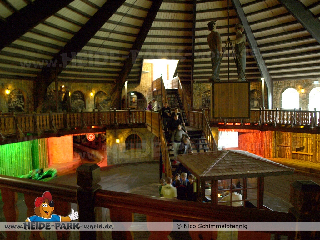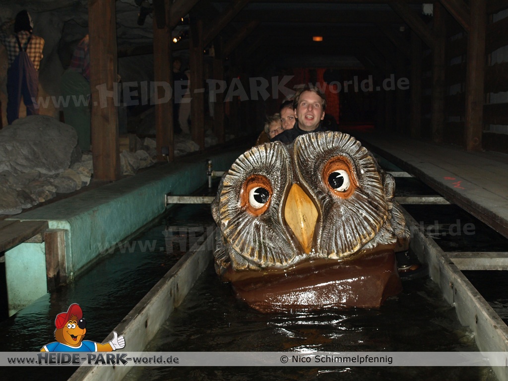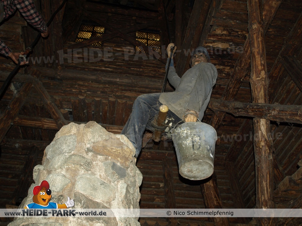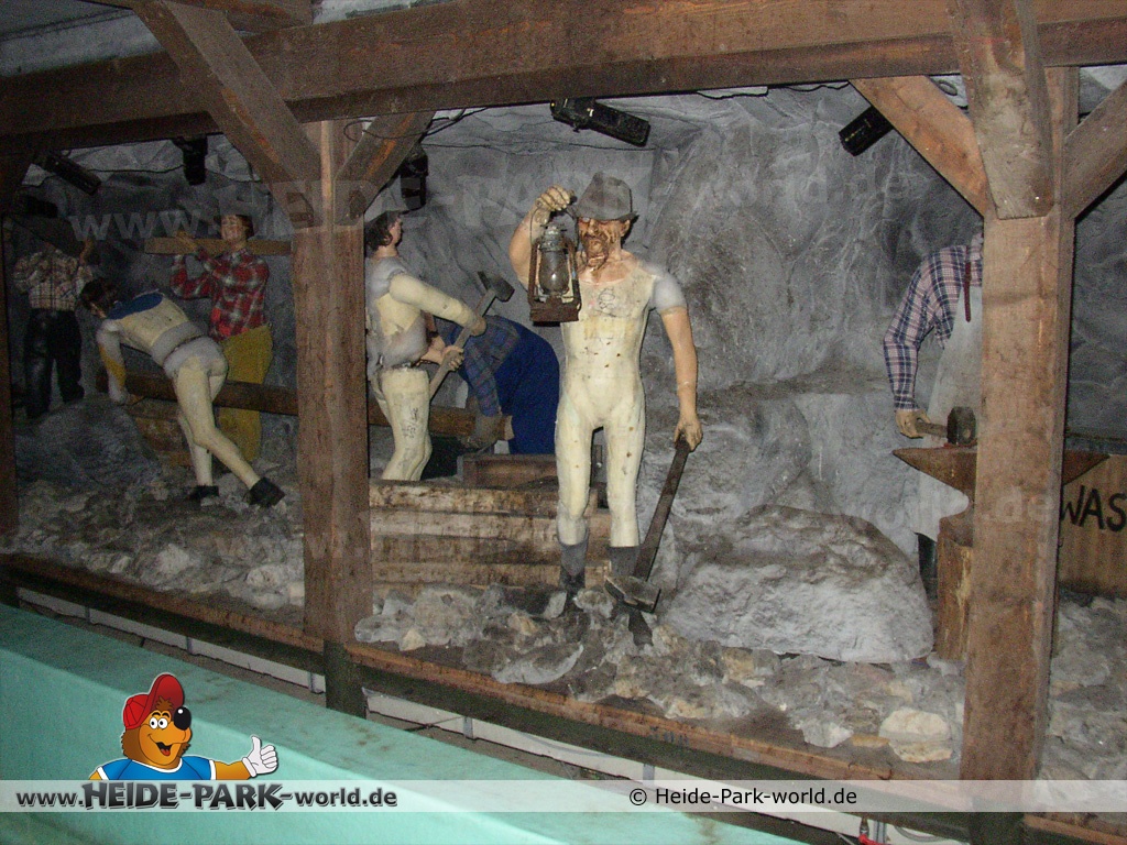 Die eigentliche Fahrt mit der Wildwasserbahn begann unter Tage. Vorbei ging es an fleißigen und hart arbeitenden Bergarbeitern. Es folgte die 63 Meter lange Liftauffahrt, welche in einer Hexenküche endete. Weiter ging es, vorbei an Burgruinen und verschiedenen Figuren, wie einem Kutscher mit seinen Pferden.